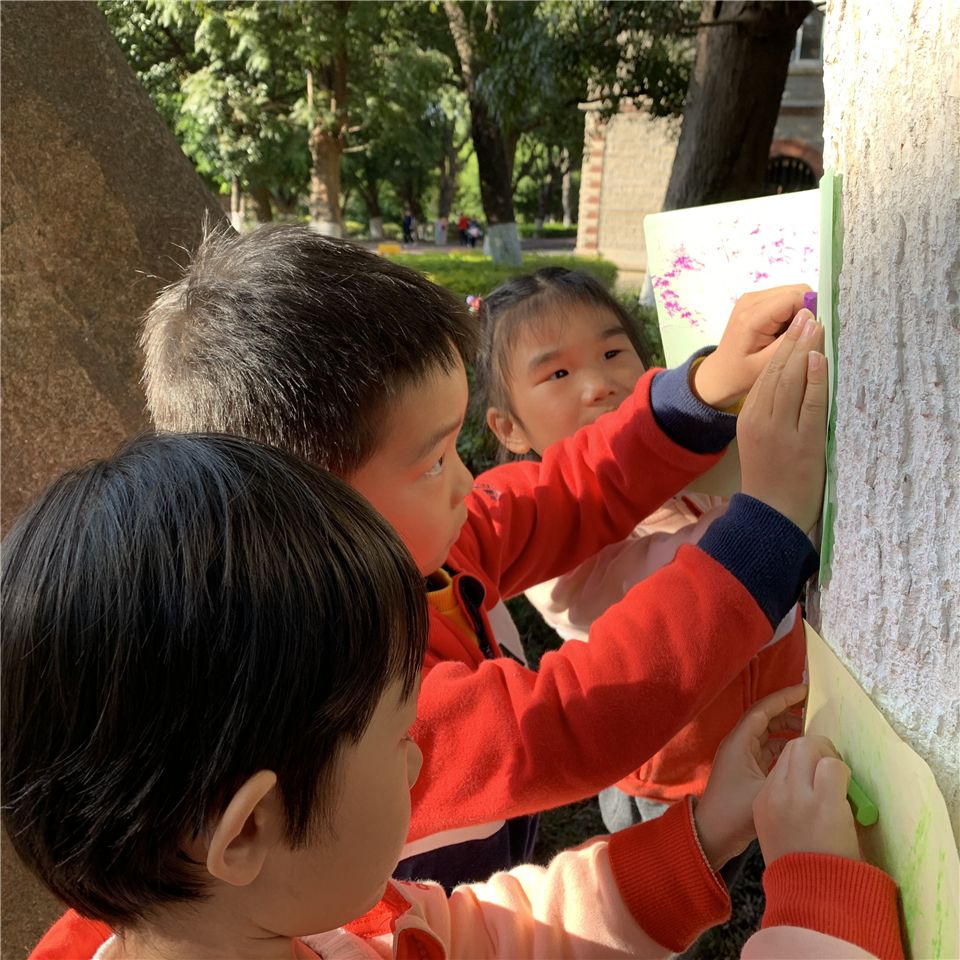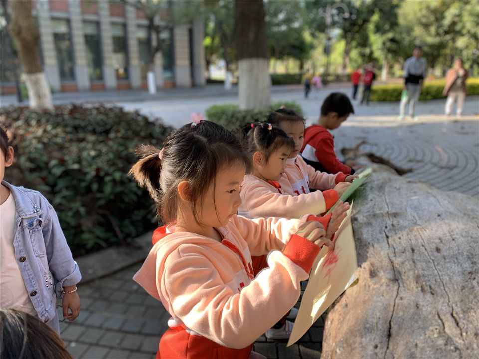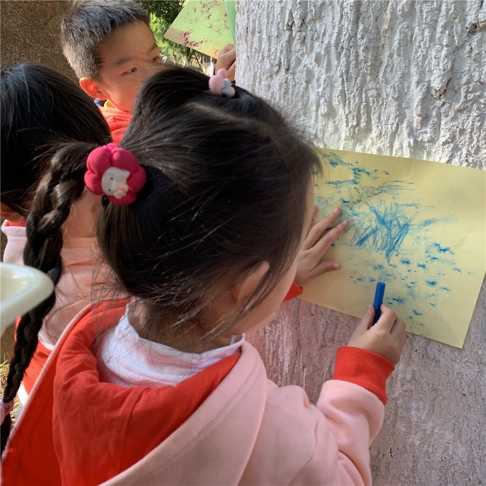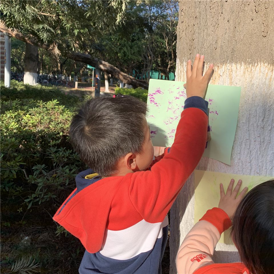 老师引导幼儿用拓印的方法,更直观的看到每棵树树皮的纹路到底一不一样,这不小朋友们带着画笔和画纸,来到芙蓉湖边找到不同的大树,开始“画了”起来。