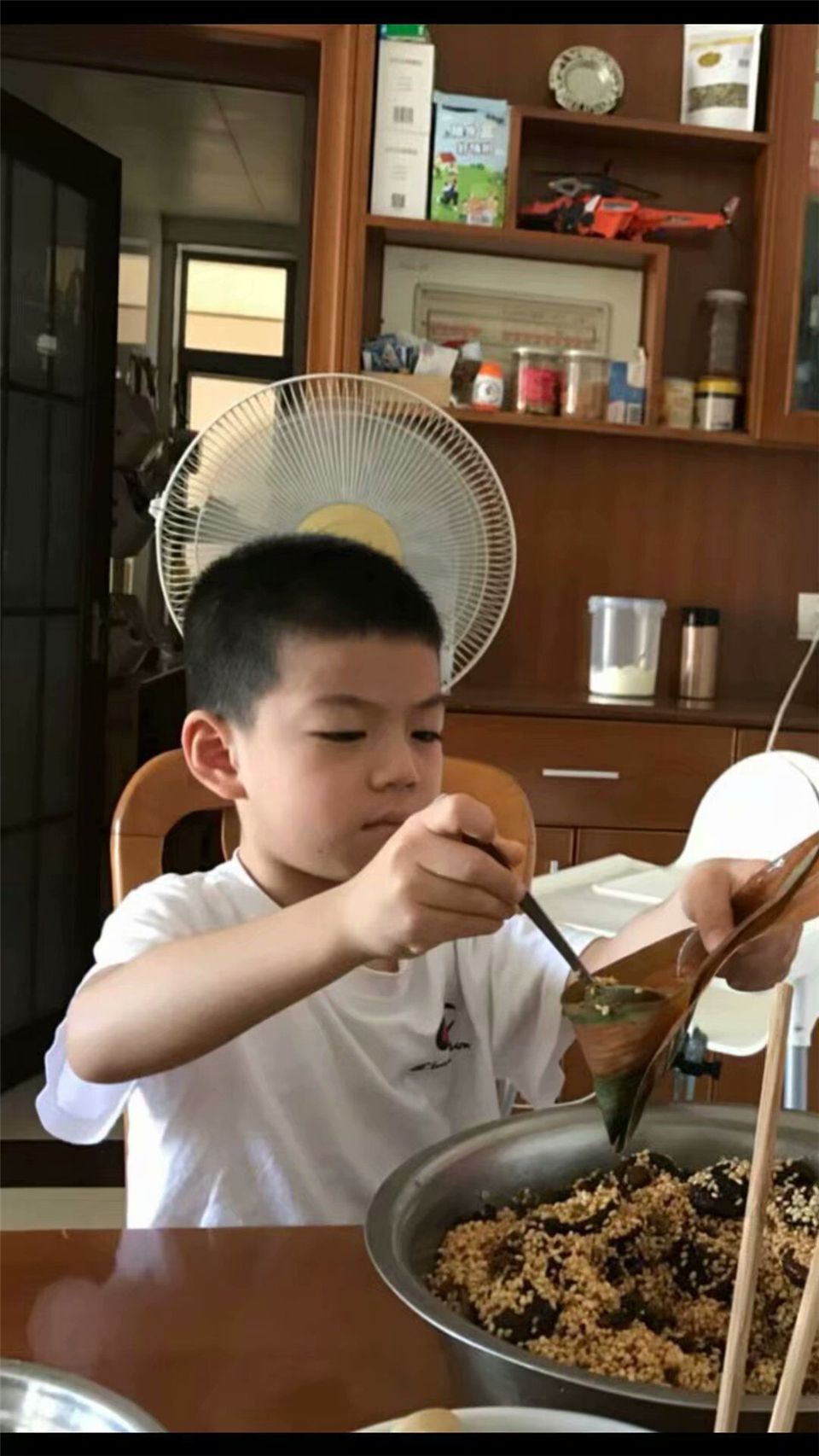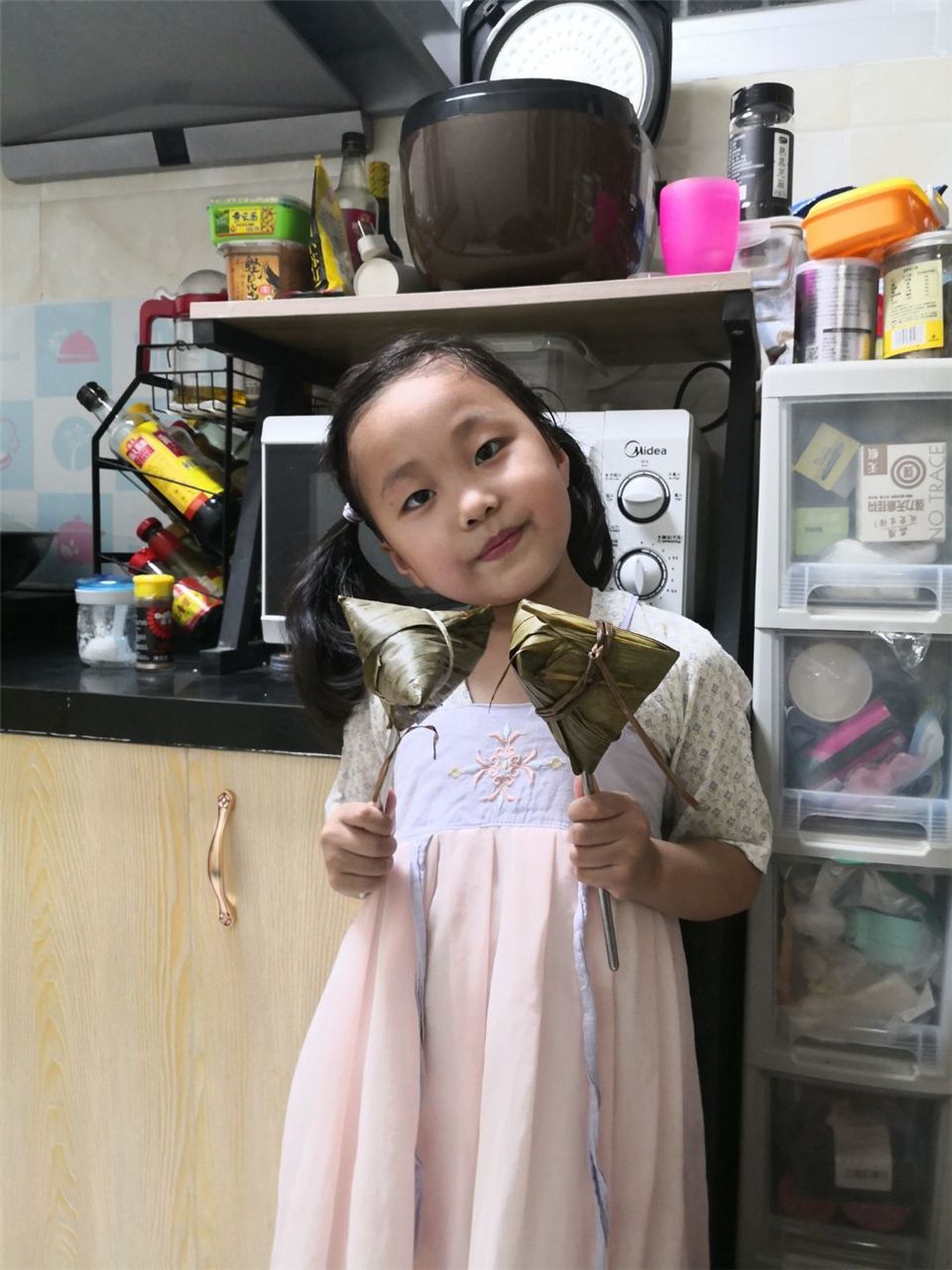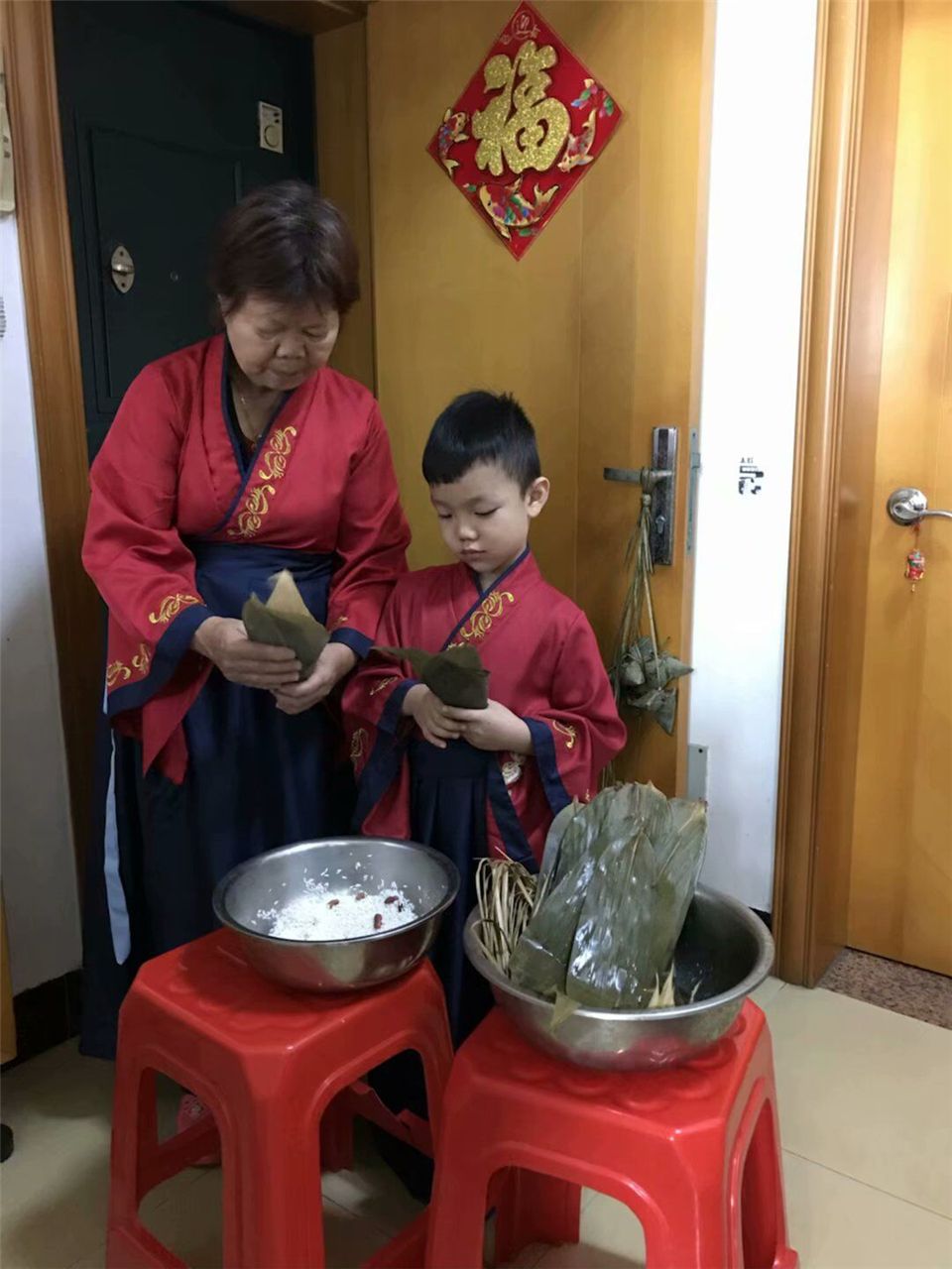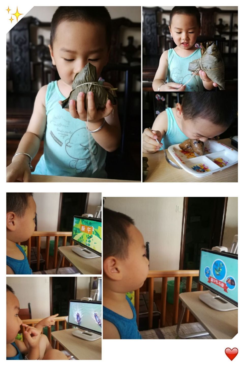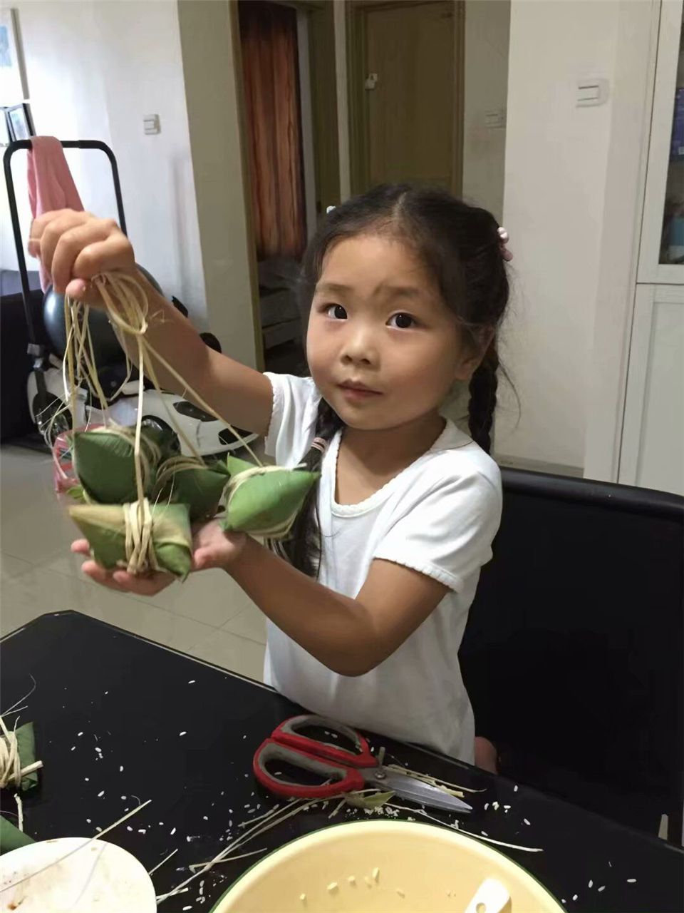 包粽子、吃粽子是端午节的传统活动。瞧,在家人的陪伴下,孩子们有的穿上传统汉服,尝试用粽叶和糯米等食材包粽子,用马莲绕紧粽子,体验了包粽子的乐趣,同时,营造了浓浓的节日氛围。