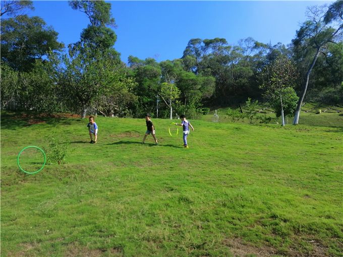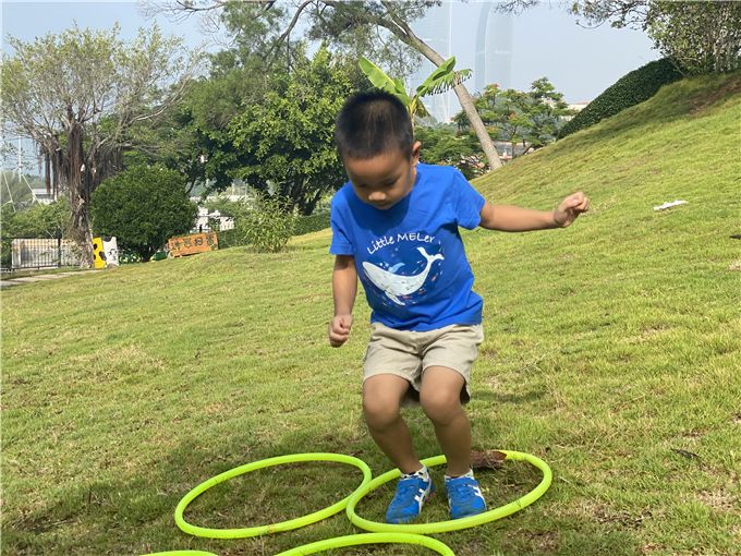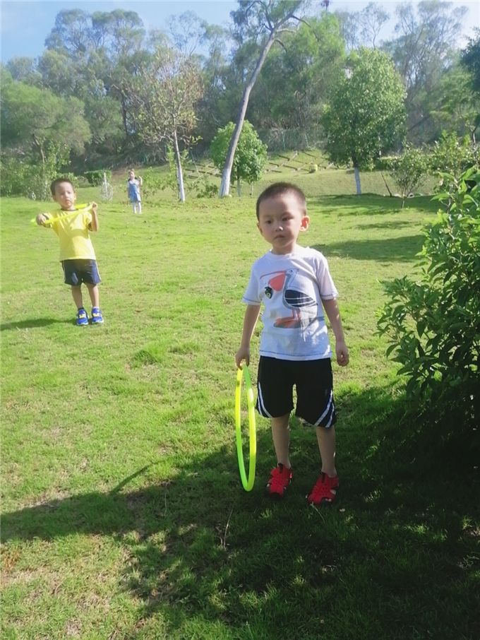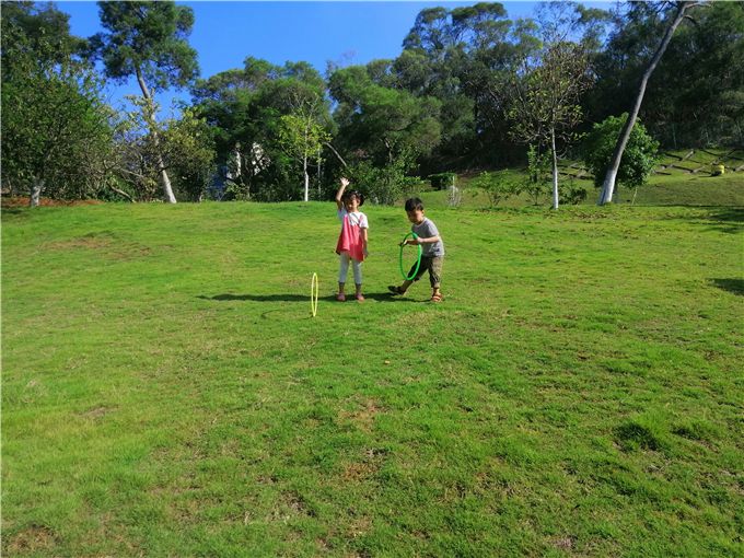 地上小草如茵,踩在上面软软的,借助着山坡的地势,几个小朋友们玩起了滚圈圈的游戏,他们在比赛谁的圆圈滚得最远。还有的小朋友把圆圈摆在草地上,玩起跳圆圈的游戏。