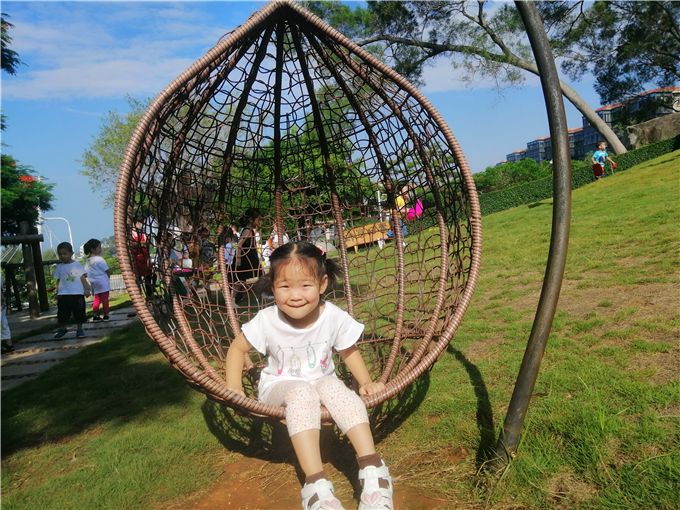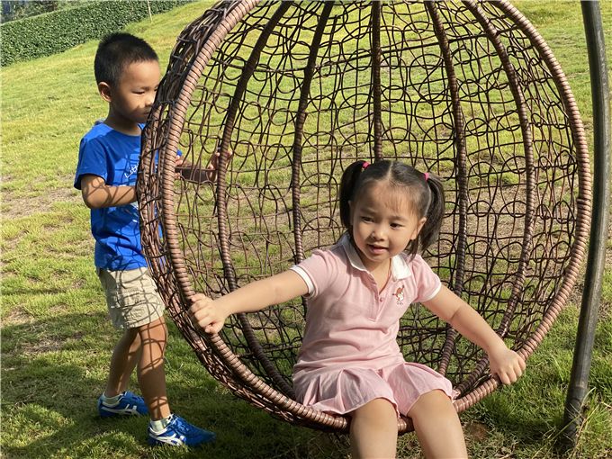 暖心的宸哥哥小心地推着秋千椅,秋千椅一前一后地摇摆着,坐在上面的可可好惬意。