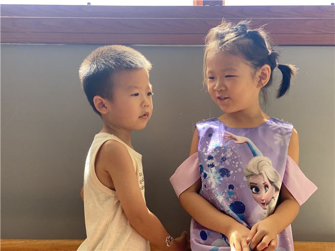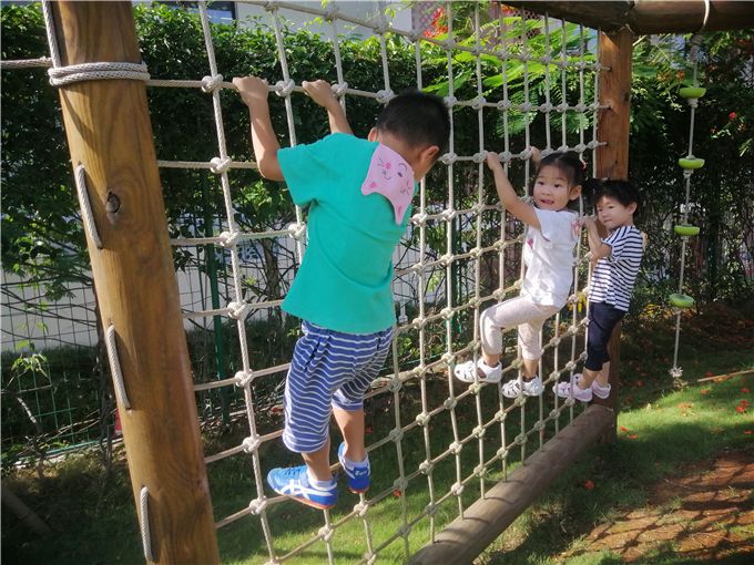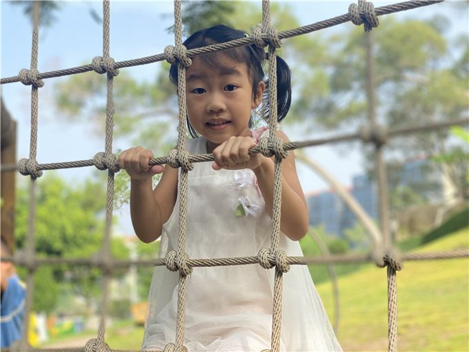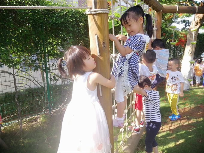 在方块区域玩耍的嘟嘟在攀爬中也不忘提醒一旁的宸宸:“你要抓牢,不要掉下来啦。”