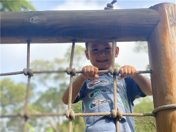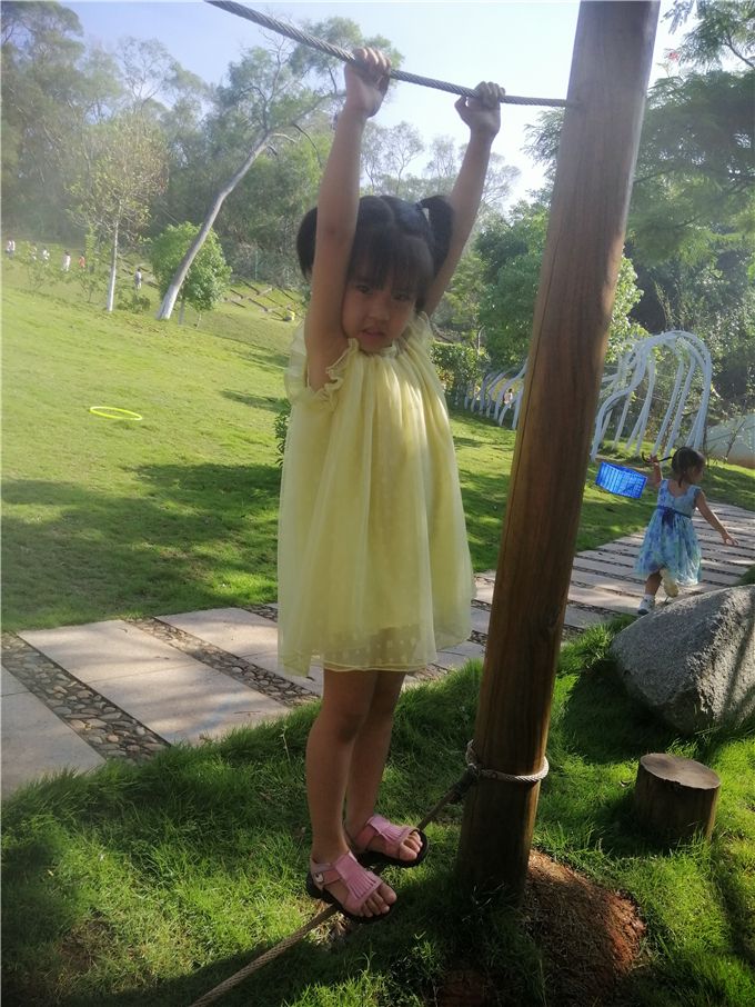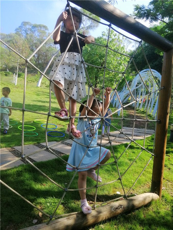 成成哥哥站立在绳桥上身体往后仰着调皮地来回摇晃着绳索,引起大家的一片惊叫,哈哈哈,真是太好玩啦!