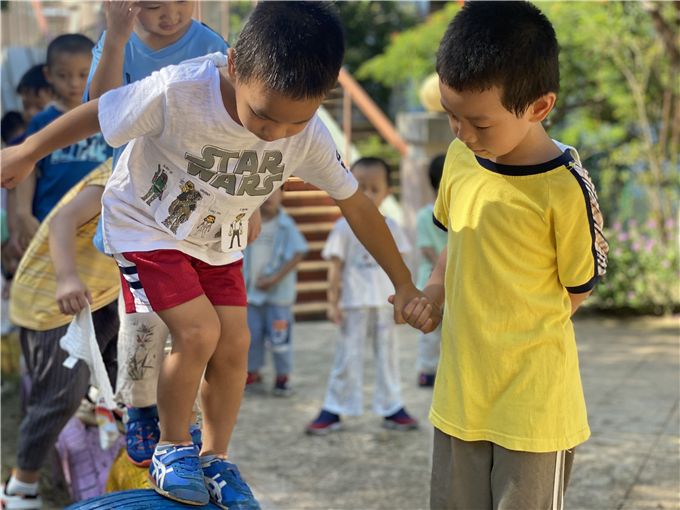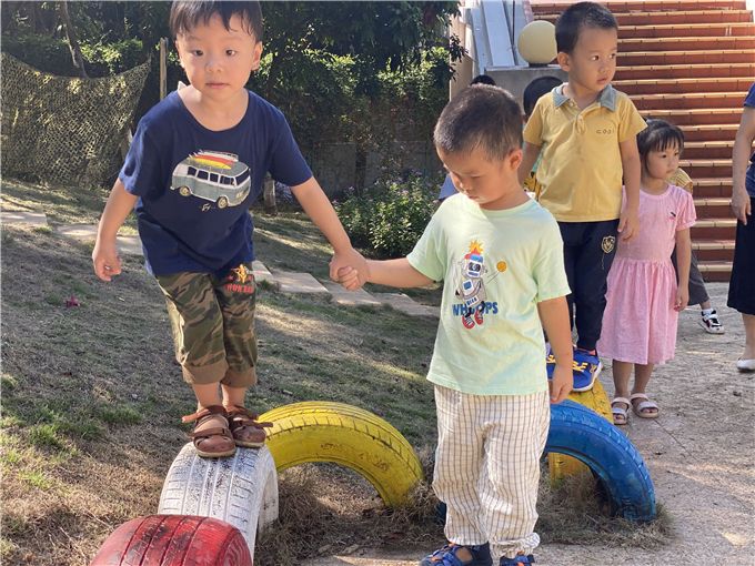 草地上站立着、横躺着的轮胎可以怎么玩呢?“它们就像轮胎桥呀”“窄窄的,我觉得应该叫独木桥吧”“这是沙发轮胎,有点像家里软软的沙发”“你看,你看,我敢站在上面呢”“要小心,会掉下来的”在孩子们你一言我一语的对话中,他们就已经开始捣鼓着要怎么玩这个玩意了。