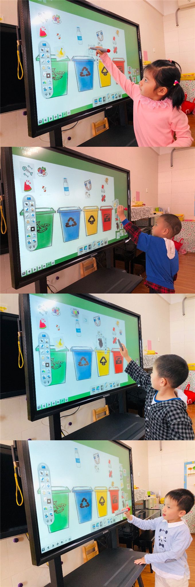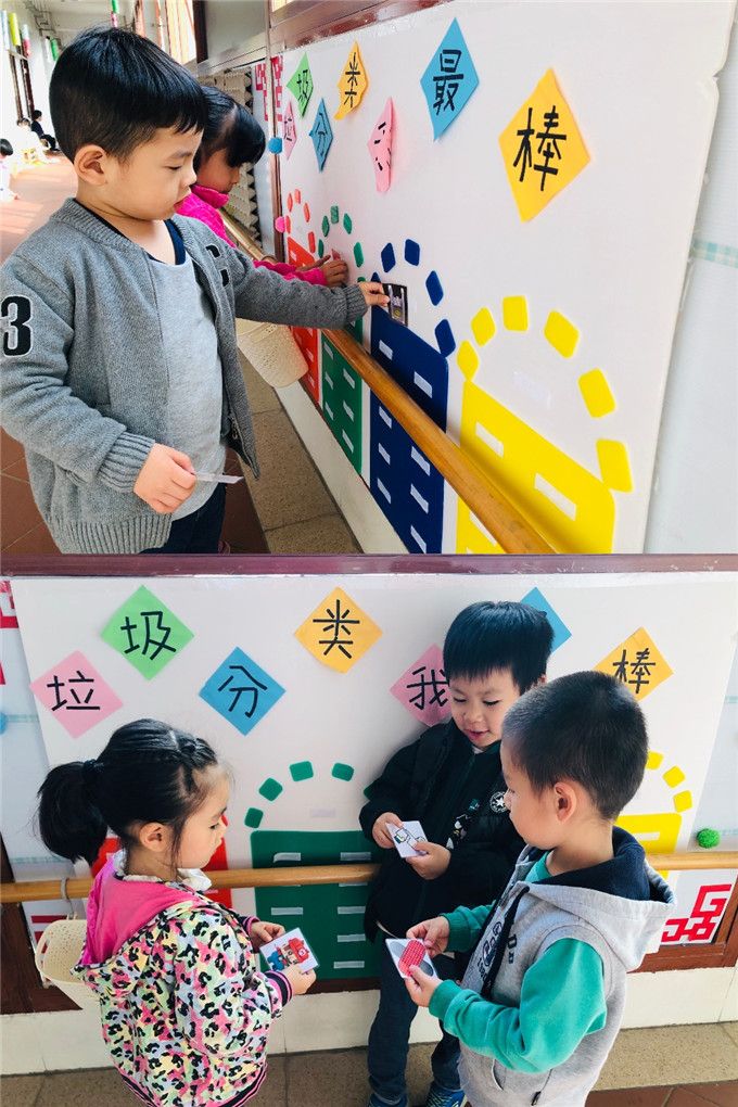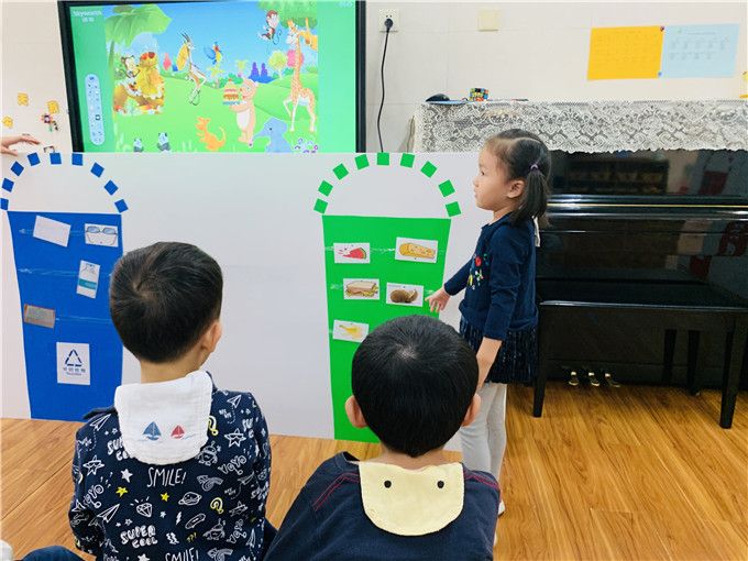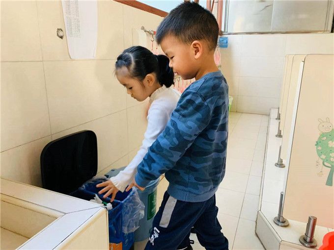 “沫伊沫伊,你知道这个塑料盖子要扔在什么垃圾桶里吗?”“应该是可回收垃圾吧!”“不对,我觉得应该是扔其他垃圾桶里。”