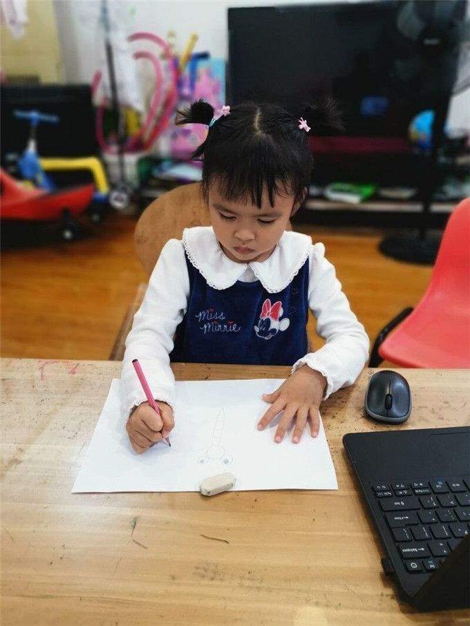 “我先画个绿草地吧,蜻蜓它飞累了就可以在草地上休息了。”