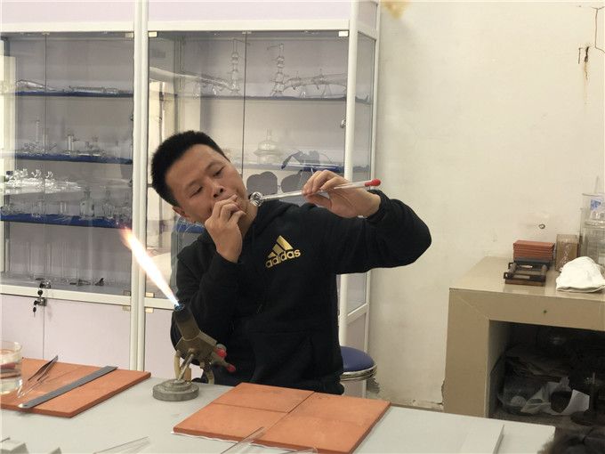 瞧,叔叔要变魔术啦。打开铜制玻璃灯头,用氢气+氧气烧出了氢氧焰。叔叔拿一根玻璃管在火焰上一烧一拉,试管做好了。把玻璃烧软再吹一吹,叔叔做了一个球形试管。