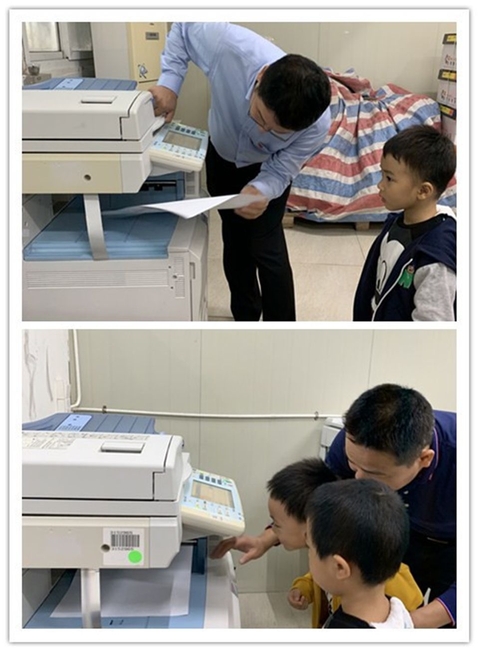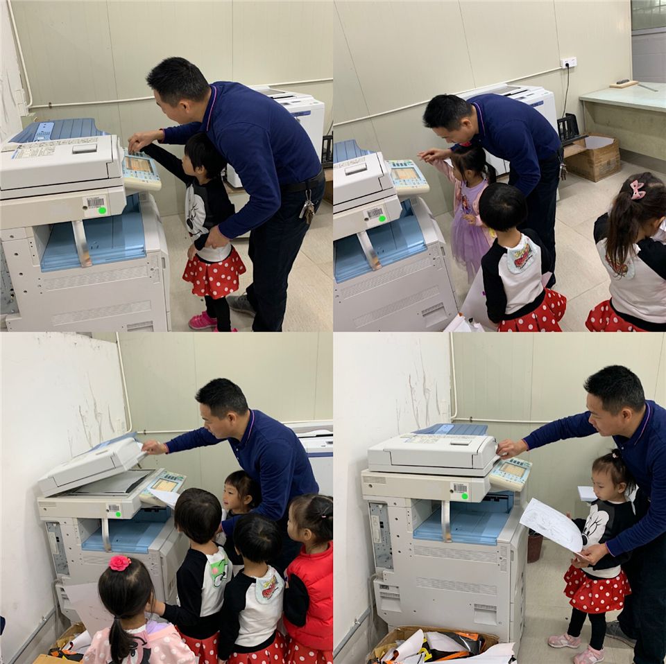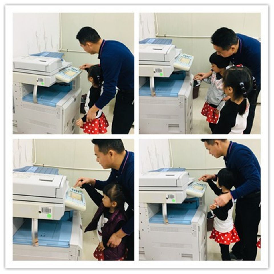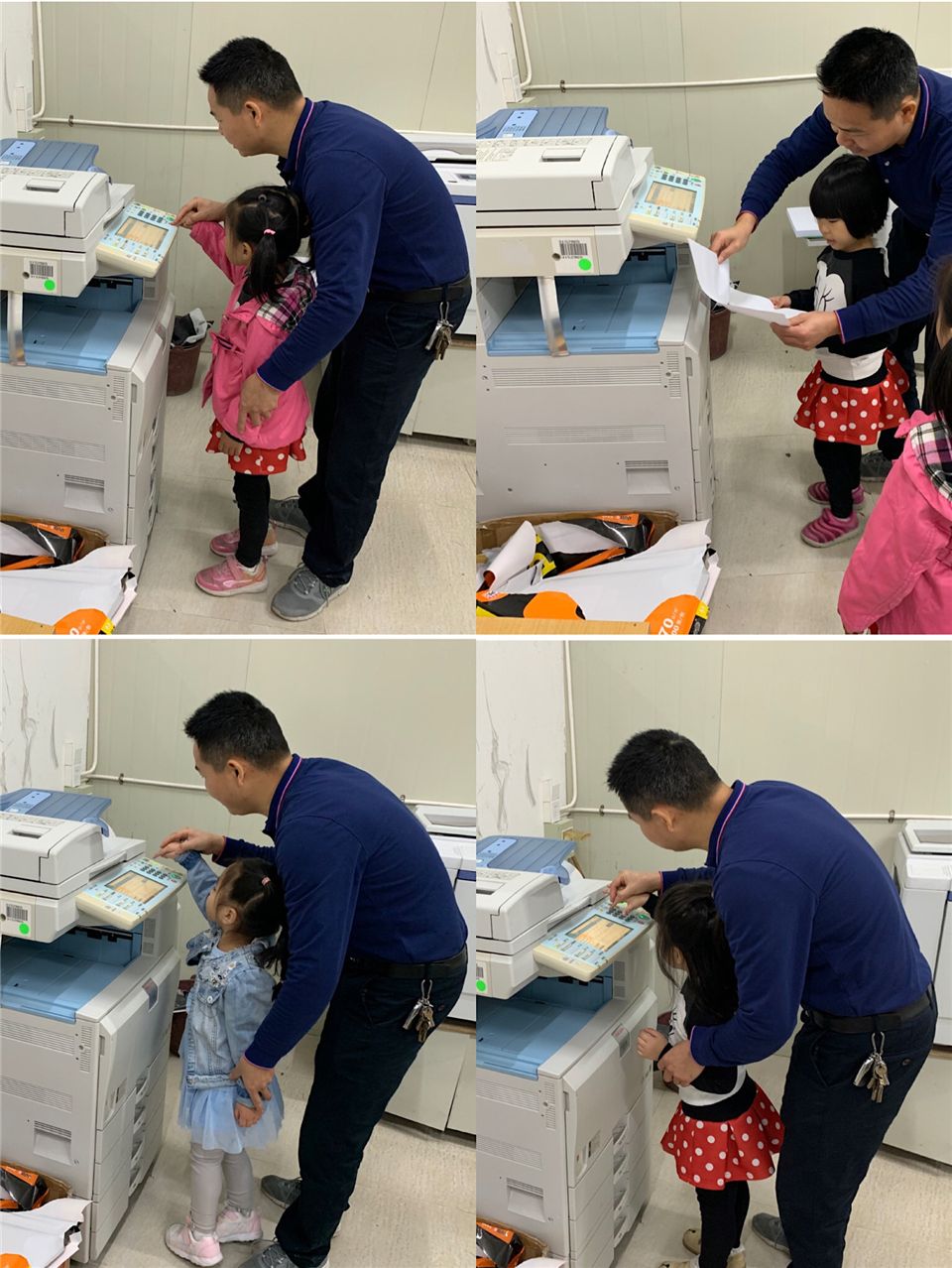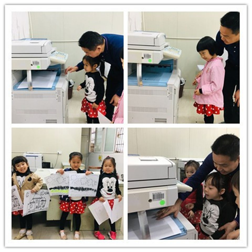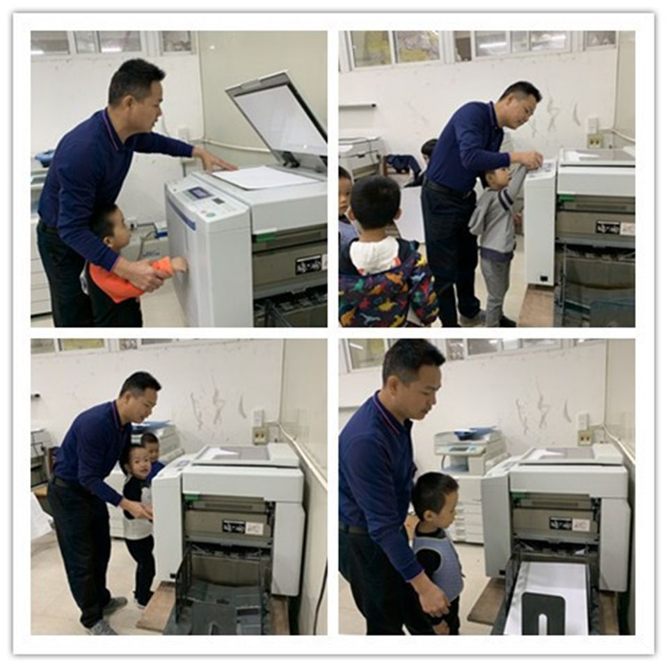 作品都画好啦,见证奇迹的时刻到了。小朋友们来到速印机前,叔叔手把手的教大家操作机器,一幅幅同款的作品印刷出来了,哈哈…真的好神奇哎!