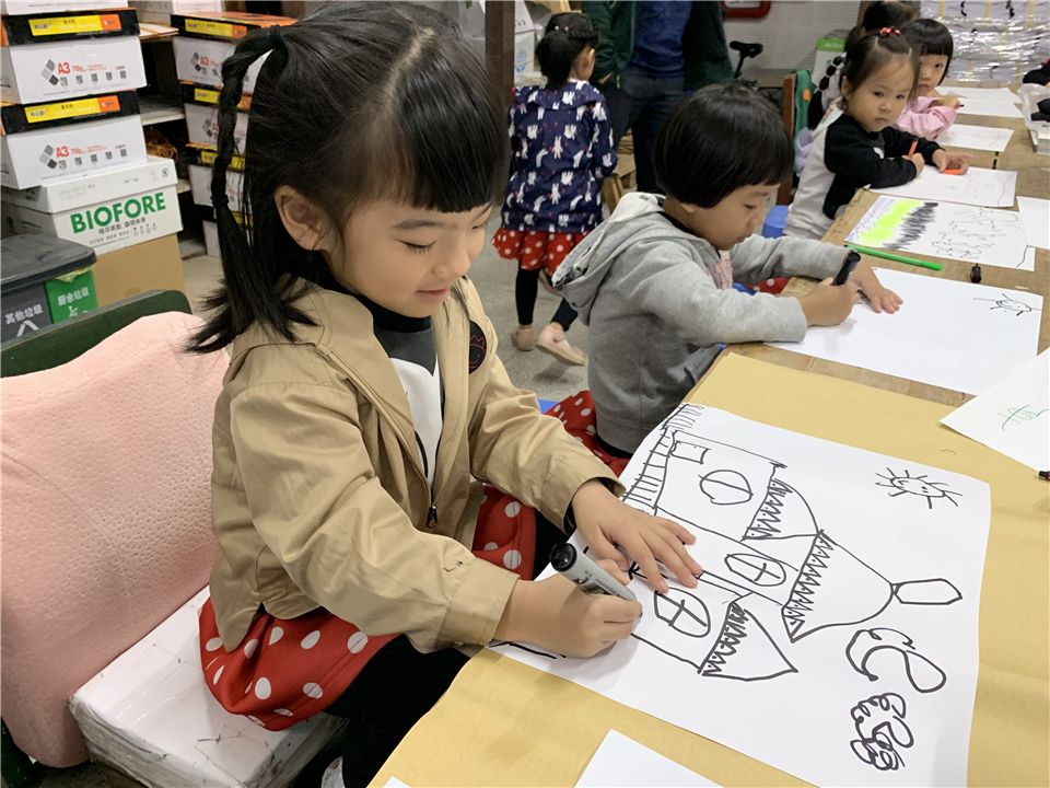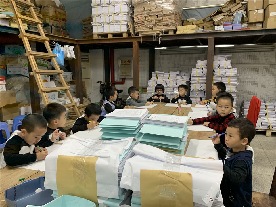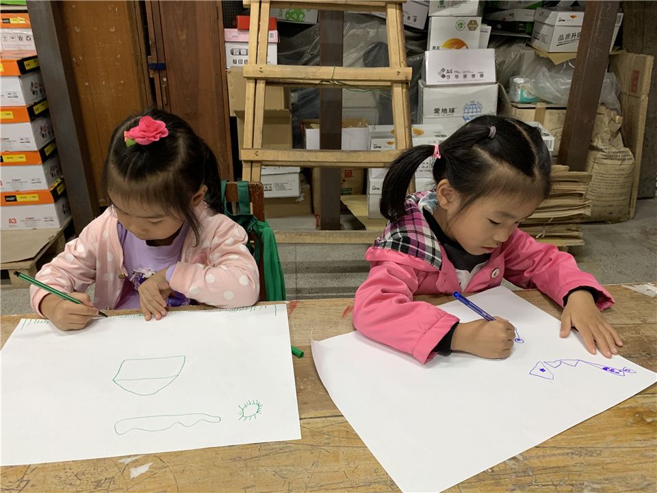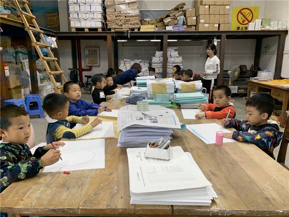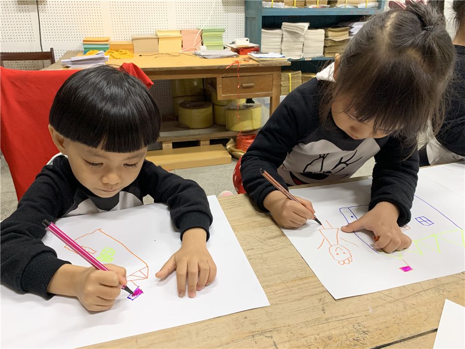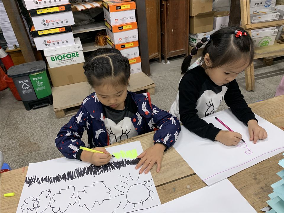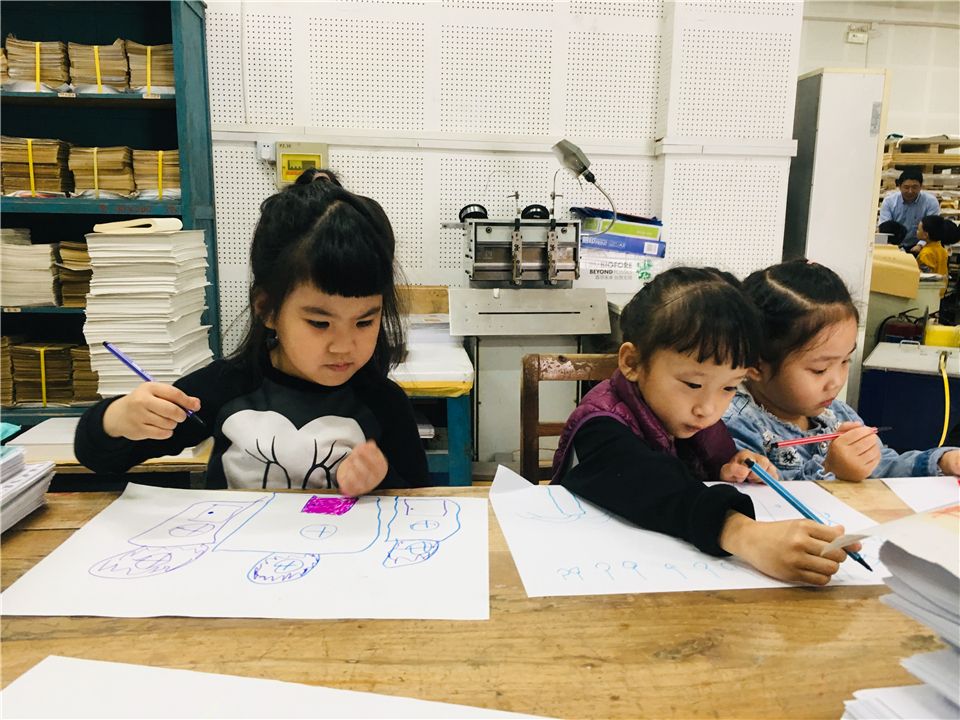 参观完所有的大机器设备,周叔叔问:“小朋友,你们想拥有一副自己的印刷作品吗?这里有速印机,只要把你们画的作品放进这个机器,就能印刷出一模一样的作品来!”“哇哦,好神奇哎,我好想试试看?”于是,小伙伴们拿起画笔,认真地画了起来……