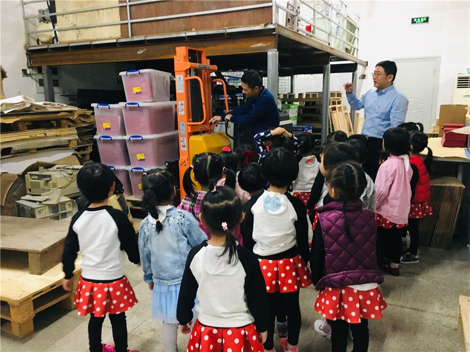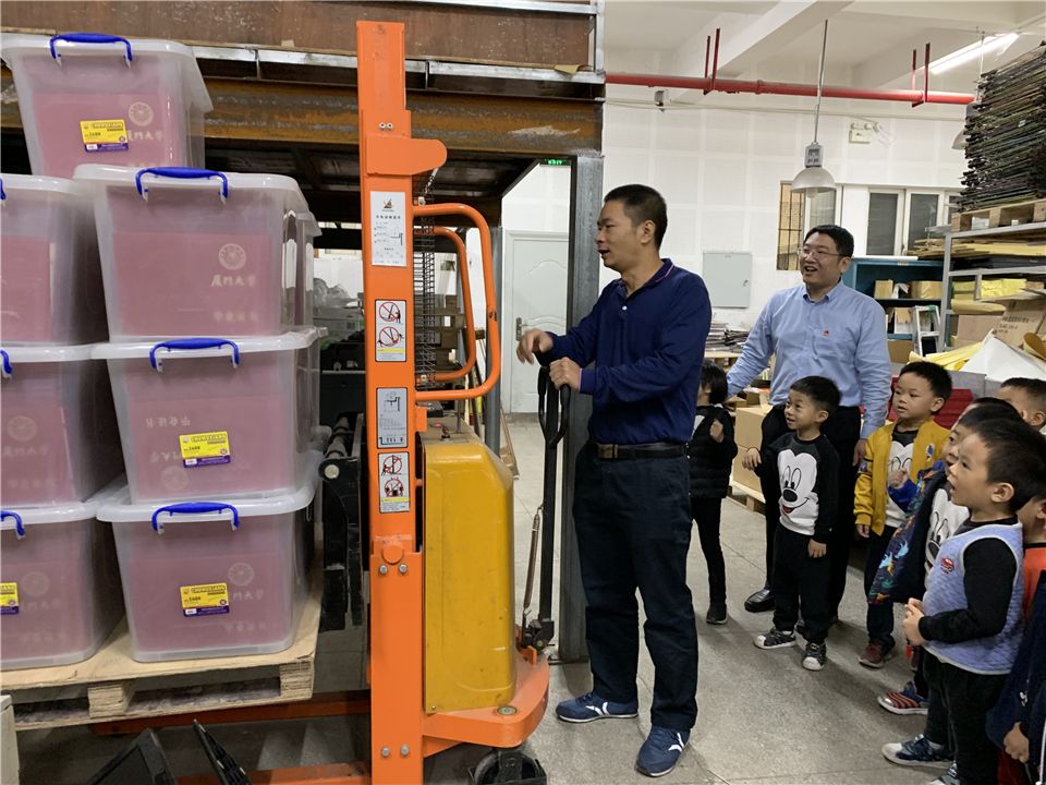 “咦?这又是什么大机器?”周叔叔告诉我们:“这是一台叉车。”它能把一堆很高很高的印刷纸张搬运到我们需要的地方,帮助印刷厂的叔叔阿姨们省了不少力呢!