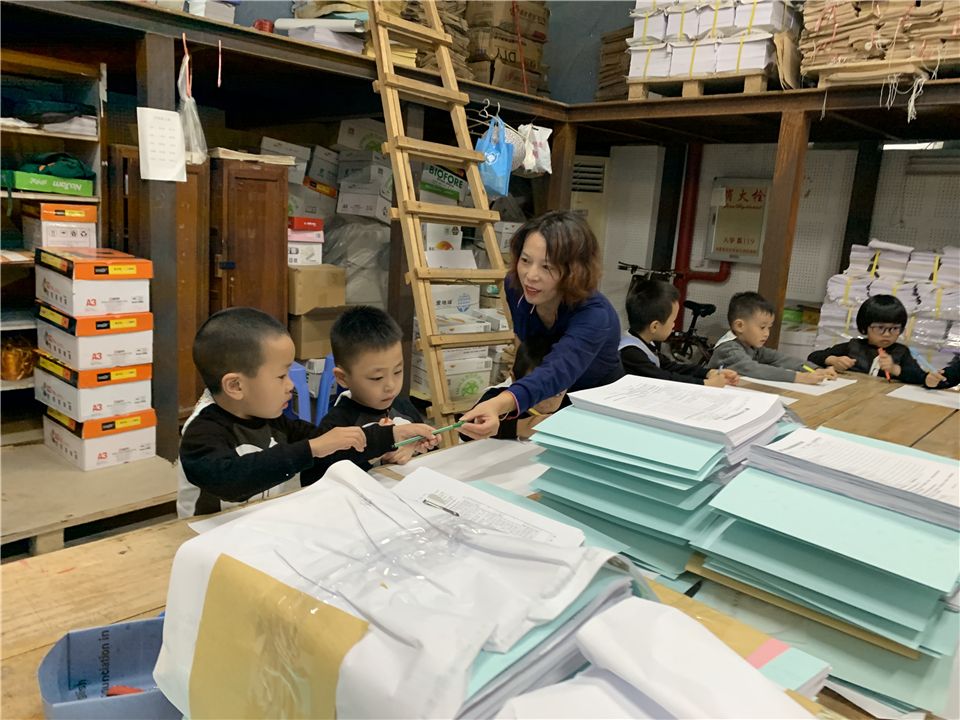 紧接着,我们跟随周叔叔来到二楼。眼前折合着的红本本是什么呢?原来,是厦门大学大哥哥、姐姐们的毕业证书!周叔叔给我们详细地介绍着这些毕业证书是怎么制作而成的,并希望小朋友们将来好好学习,也能成为厦门大学的莘莘学子。