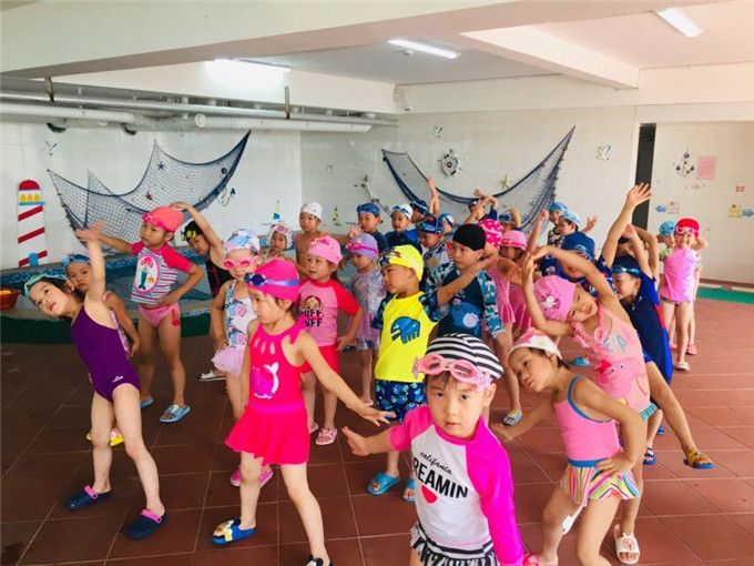 戏水之前还有很重要的事情要做哦,那就是热身运动!一起做做热身运动吧!1234、5678,2234、5678……做好了热身运动,待会下水时就会很安全哦!