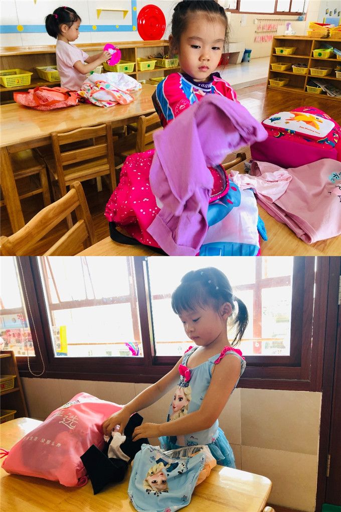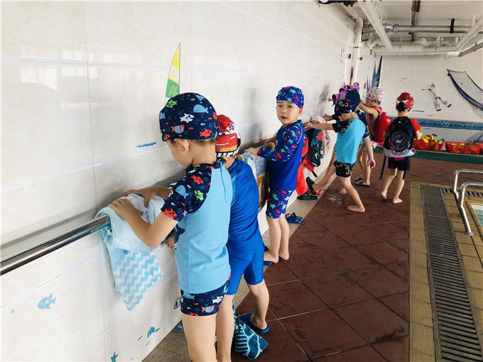 我们准备“换装”啦!拿出泳帽、泳衣、泳裤、浴巾,一件也不能少。再把换下来的衣服翻到正面来,收进自己的包包里,这样就不会拿错其他小朋友的了。你帮我来,我帮你。其乐融融真欢喜……