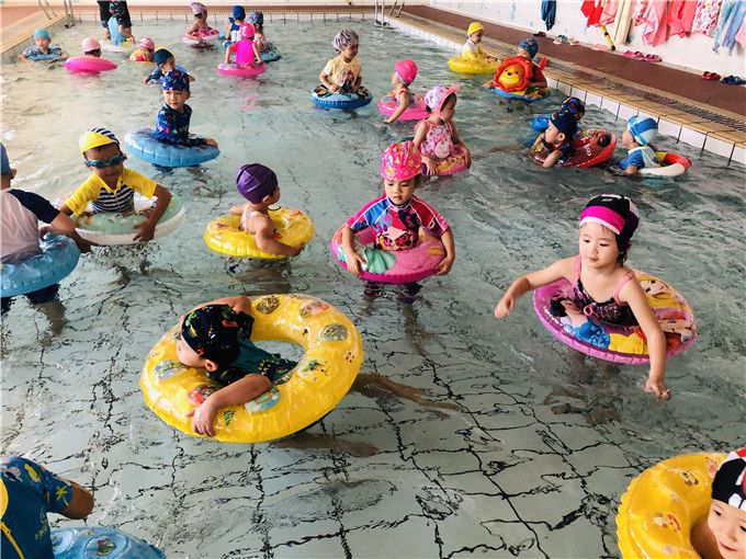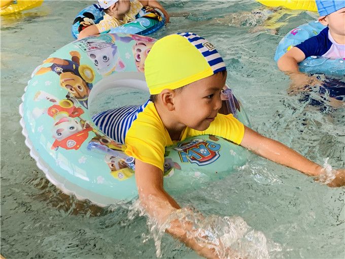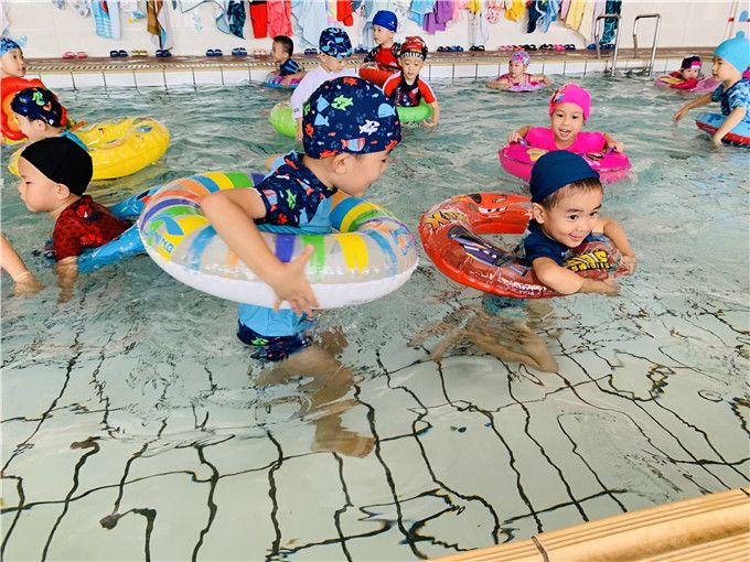 “扑通、扑通……”顿时,一群鱼儿自由自在地畅游在泳池里。有的玩起了水上芭蕾,有的在池边聊天休息,还有的三三俩俩成群嬉戏变朵小花。最后,搭起了我们最欢玩的小火车。
