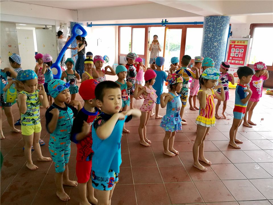 玩水前,准备运动可是少不了的哦,在动感的乐曲声里,在志愿者和老师爽朗快乐的口号中,中七班宝贝们快乐地做起了准备动作:伸伸腿、弯弯腰、扭扭身、转转圈……听着老师交待好了安全注意事项,哇咔咔,准备下水咯!