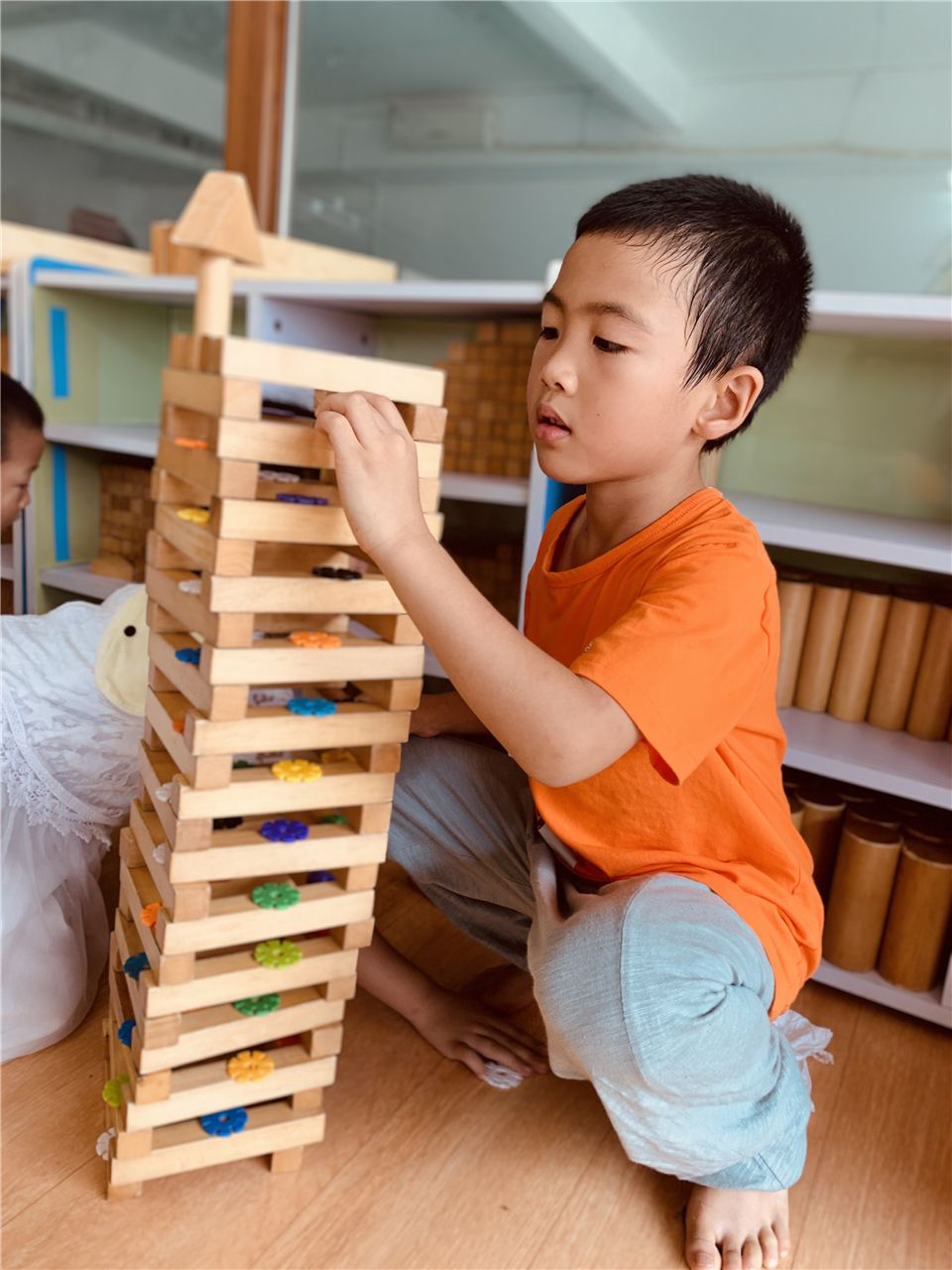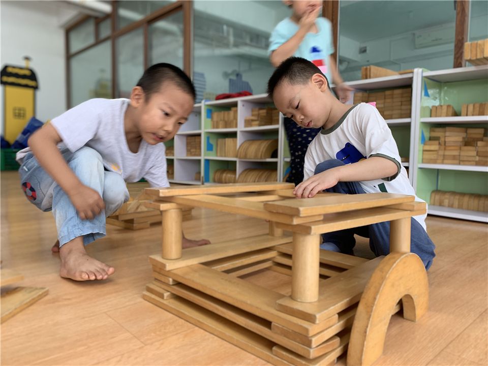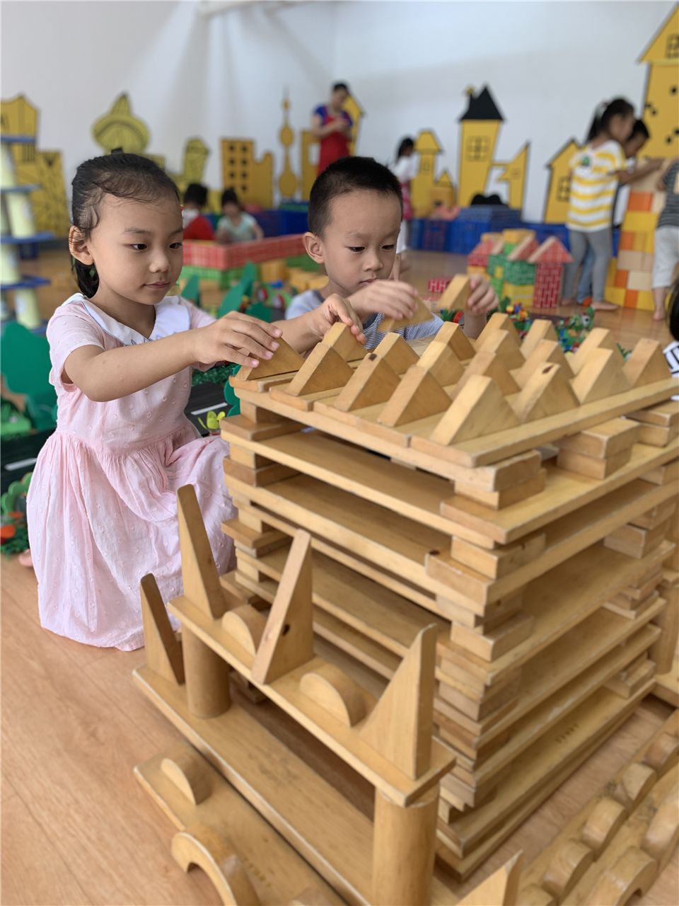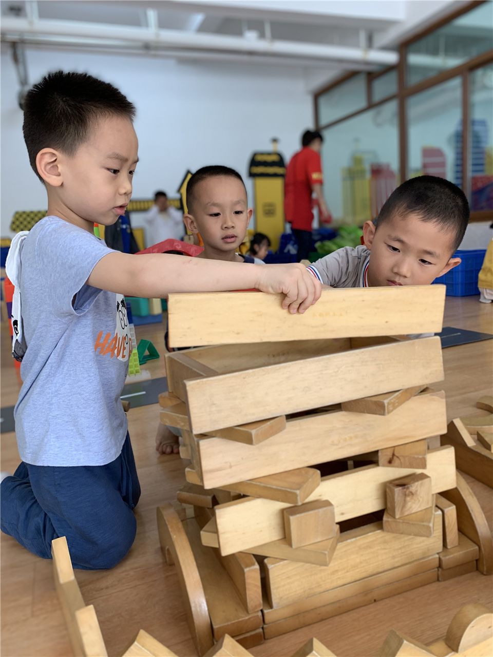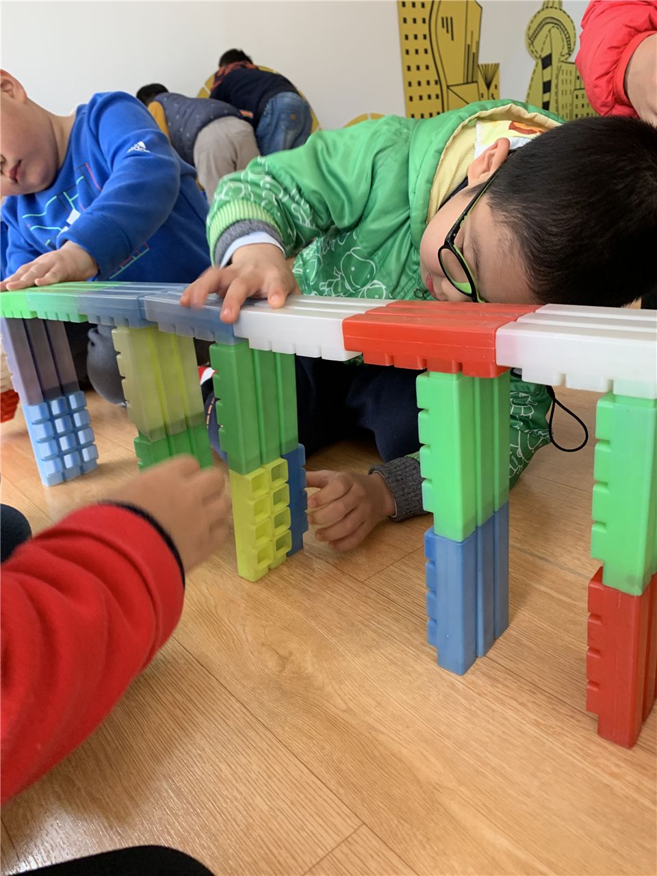 镜头一:我们在尝试垒高、围合、延长和镶嵌。小朋友们多专注呀,每一个都像是真正的建筑师一样,聚精会神、小心翼翼地工作着......