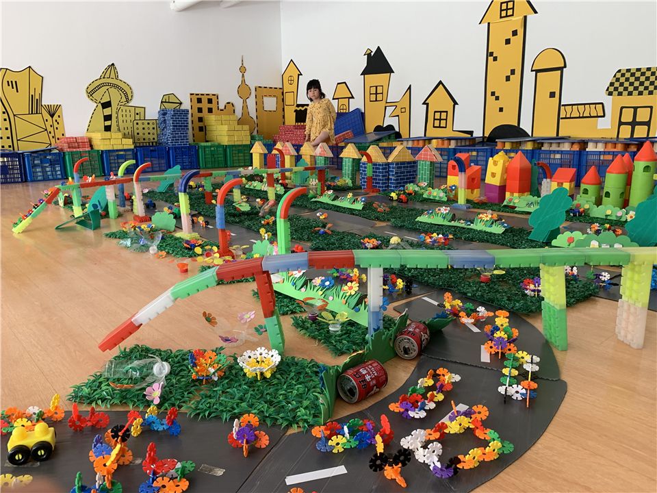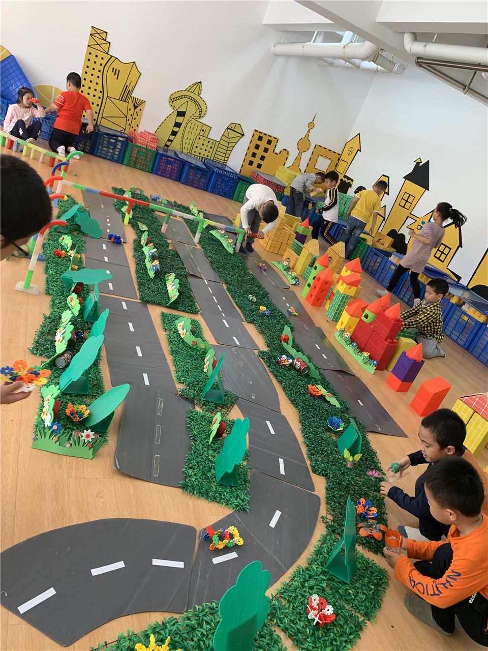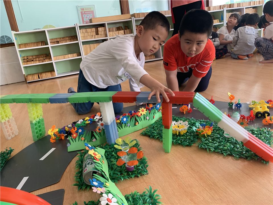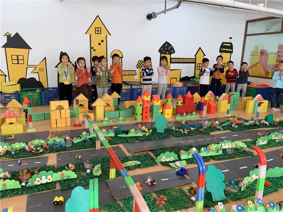 镜头三:萌娃们在小组、集体构造活动中,互相合作,合理利用多种辅助物,搭建孩子们眼中的立交桥、环岛路、美丽的社区。宽阔的马路、路灯、美丽的绿化带.....都在小朋友的手里呈现出来。游戏结束后参观着自己建构成果,萌娃们都高兴地鼓起掌来。