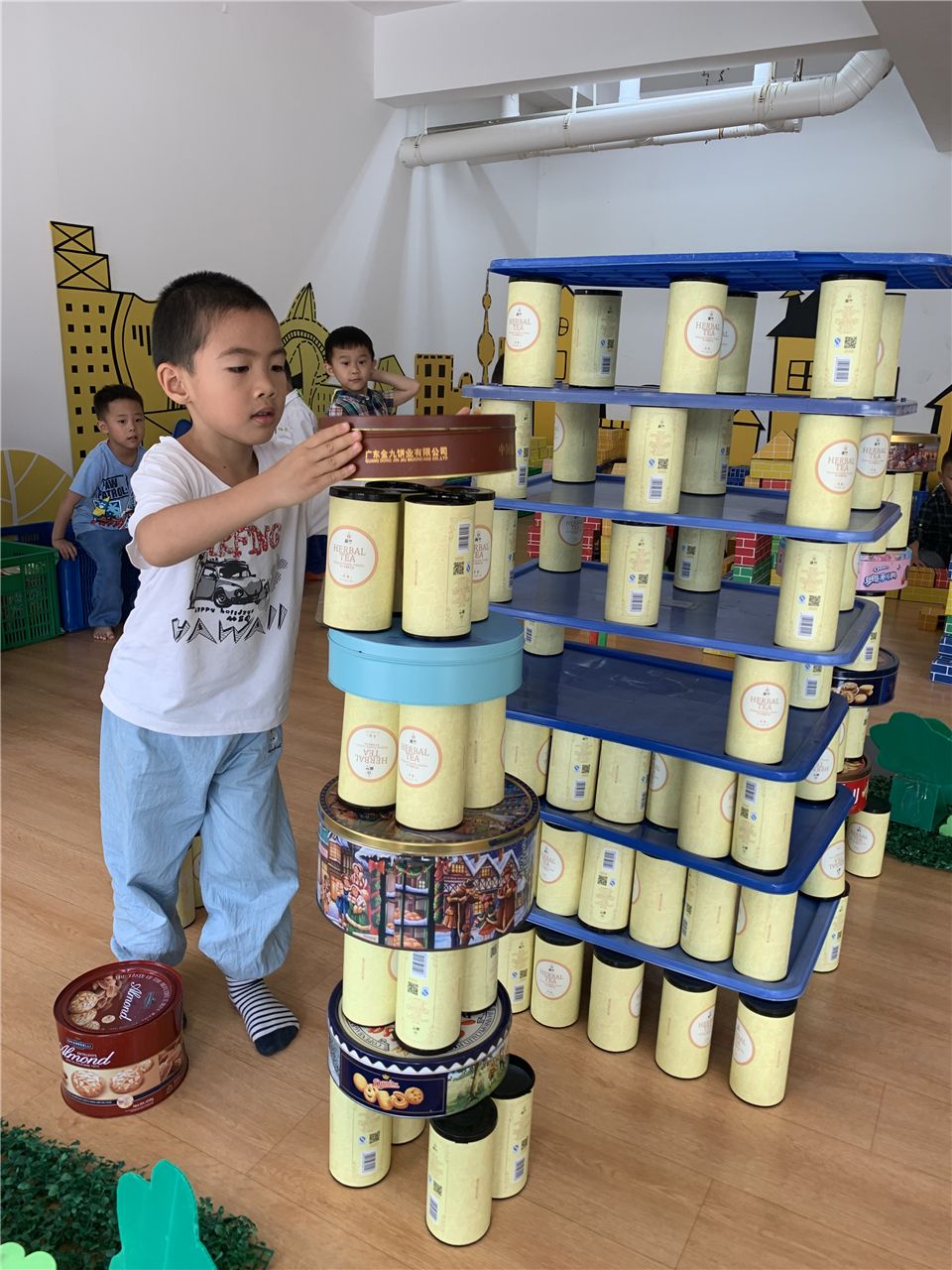 镜头二:我们会用各种不同的材料来搭建建筑物。块状积塑、各种规格木料、纸盒、茶叶罐、盖子、饼干盒......这些建构材料、生活中的废弃物,在孩子们的巧手里,变身成了造型美丽的房屋、坚固神气的桥梁......