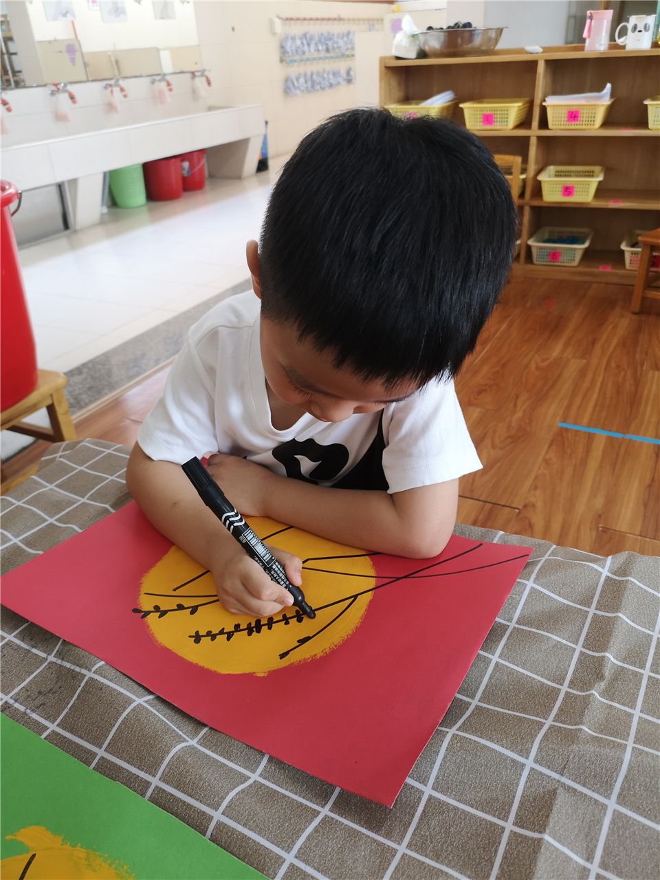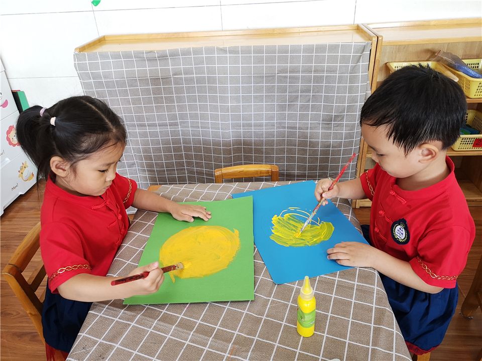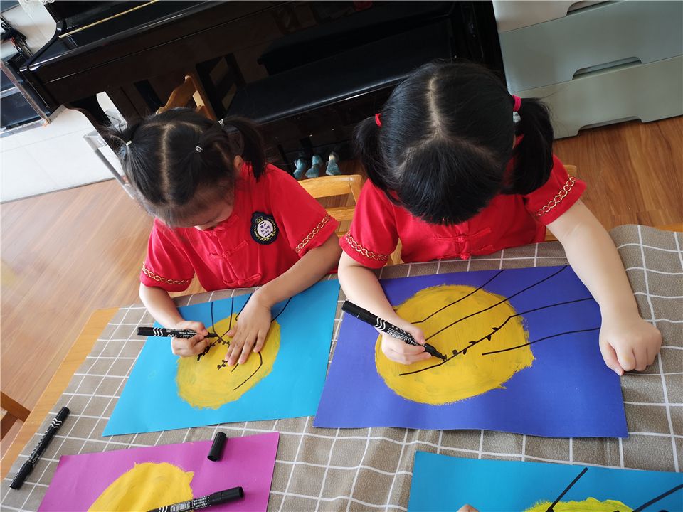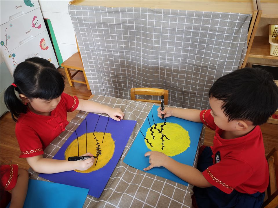 中秋月儿高高挂,中秋月儿圆又圆。老师,中秋的月亮太美了,我好想把它画进我的画里。看,我们在很仔细、很小心的给大月亮涂上颜色,画上小树枝呦。你们说我们画的月亮好看吗?