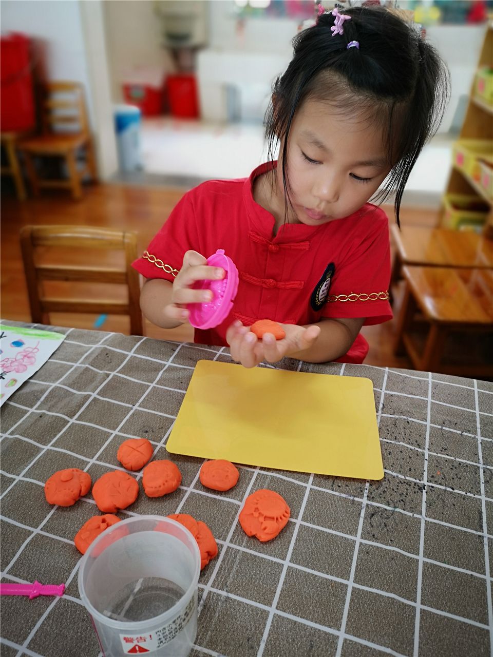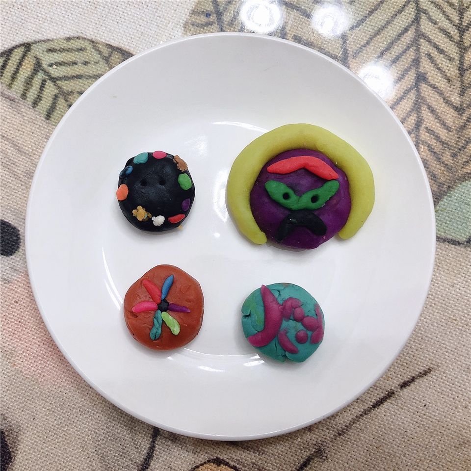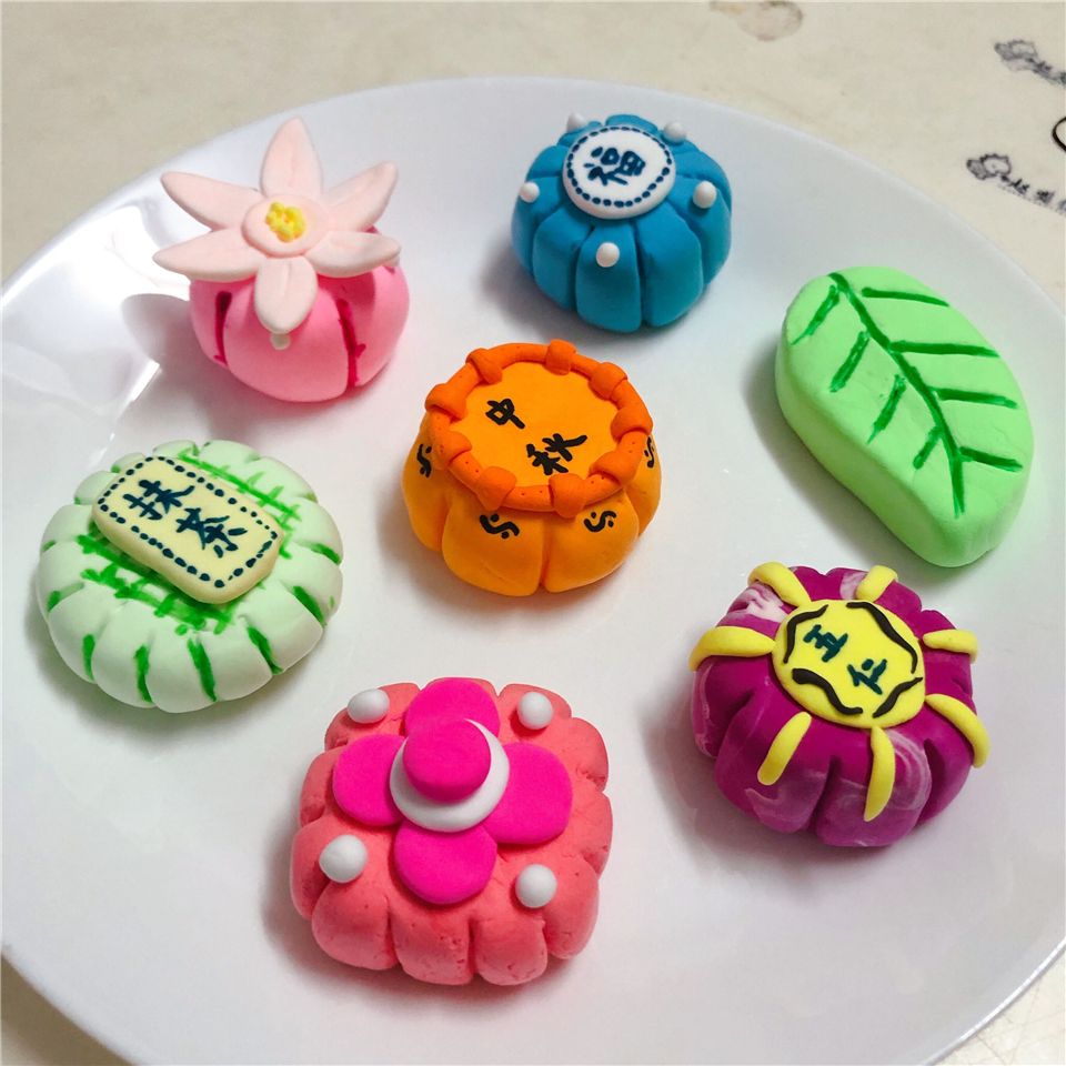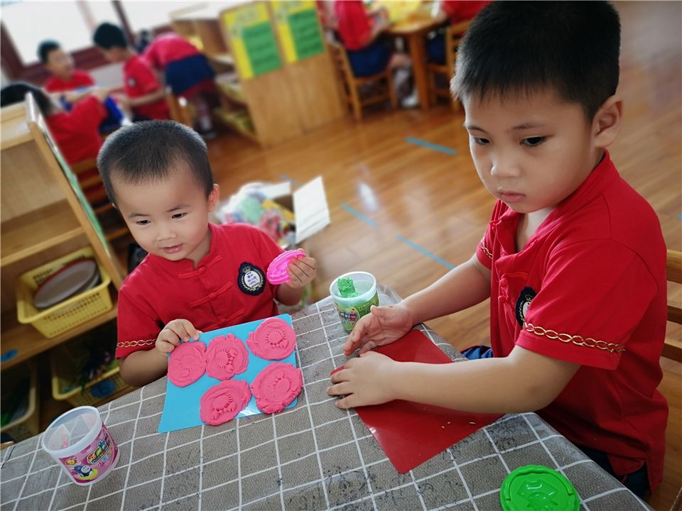 瞧,这边的宝贝则用橡皮泥制作月饼,搓一搓、压一压、印一印,一个漂亮的月饼就做好啦!