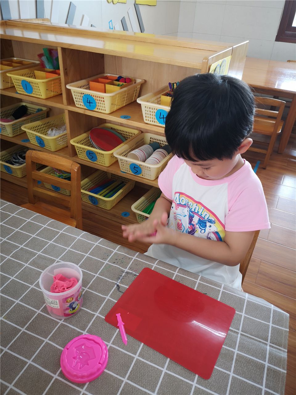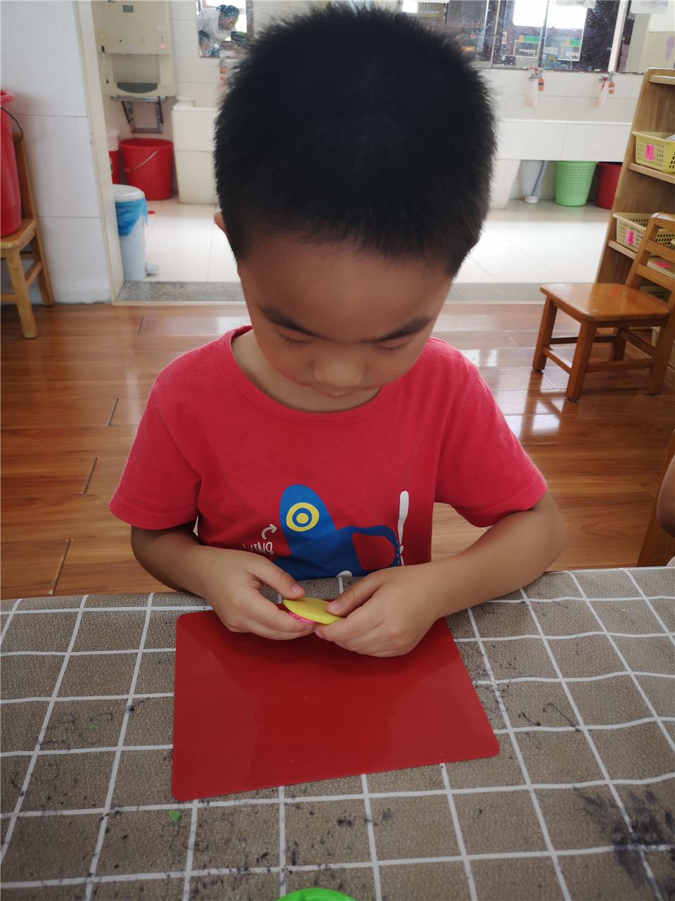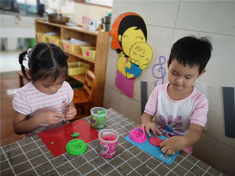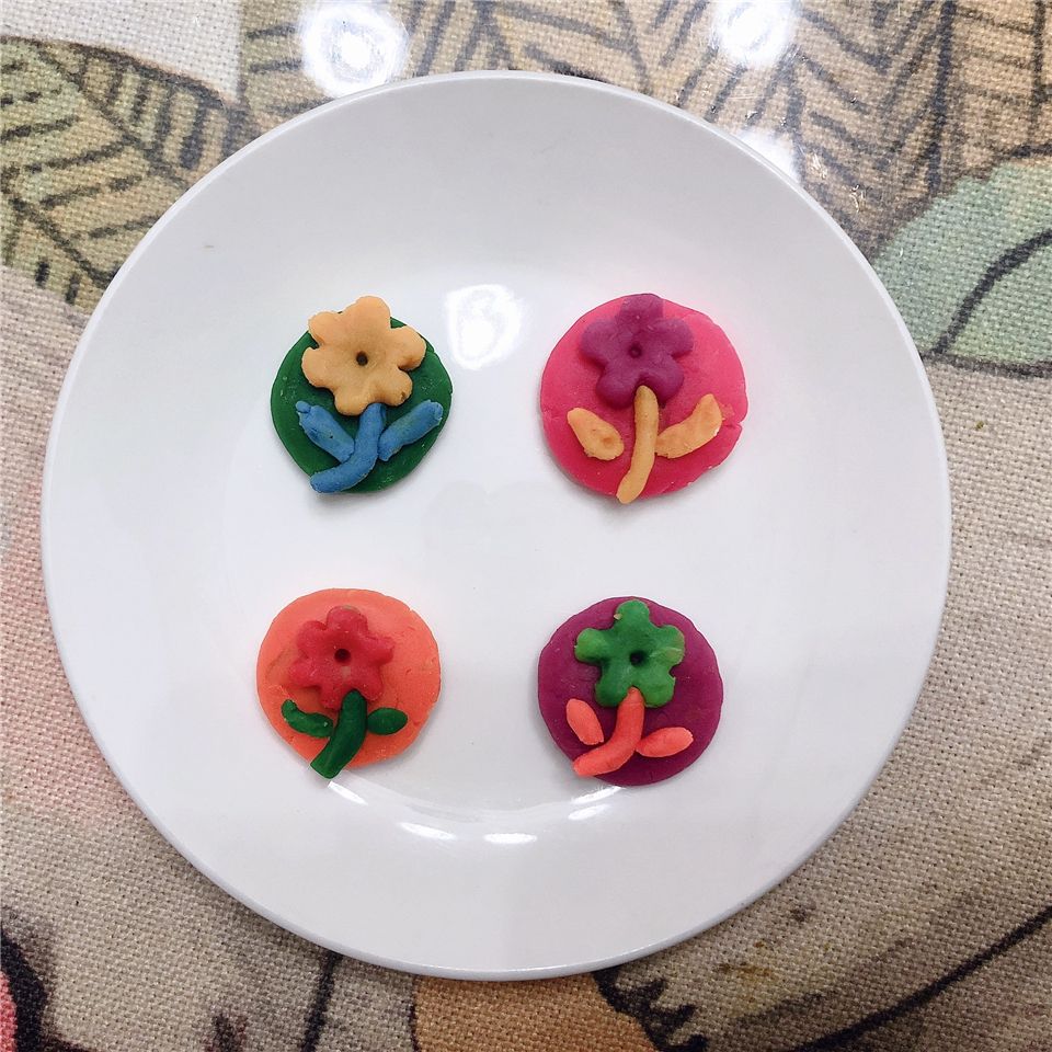 瞧,这边的宝贝则用橡皮泥制作月饼,搓一搓、压一压、印一印,一个漂亮的月饼就做好啦!