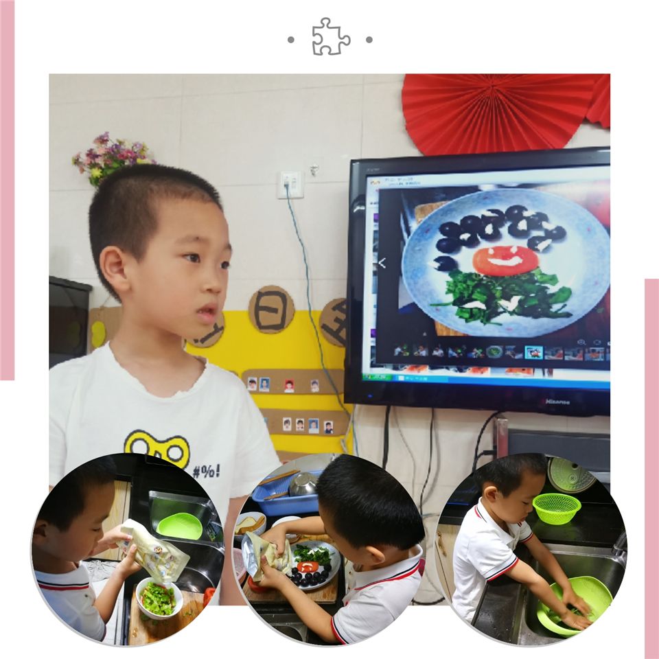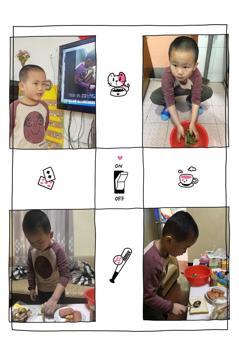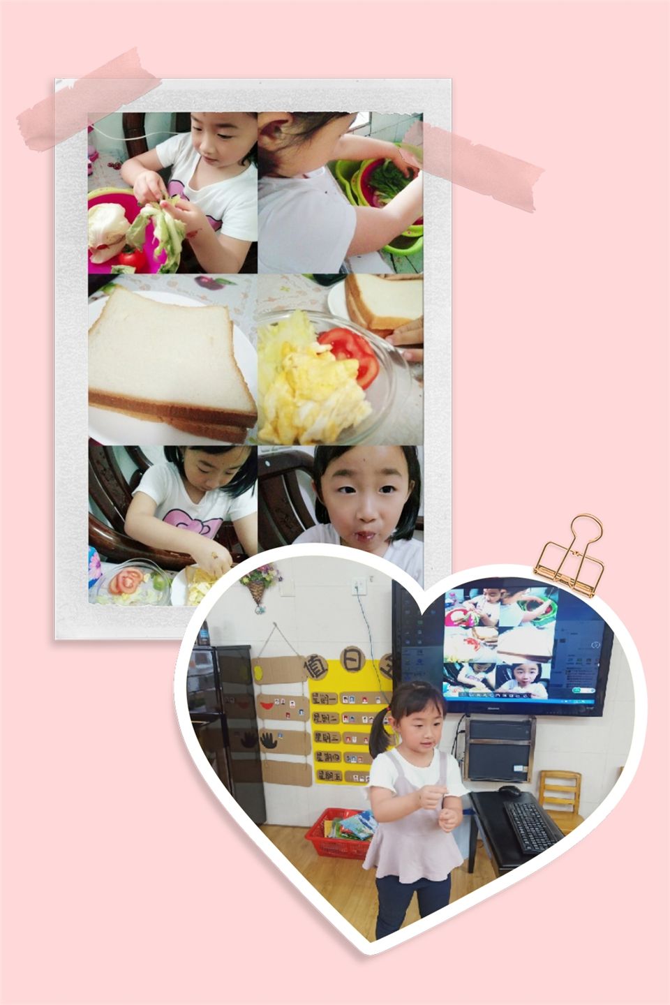 美味的三明治,可口的蔬菜沙拉,清爽的蒜蓉炒青菜,……来来来,我们来分享:先把青菜洗一洗,前面后面都要洗干净哦,再把青菜撕成一片一片加点水果,再加点沙拉酱,哇哦!还有还有,我们把青菜洗干净,在锅里放点油,炒一炒,放点盐,真的太太太好吃了,可以吃两碗饭哦!三明治才是最最美味的,先把面包烤一下,放上洗好的生菜、培根,最后抹上一些爸爸一定要我放的枇杷膏,自己动手做的三明治就是好吃!
