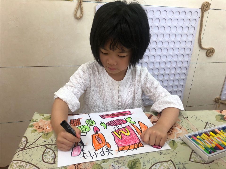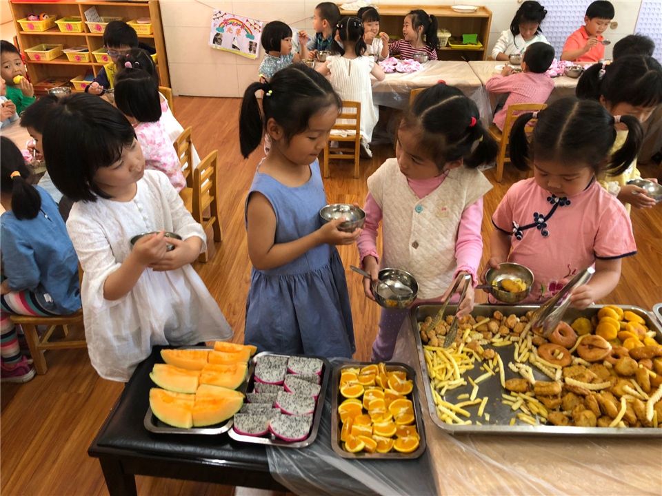 “你们最喜欢吃的食物是什么呀?我们把它们画下来让厨房的叔叔阿姨把它们做出来哦”