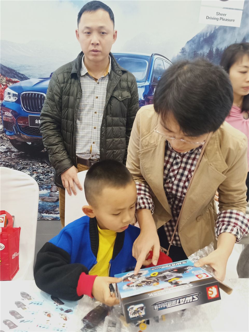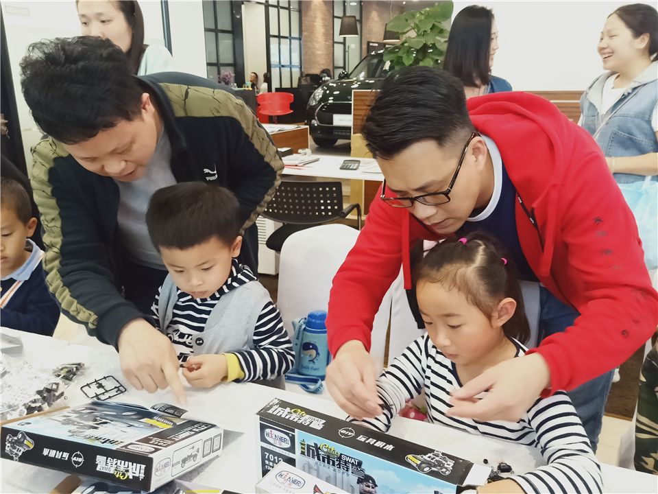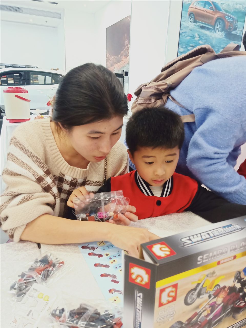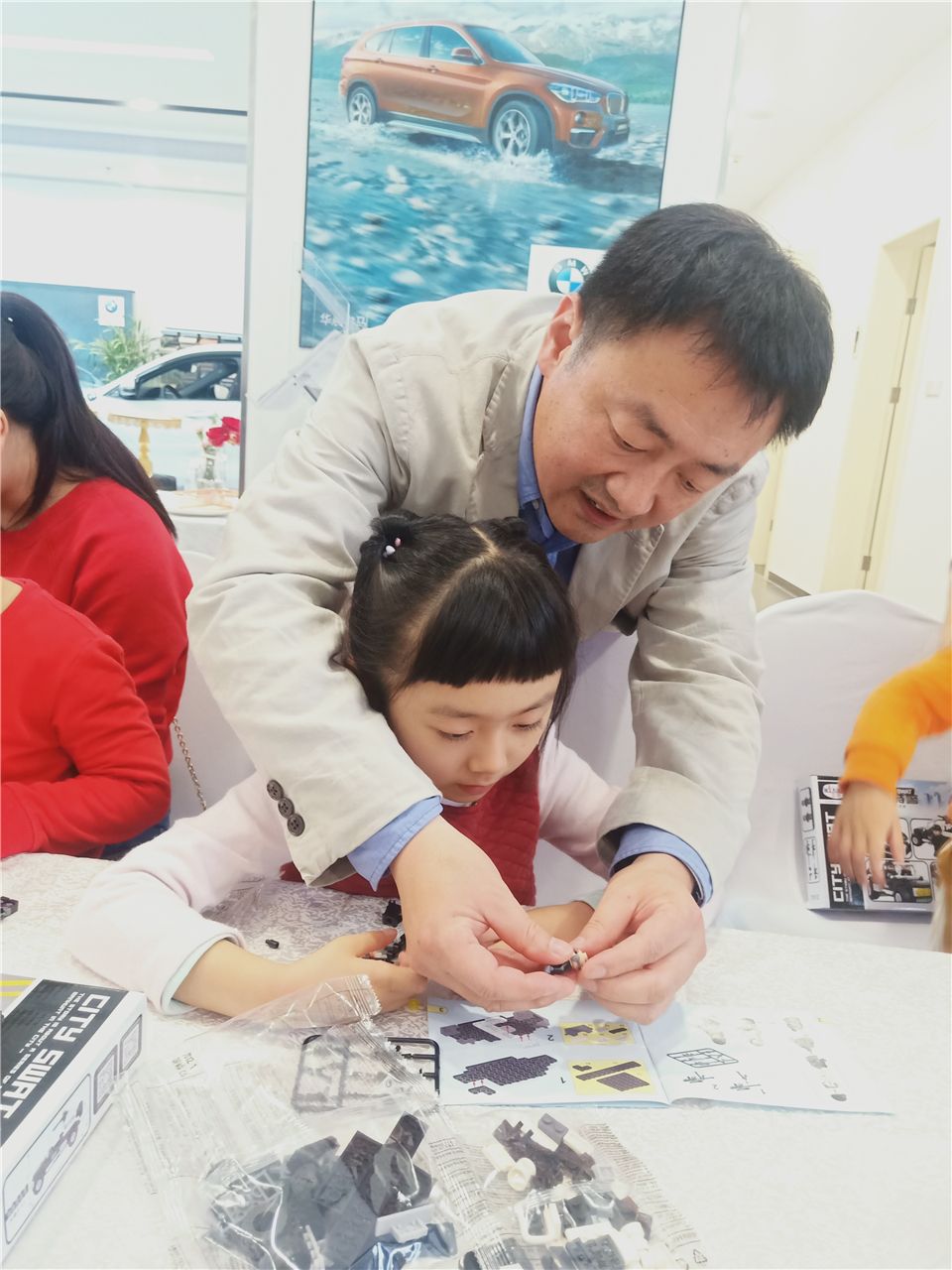 正当我们激动不已的时候,中宝的宝马市场部杨博洋经理拿出了让孩子们惊呼不已的“宝物”,每个人都拿到了一个车辆的组装玩具盒哦。爸爸,我的车轮子呢?妈妈妈妈,快看我把警察拼好了!一场寓教于乐的亲子小游戏就这样紧张地开始啦。
