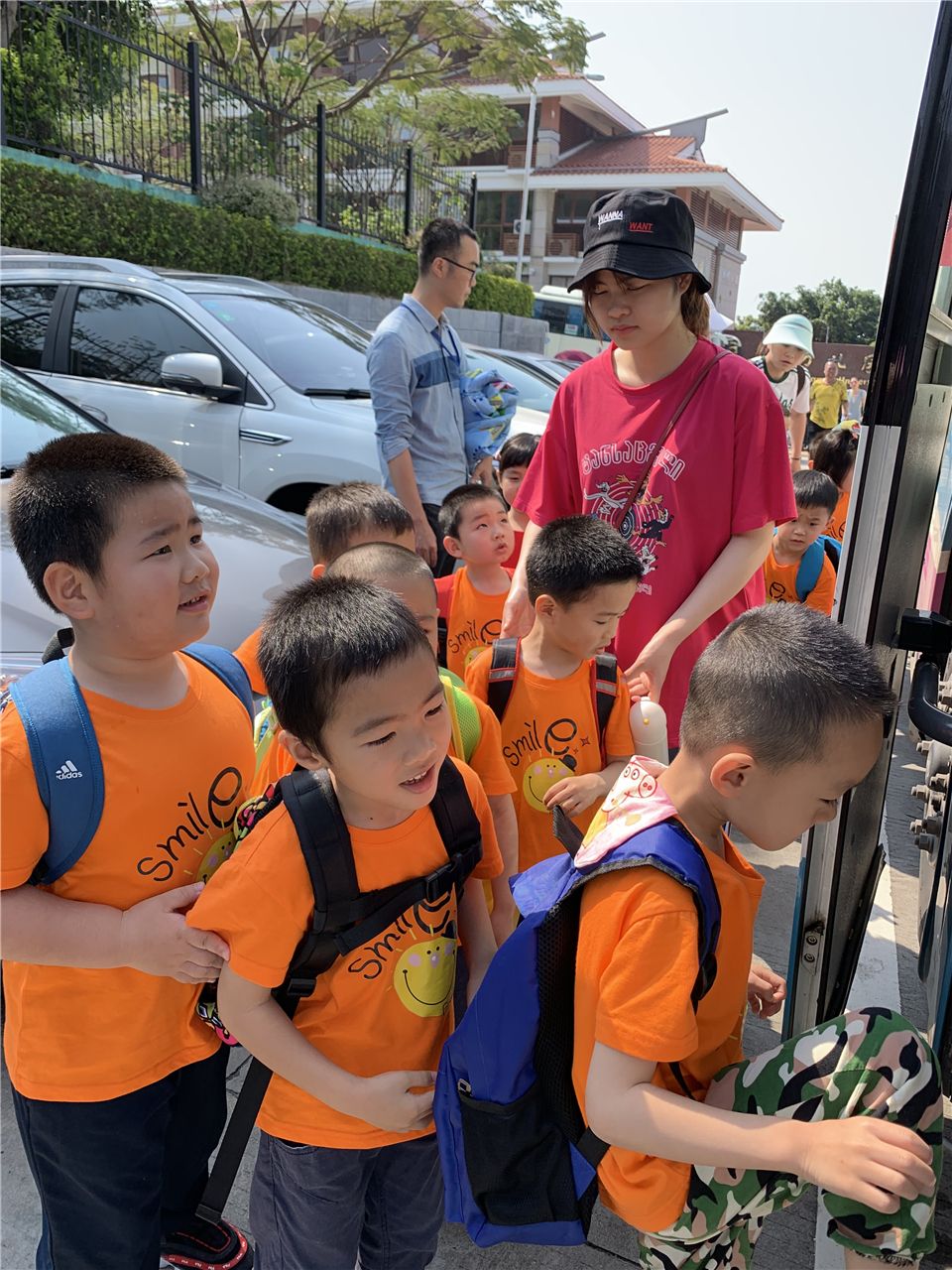 瞧,小朋友们掩饰不住兴奋的心情,背好了小书包,牵着小手排好队,在安保爸爸的随行护送下,出发啰!