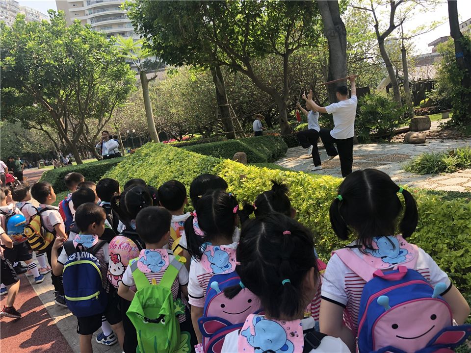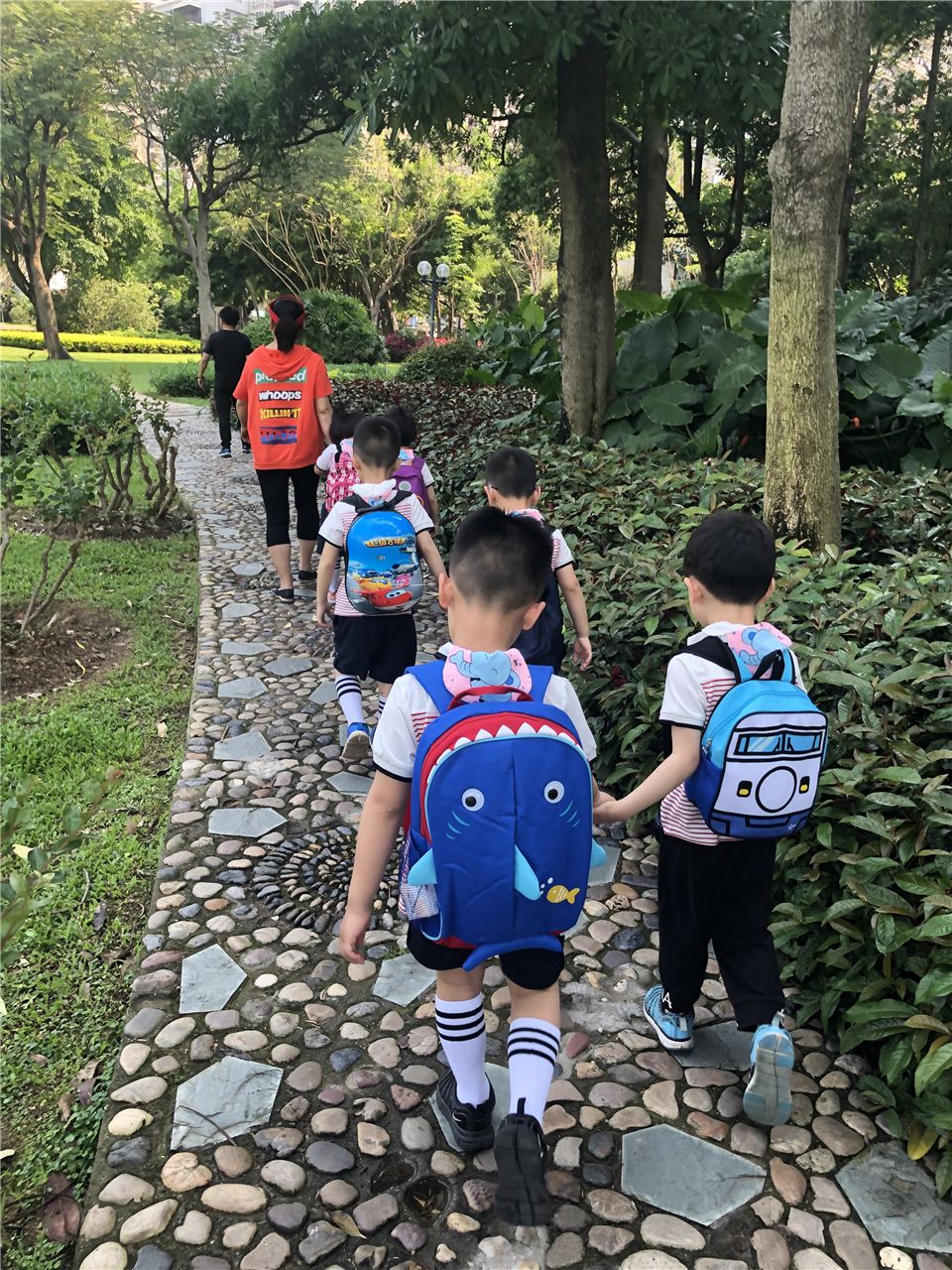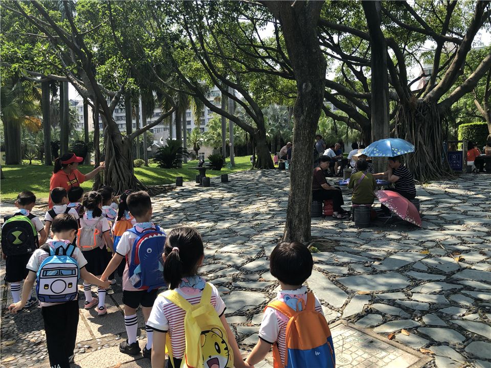 “老师,你瞧,对面是什么呢?好热闹呀”。随着孩子的好奇心,我们继续往前行,“老师,这有好多的爷爷奶奶,他们在干什么呢”?“我们一起上前看看吧”。孩子们围着奶奶,“我知道,奶奶们在打麻将……”哈哈!孩子们与奶奶聊得不亦乐乎,“你们快看,好多阿姨在跳舞啊”!“还有,还有,我看见叔叔阿姨在练太极剑呢”!孩子们目不转睛地看着……