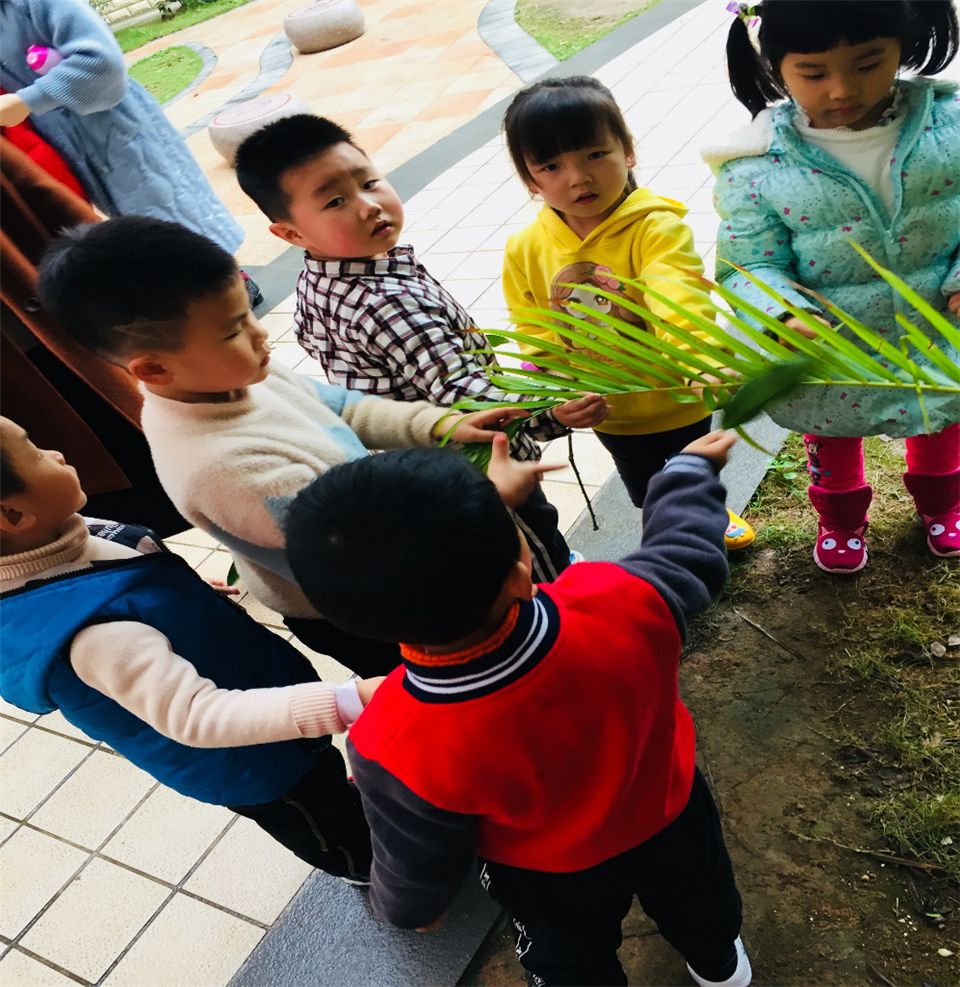 小朋友们好奇的摸摸叶子:叶子滑滑的,长长的……