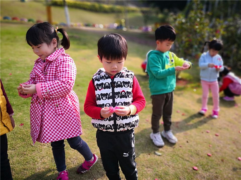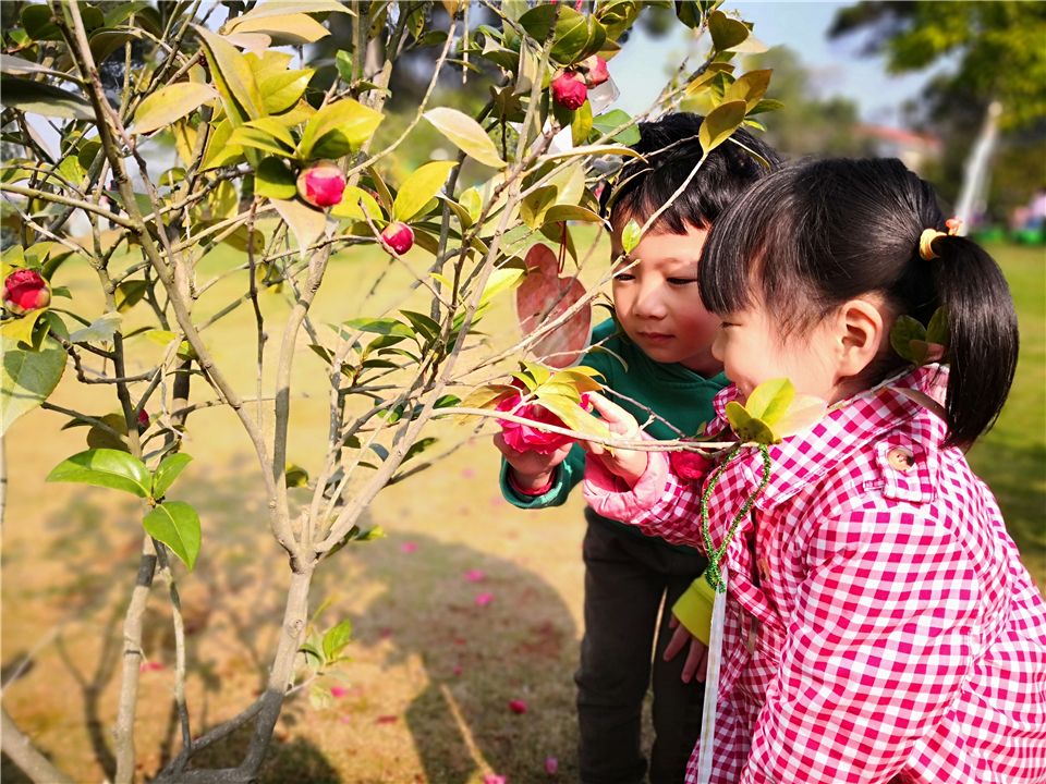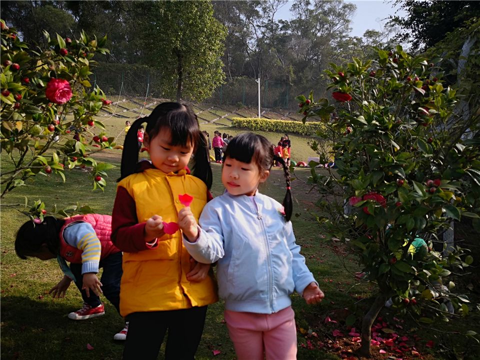 “老师,老师,快来看啊,这里有朵好美的花!”可爱的诗涵发现了新大陆。“在哪在哪?哇!好漂亮啊,我最喜欢红色的花呢!”虫虫连忙凑过去 。“你看,这朵花还没有开,这是它的花骨朵。”诗涵指着其中一朵含苞待放的小花说。原来他发现了茶花。看!那绽放着笑脸的山茶花,几十片心形的花瓣叠叠层层,开得芬芳馥郁,开得欢快舒畅。她们有的缀在枝头“荡秋千”,犹如一位正在表演精彩舞蹈的少女;有的挂在枝腰,张着大嘴,正用甜美的嗓音歌唱春天的到来;有的嵌在树叉间,仿佛在积蓄力量,迎接挑战;还有的用绿叶遮住半边脸,显得很害羞,又好像在跟孩子们捉迷藏……每朵山茶花里,小花瓣中都藏着浅黄色的花蕊,显得十分清雅。