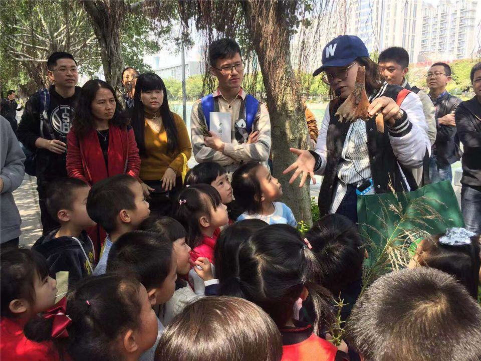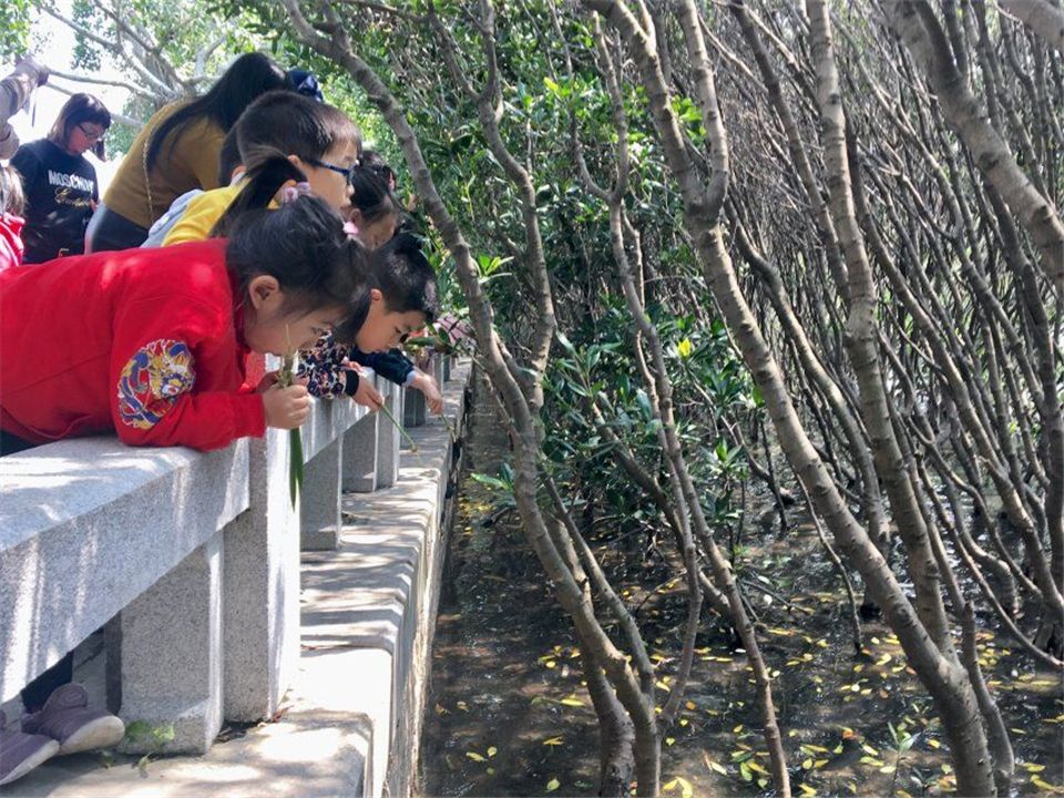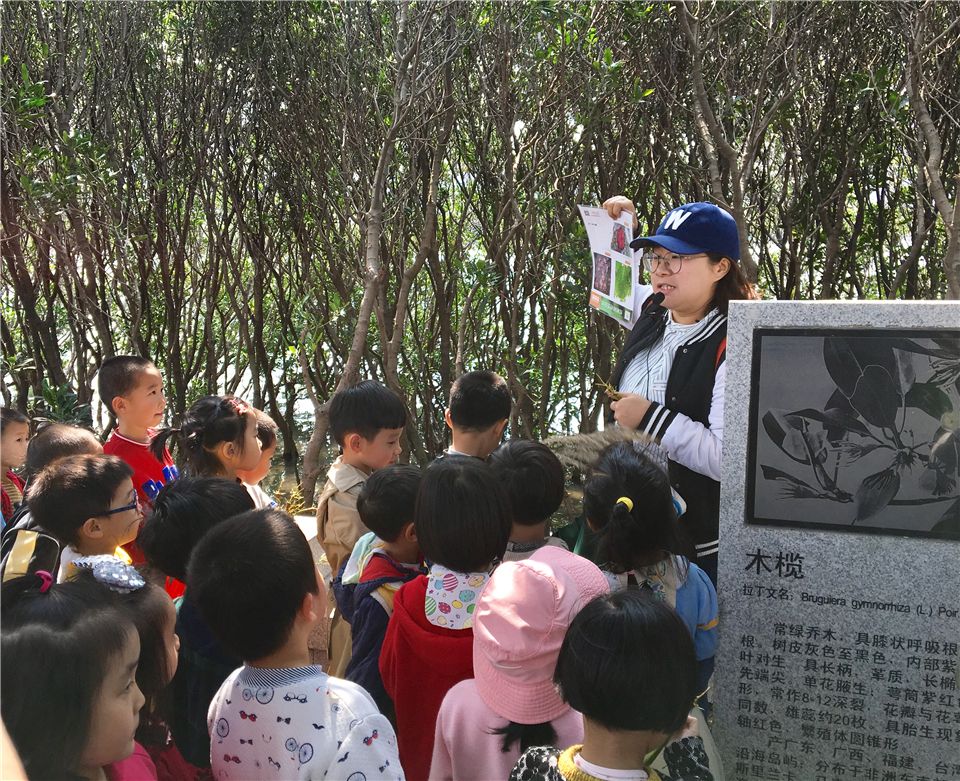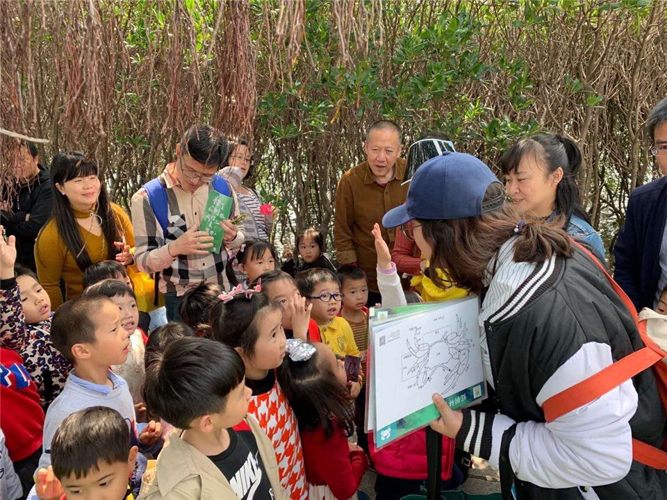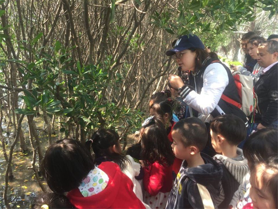 在中国红树林保育联盟志愿者小象姐姐带领下,小朋友们观察红树林,了解了红树林的由来。原来啊,红树林生长于陆地与海洋交界带的滩涂浅滩,是陆地向海洋过度的特殊生态系,它突出特征是根系发达、能在海水中生长。
