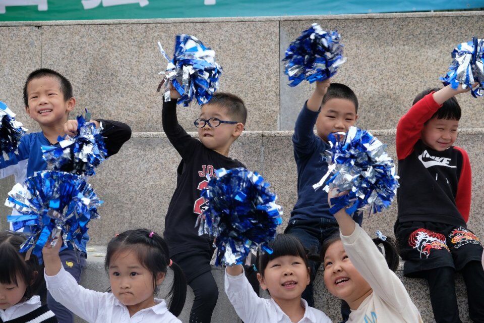 瞧,孩子们都按捺不住开心的笑容,她们有的都穿上了球衣球服,有的带上了啦啦操道具来为校友们呐喊加油!我们是不是很专业呢!