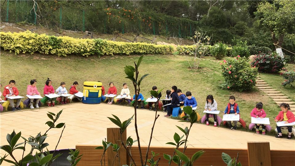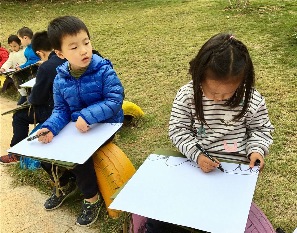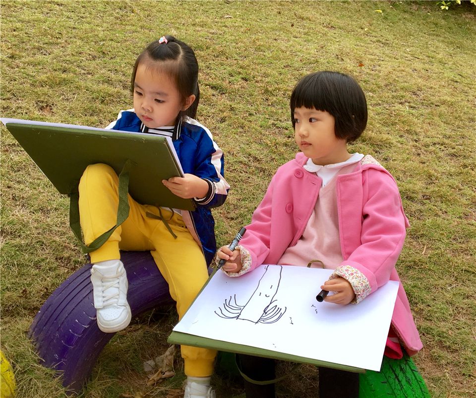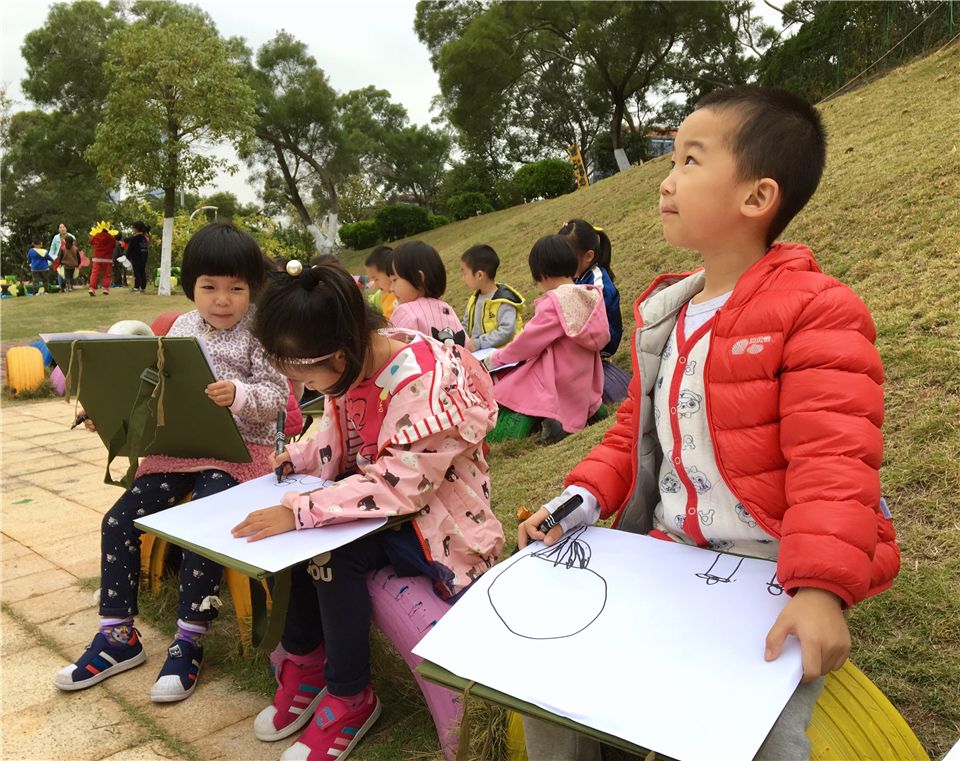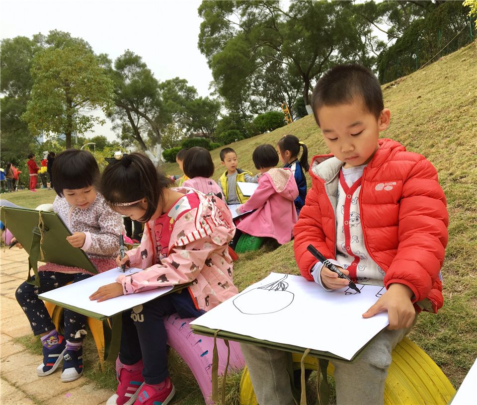 瞧,这么多小萌娃们坐在山坡是在干什么呢?唔,膝盖上都放了块画板,原来是在写生呀!是的,这是中七班萌娃们有史以来第一回写生,大家都很激动呢!