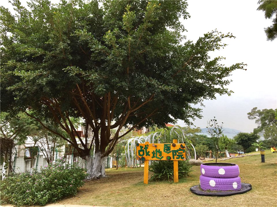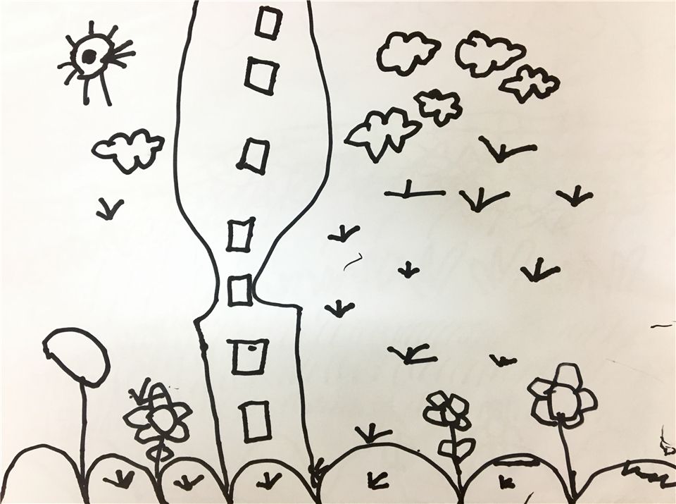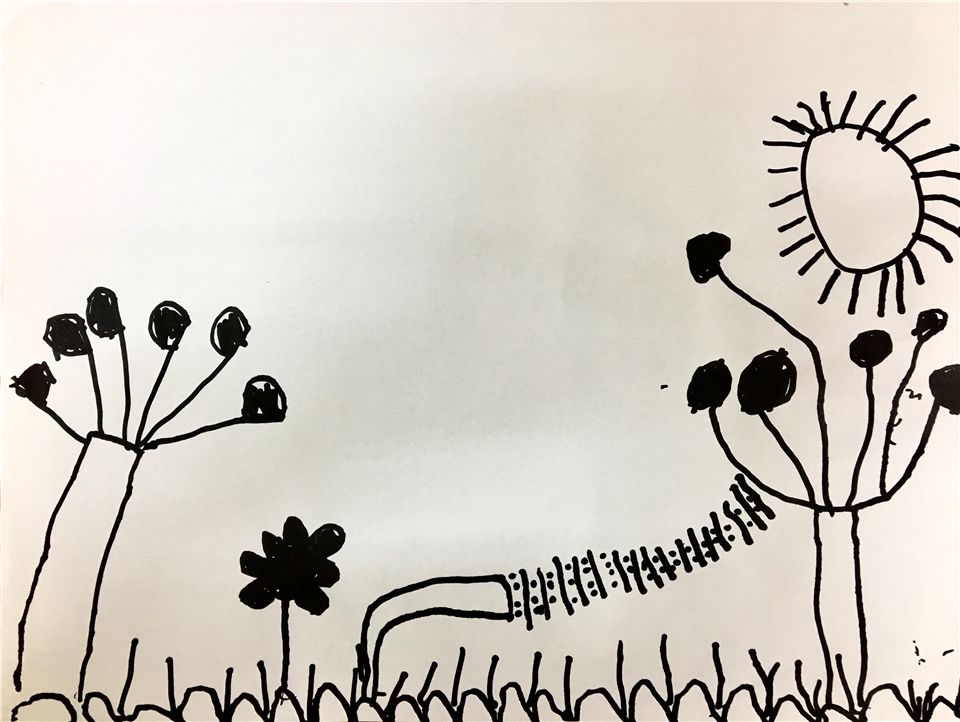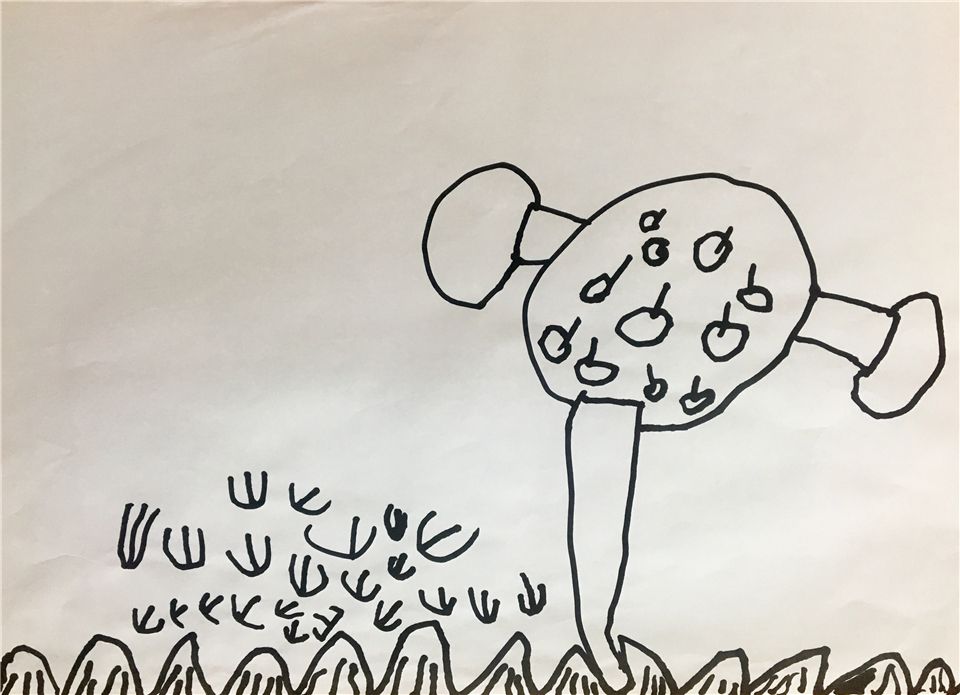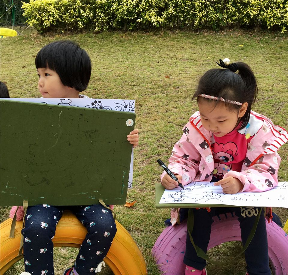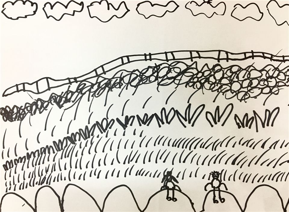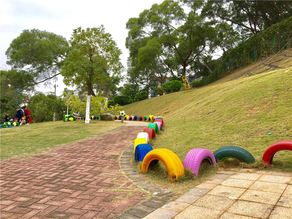 嘉麟说:“我们这儿能看到旁边有很多半圆形轮胎的小路,轮胎旁边就是个小山坡,山坡到处都是小草和大树呢!”
