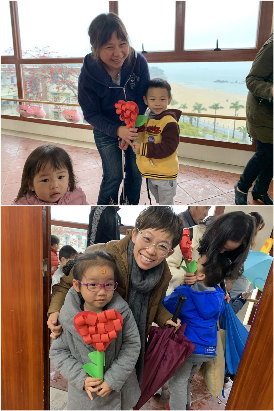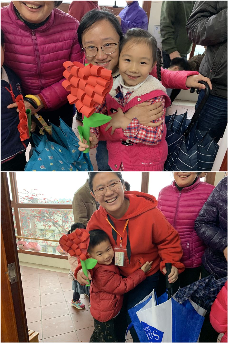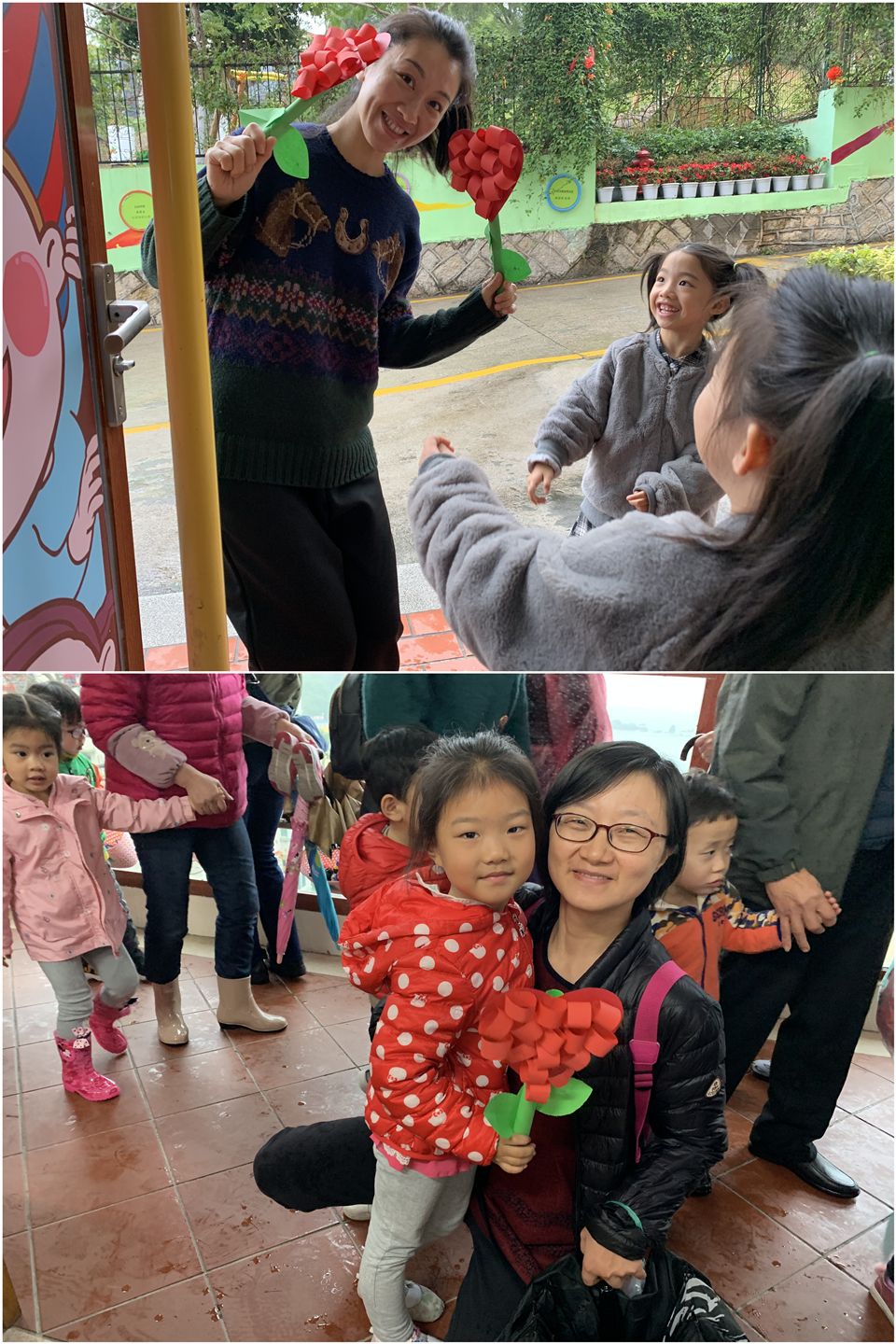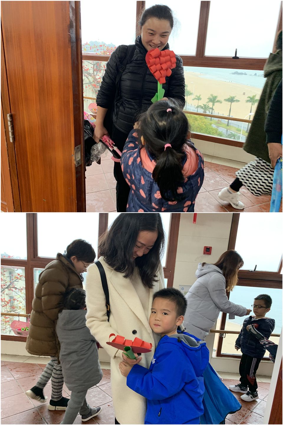 好不容易等到放学的时刻,孩子们迫不及待地把自己的作品送给妈妈,对着她们大声地说:“我爱您,您辛苦了!”