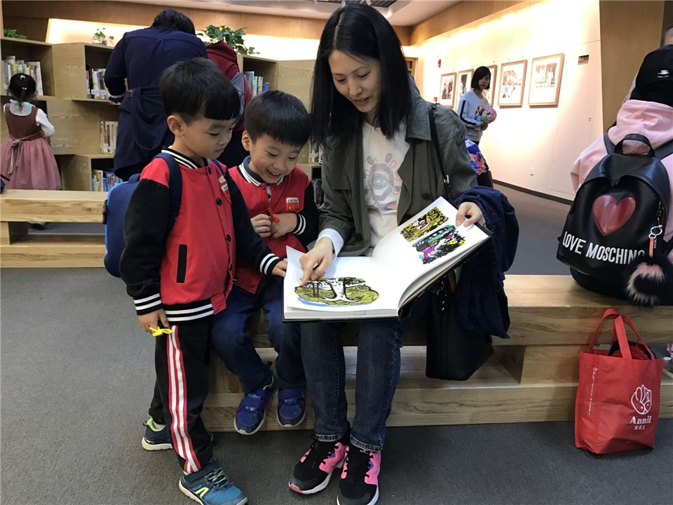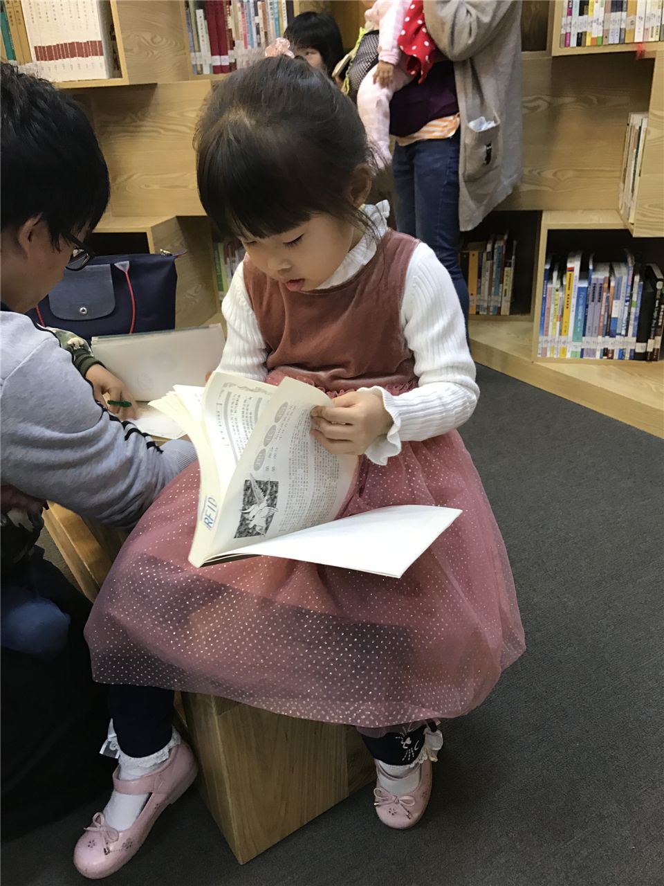 紧接着小朋友和家长们在阅览室里自由地翻阅图书,享受图书带来的快乐。