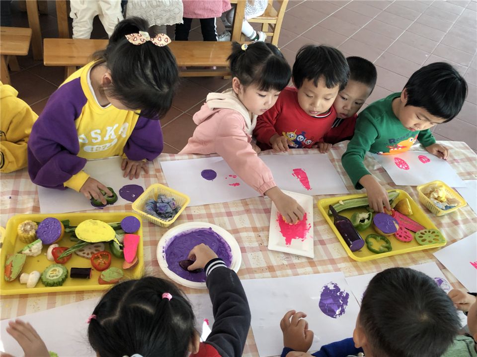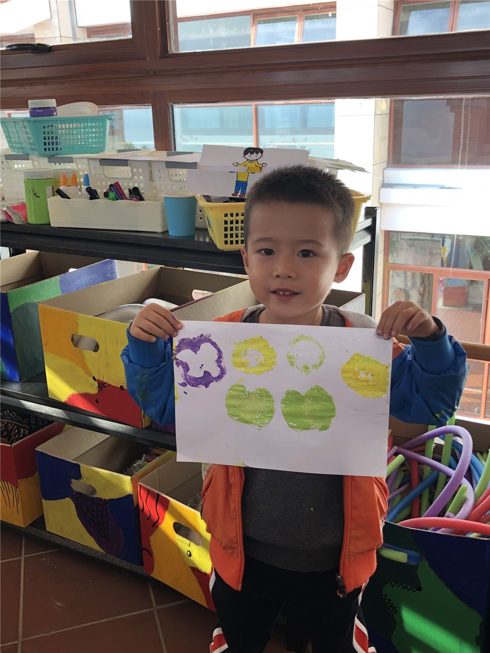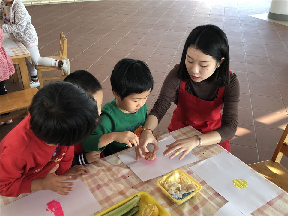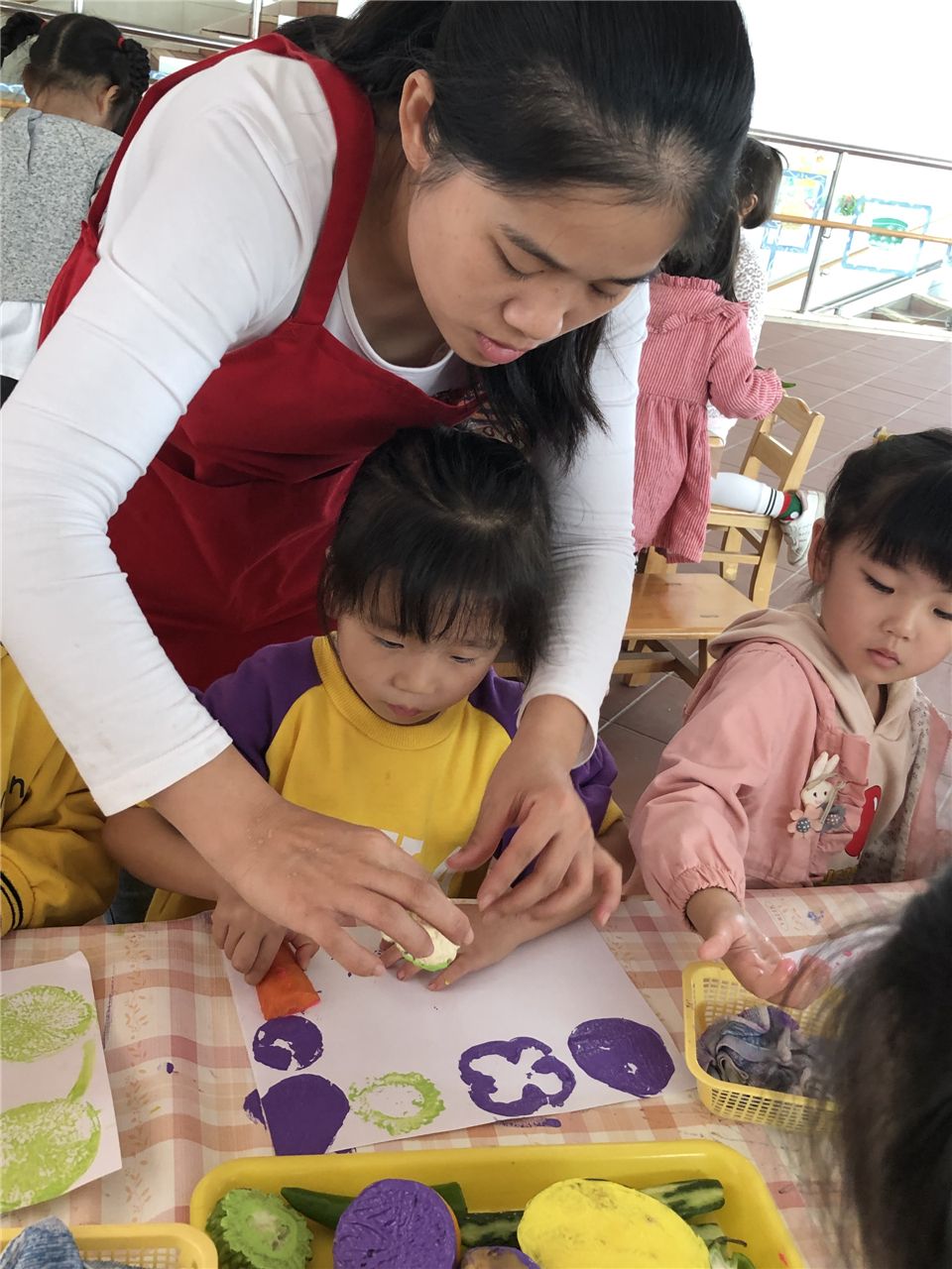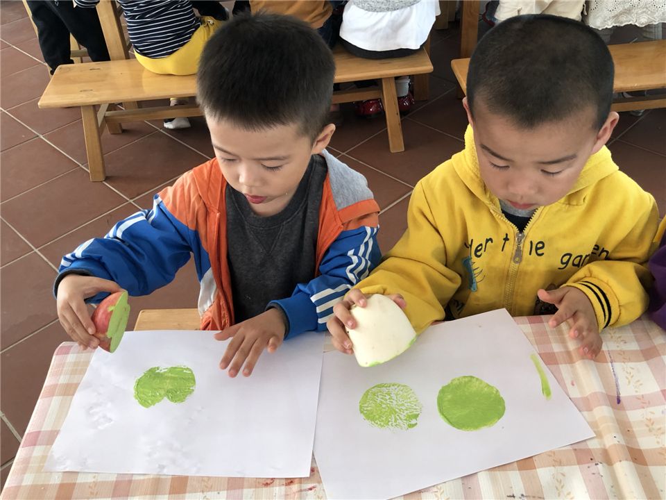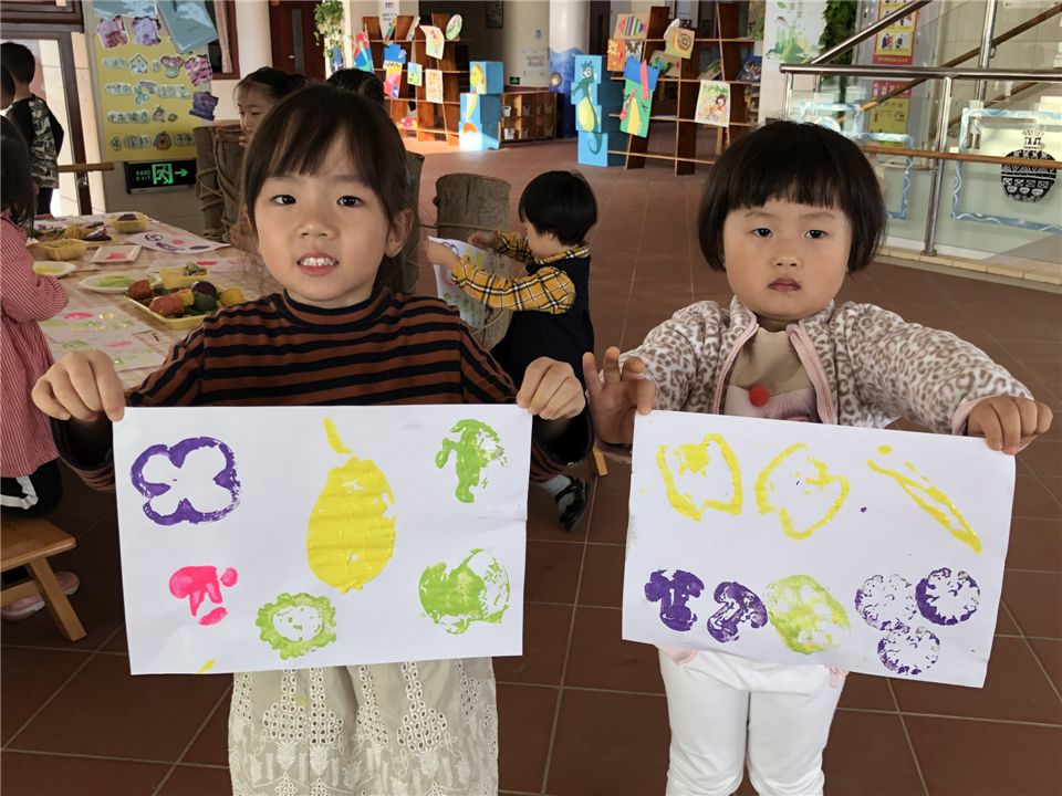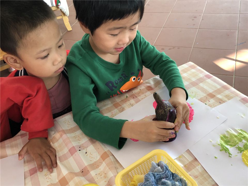 午睡过后,宝贝们迫不及待地吃完水果,带着我们的蔬果来到美劳室,等待他们的是即将到来的一场缤纷多彩的游戏世界。“你们瞧,不同蔬果采用不同的切法呈现出的形状就不一样咯,瞧!我给它们的身体沾上颜料印在纸上呈现出的样子,你们觉得如何呢?”“老师,我觉得茄子切开之后长得像梨子。”“老师,我发现苹果对半切开像蝴蝶的翅膀……”哇,宝贝们的想象力可真美!
