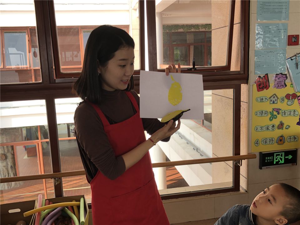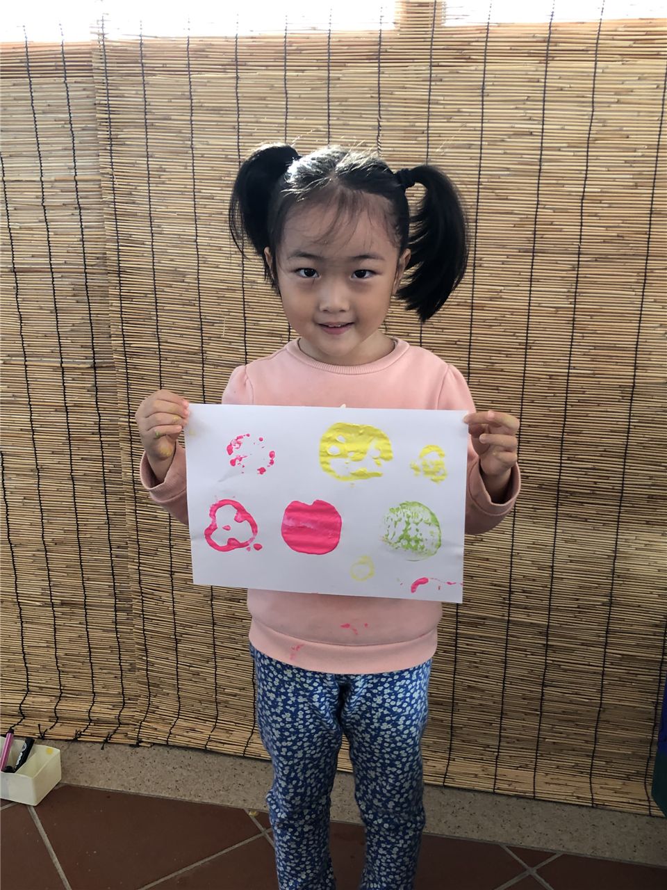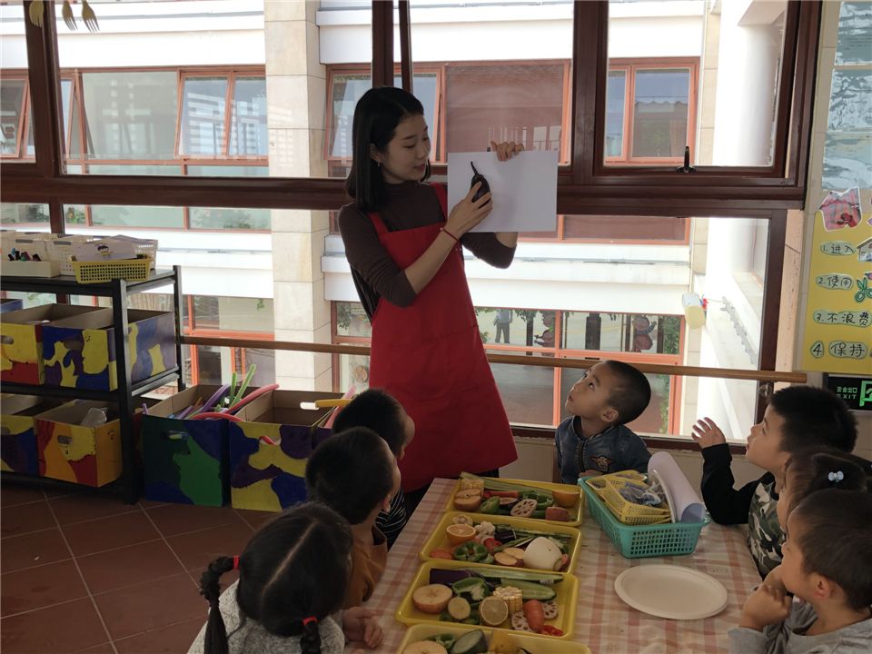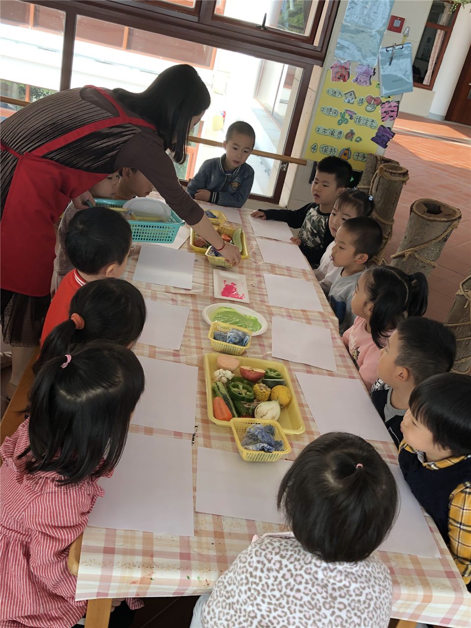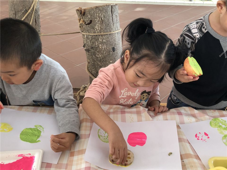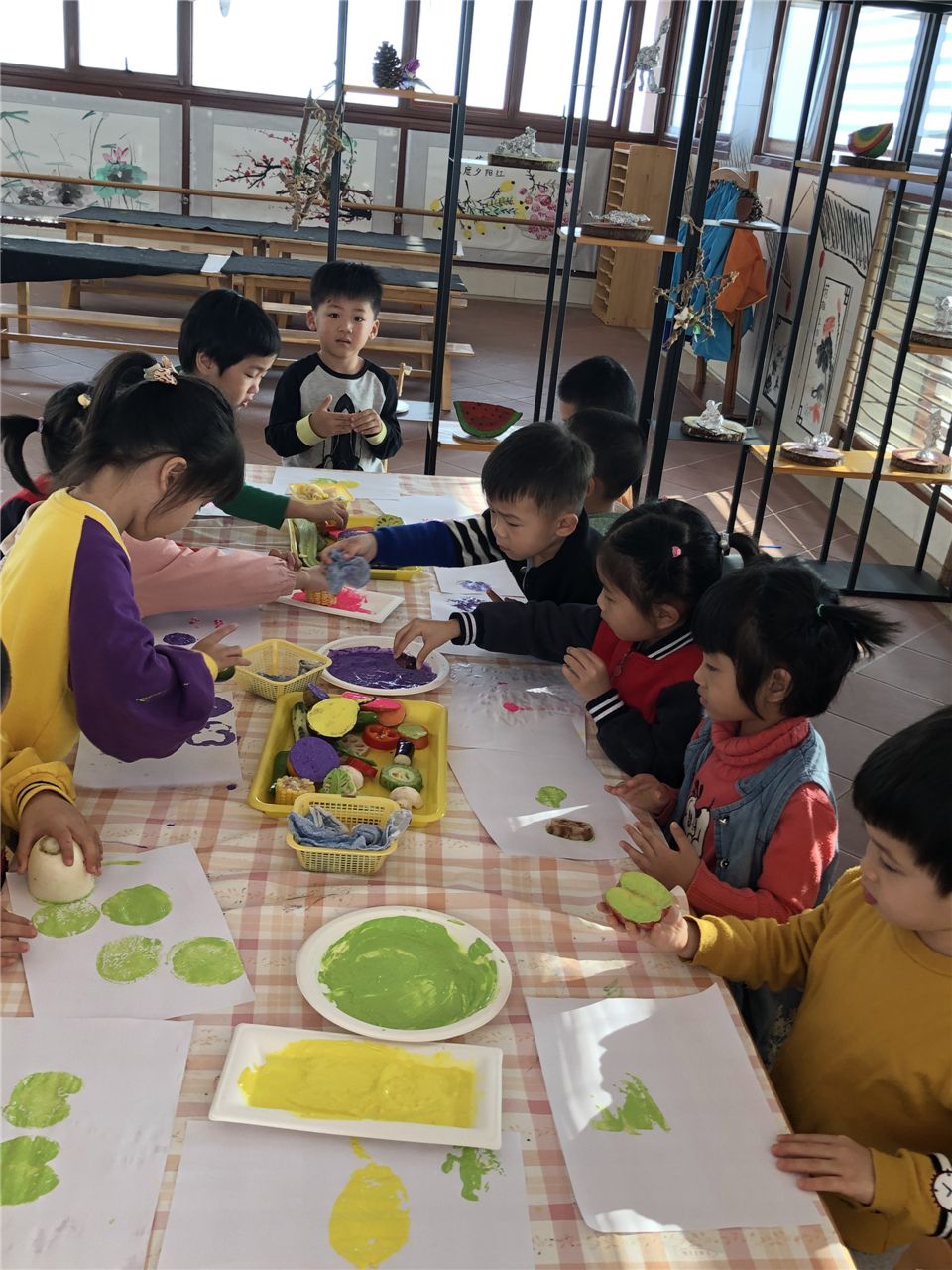 午睡过后,宝贝们迫不及待地吃完水果,带着我们的蔬果来到美劳室,等待他们的是即将到来的一场缤纷多彩的游戏世界。“你们瞧,不同蔬果采用不同的切法呈现出的形状就不一样咯,瞧!我给它们的身体沾上颜料印在纸上呈现出的样子,你们觉得如何呢?”“老师,我觉得茄子切开之后长得像梨子。”“老师,我发现苹果对半切开像蝴蝶的翅膀……”哇,宝贝们的想象力可真美!
