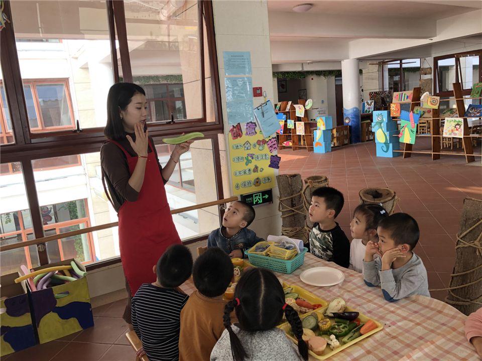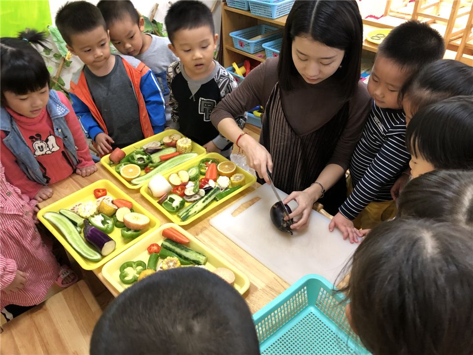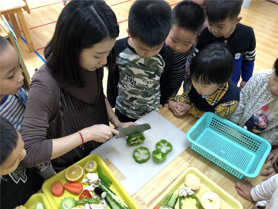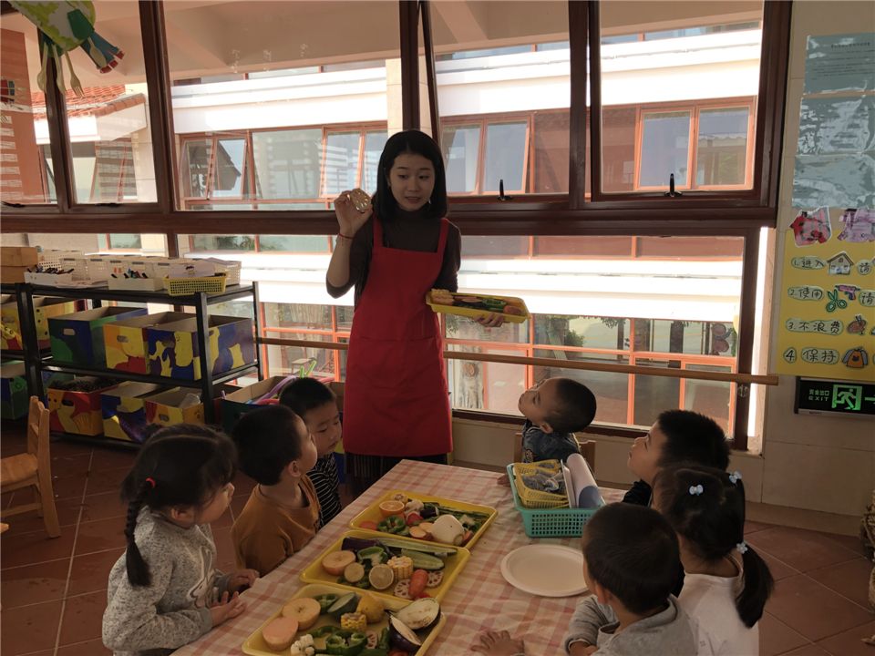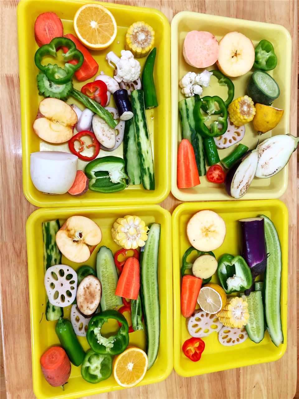 “多多,你瞧,苏老师正在切我们带来的蔬菜水果。”“老师,老师,你切这些蔬菜水果做什么呀?”“宝贝们不着急,下午我们就要和这些蔬果玩游戏啦!”!一盘盘蔬果“出炉”咯!