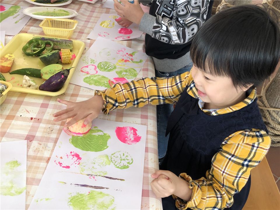 探讨完毕,宝贝们准备动手与我们的蔬果来场亲密的接触。当蔬果沾上多彩的颜料印在纸上的那一刻,宝贝们觉得有趣极了,新鲜又惊讶,还带有一丝小激动。“哇!老师,你瞧,我用青椒印出了一朵小花,可漂亮了。”“老师、老师,还有我,我用花菜印出了一颗小树的模样呢……”一双双小手忙碌得不可开交!