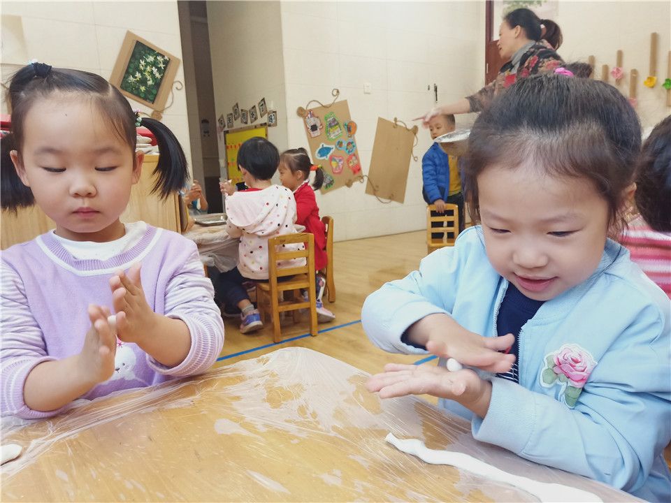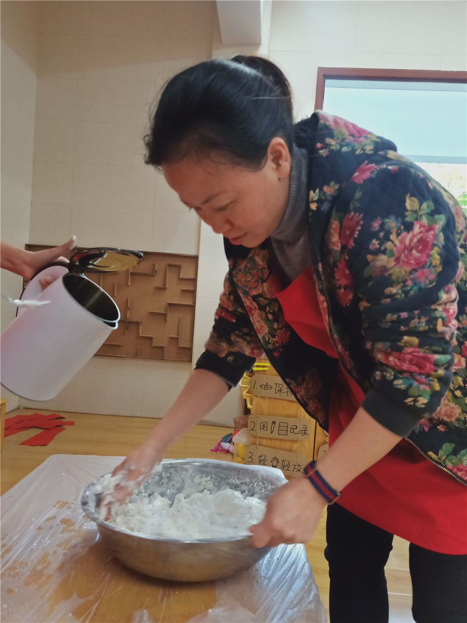 “不,这是糯米粉,我们用来做汤圆的。”“我在家吃过汤圆?”“想不想自己动手做汤圆呢?”“我要我要!”来,看老师慢慢揉面。