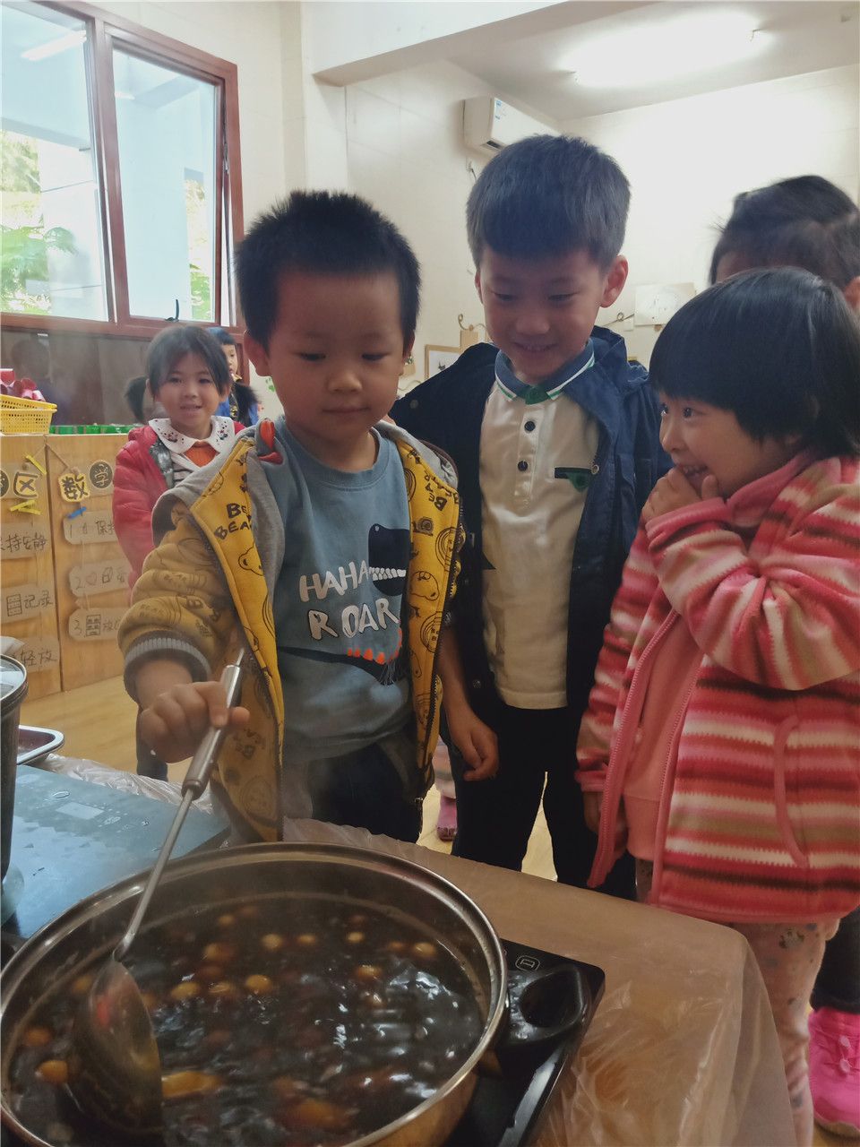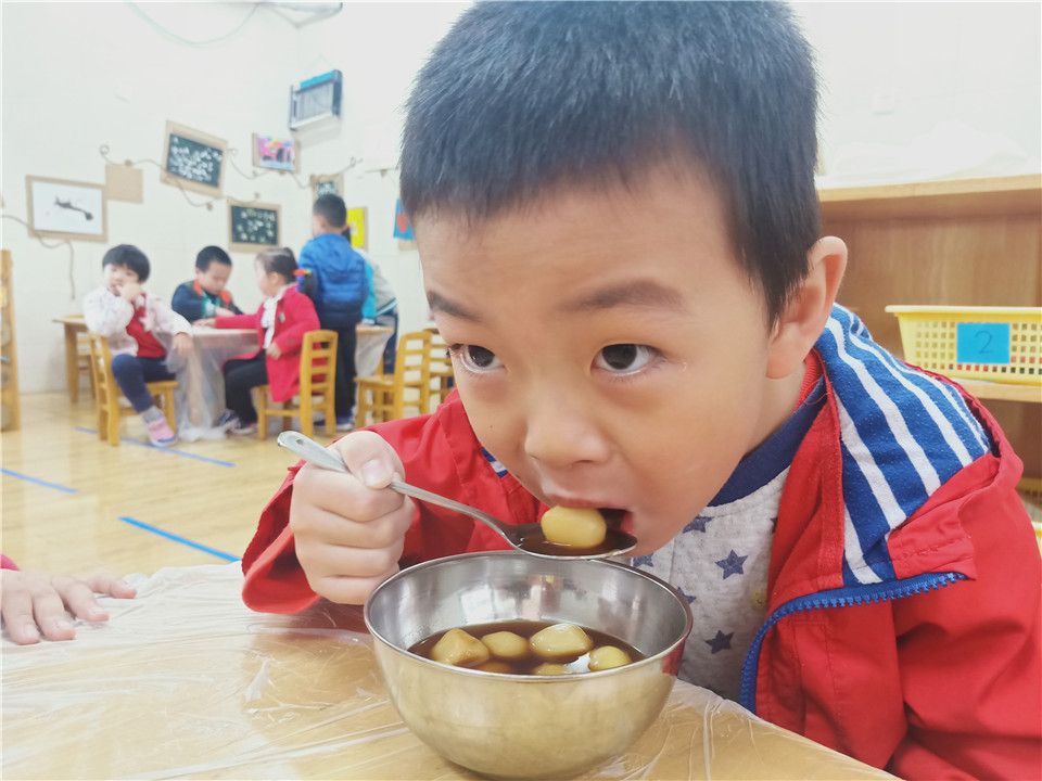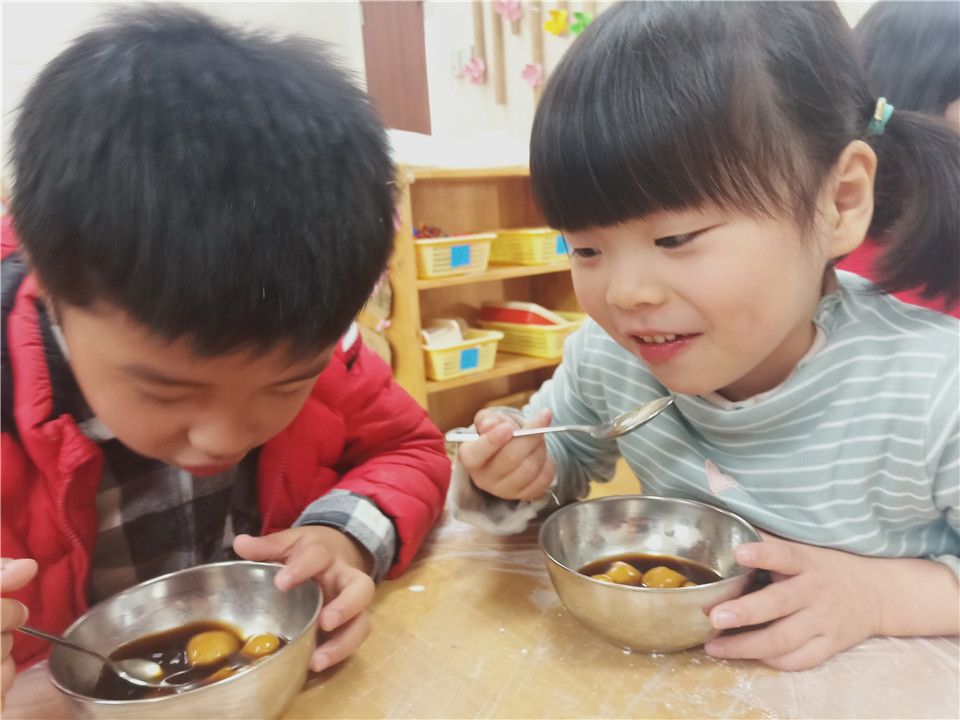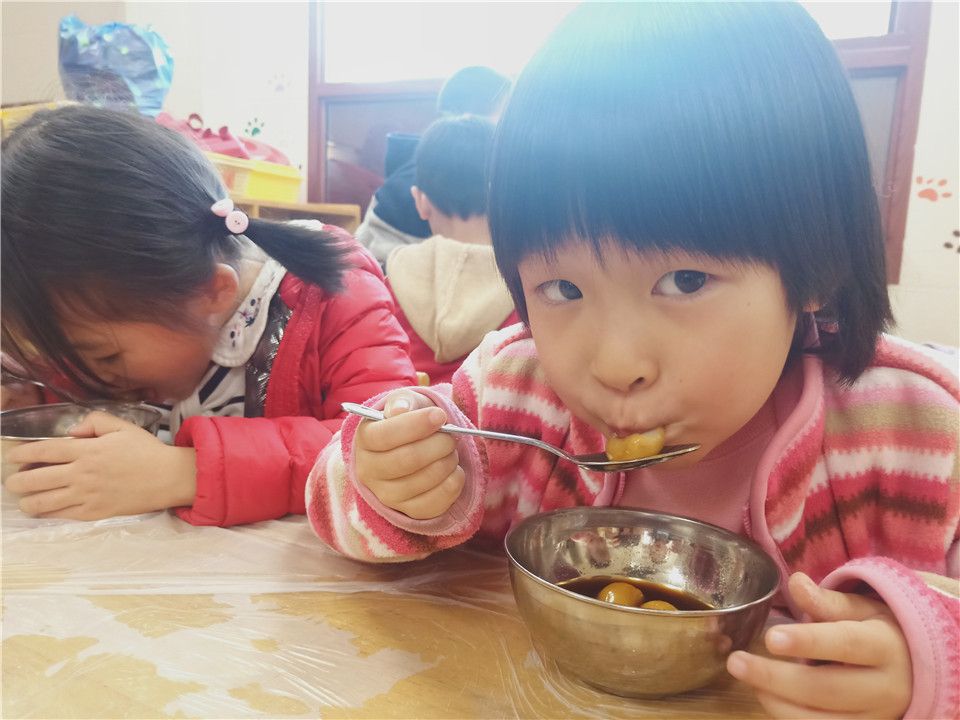 “吃汤圆咯……”大家都来尝一尝,大口大口地开吃了。“哇,真香啊!”“太还吃了!”孩子们品尝着自己做的汤圆, 哈哈,个个都像“小馋猫”,幸福感满满。