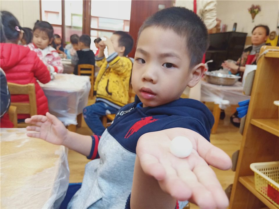 孩子们迫不及待地洗手、卷袖、做起来。瞧孩子们做得多起劲啊,有的小心地团圆;有的互相比较着汤圆的大小……场面其乐融融啊,一个个都像是颇有经验的“老手”,认真的样子是不是萌萌哒的呢?