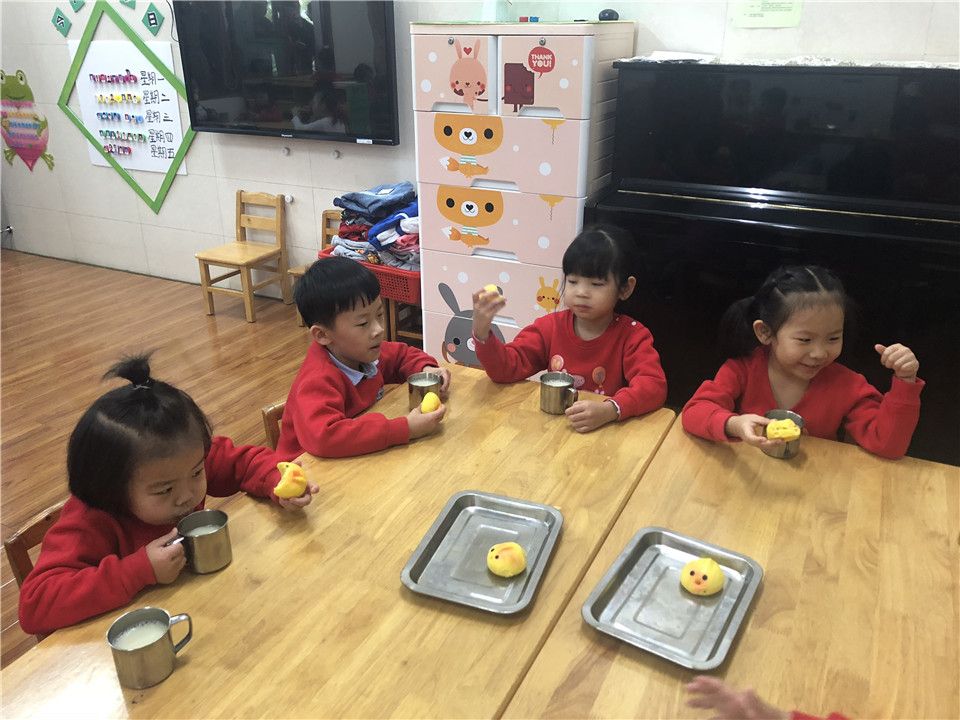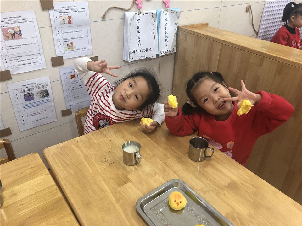 每天老师都给我们准备了美味的早餐呢!爸爸妈妈,我们洗一下手就要去吃早餐咯!