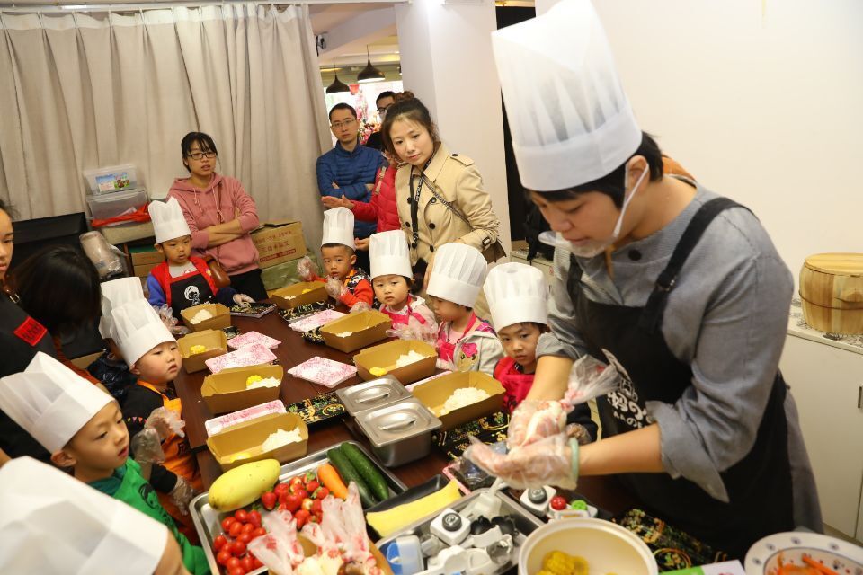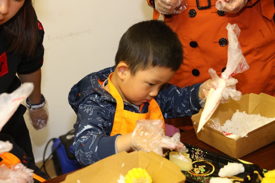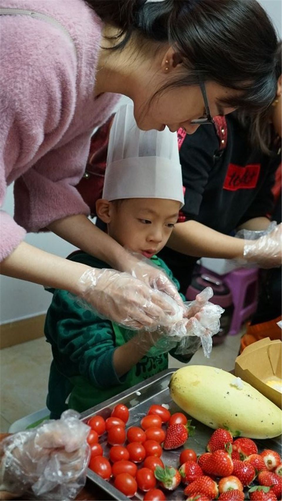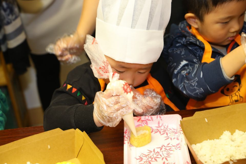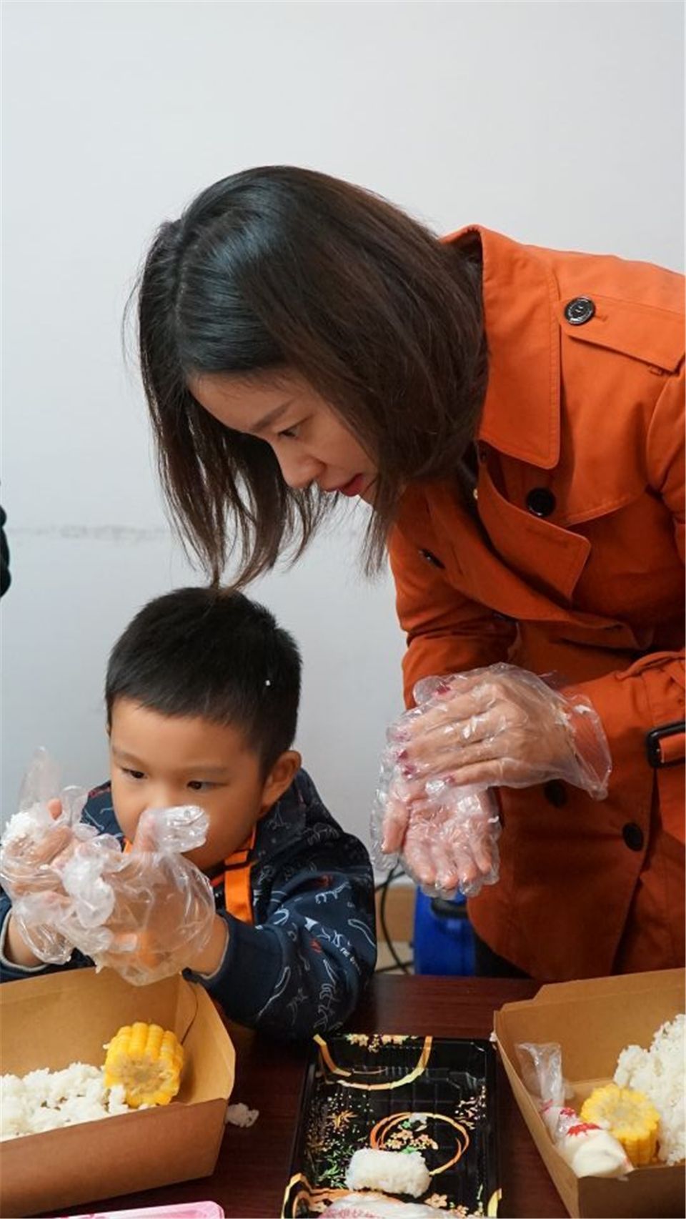 爸爸妈妈们也开心得一起参与到我们的寿司DIY活动中来,你帮我来我帮你,大家互帮互助互相学习,场面真是热闹极了!