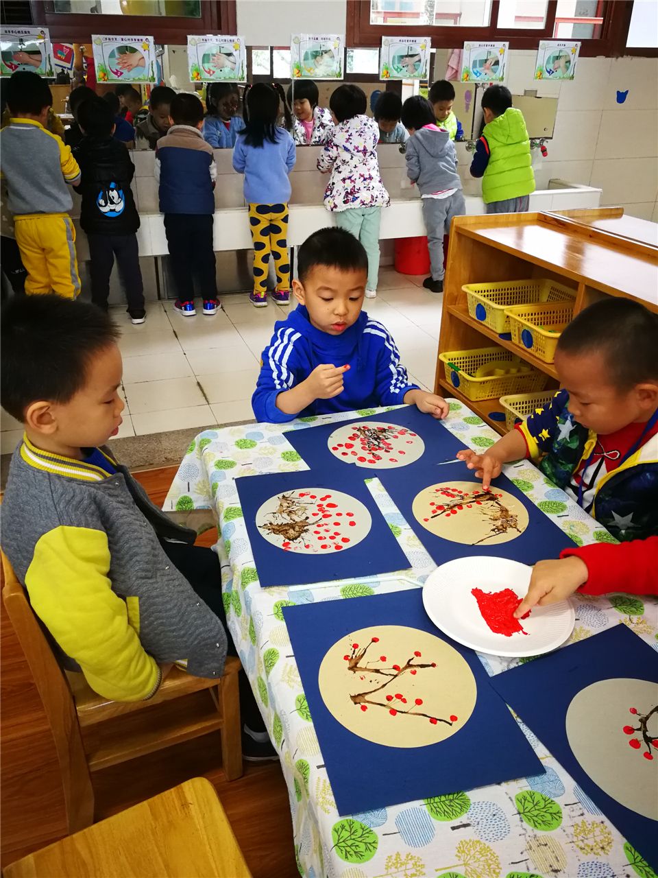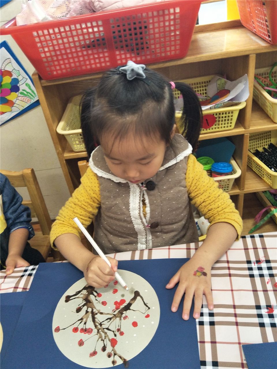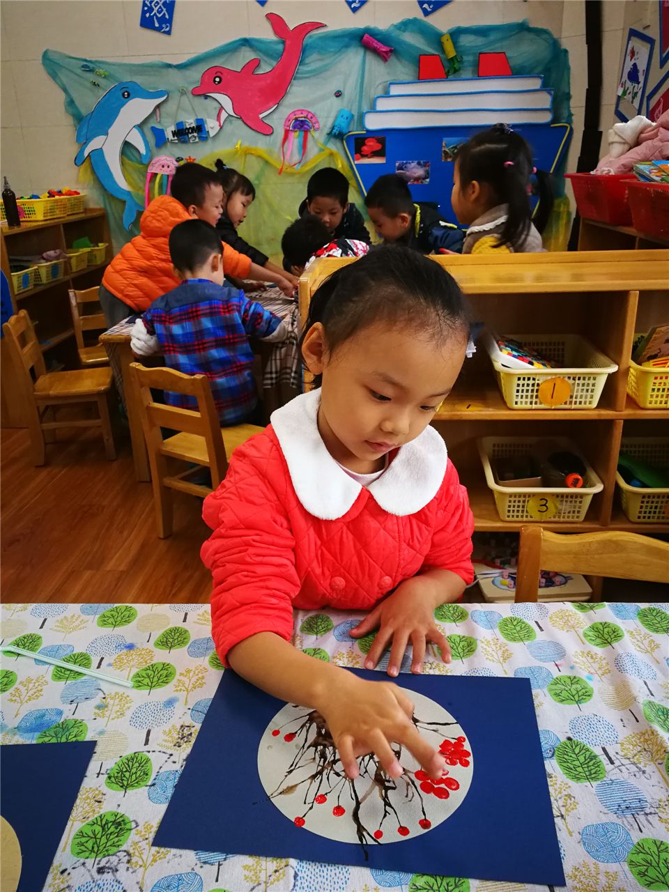 然后,再用我们的食指沾上红色的水粉颜料,一朵一朵印在梅树的枝干上……这样就开了满满一树的红梅了!小朋友们睁着亮晶晶的大眼睛,看得可仔细了!