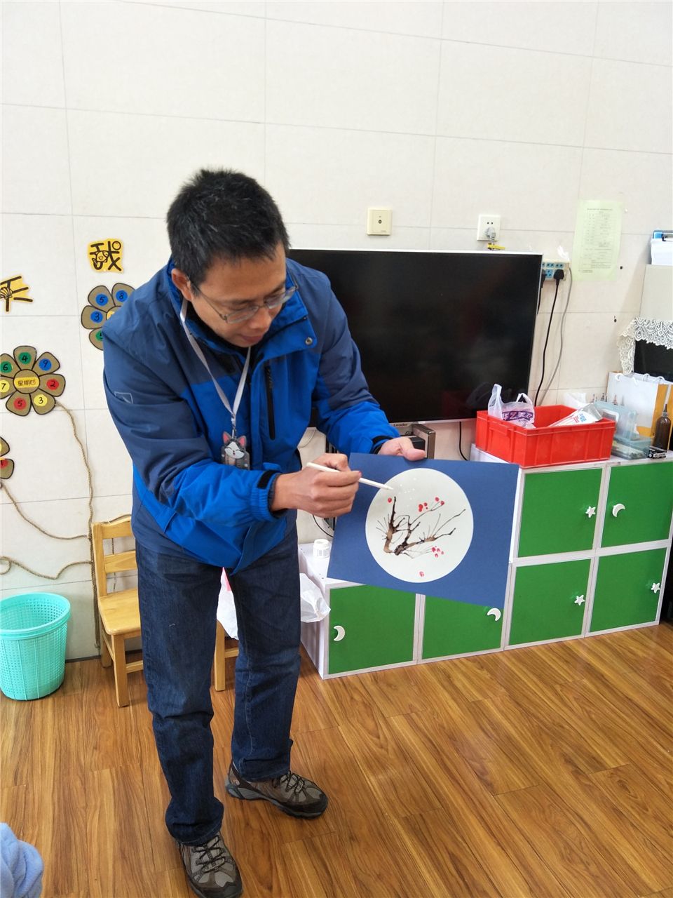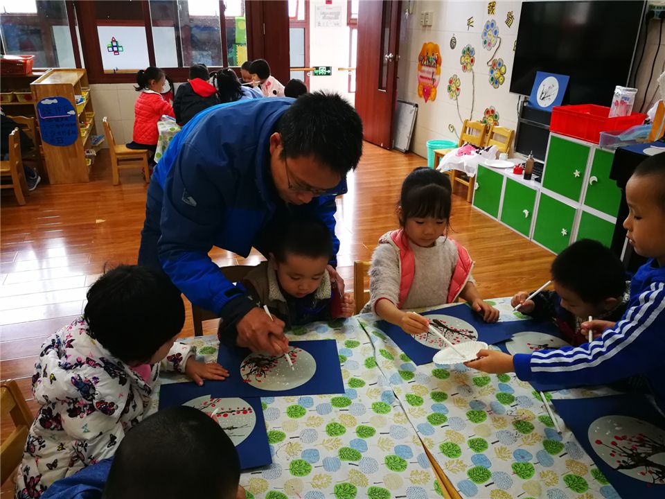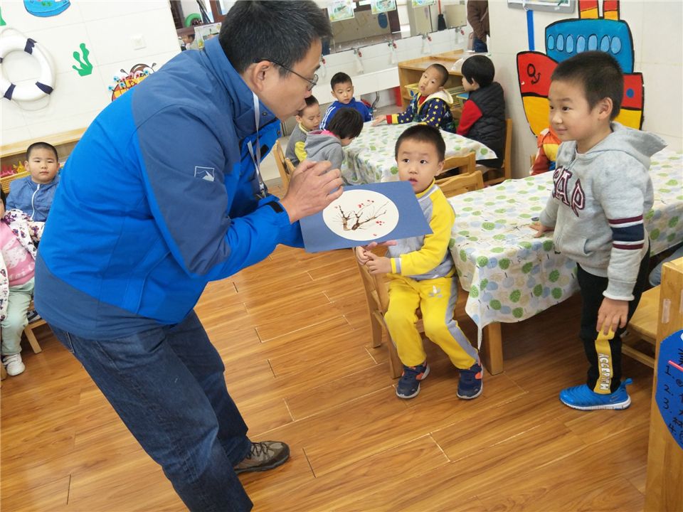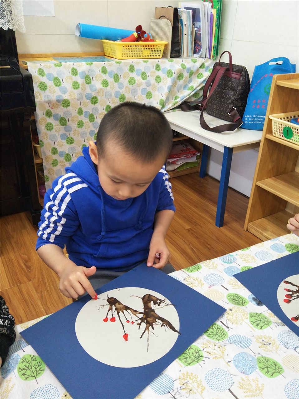 然后,再用我们的食指沾上红色的水粉颜料,一朵一朵印在梅树的枝干上……这样就开了满满一树的红梅了!小朋友们睁着亮晶晶的大眼睛,看得可仔细了!