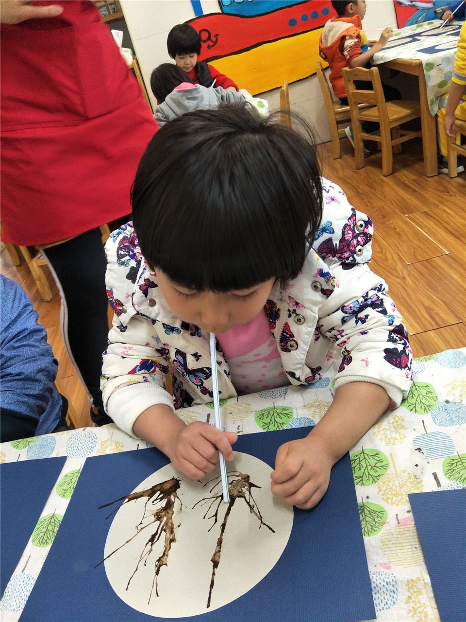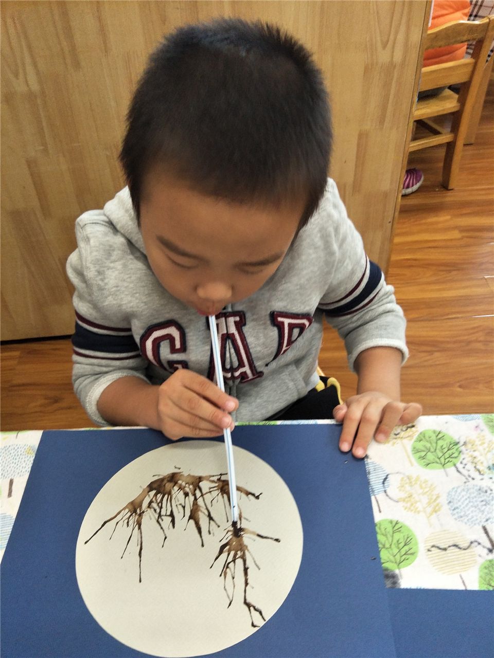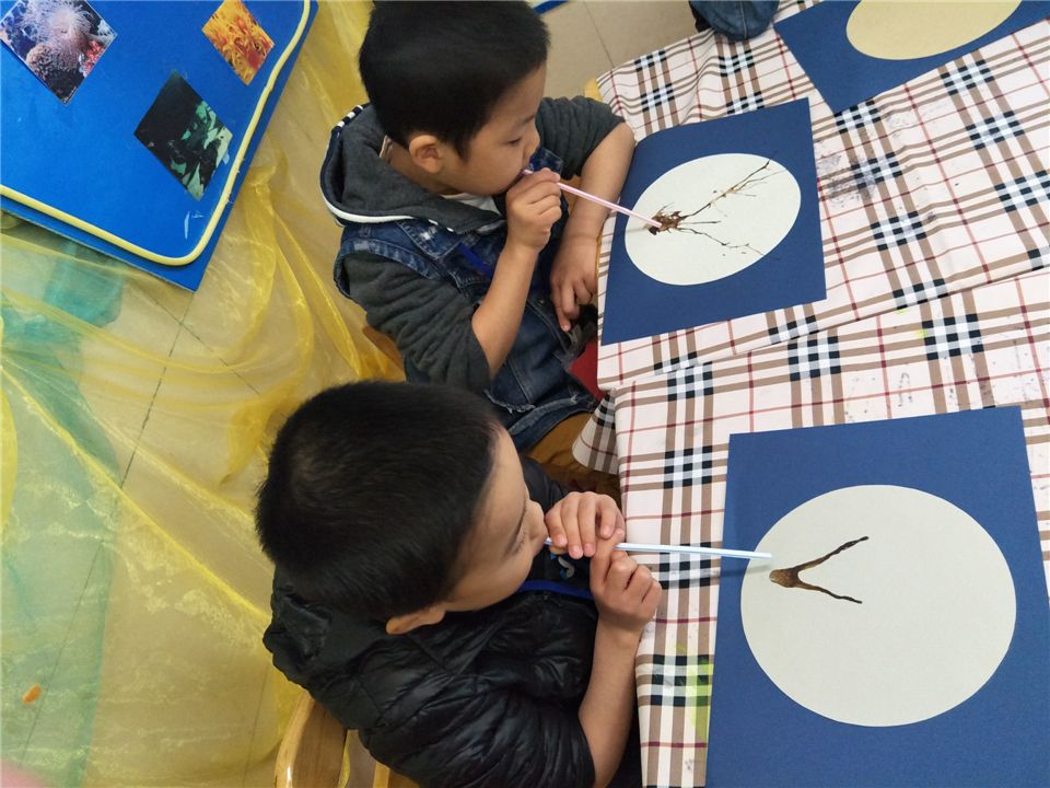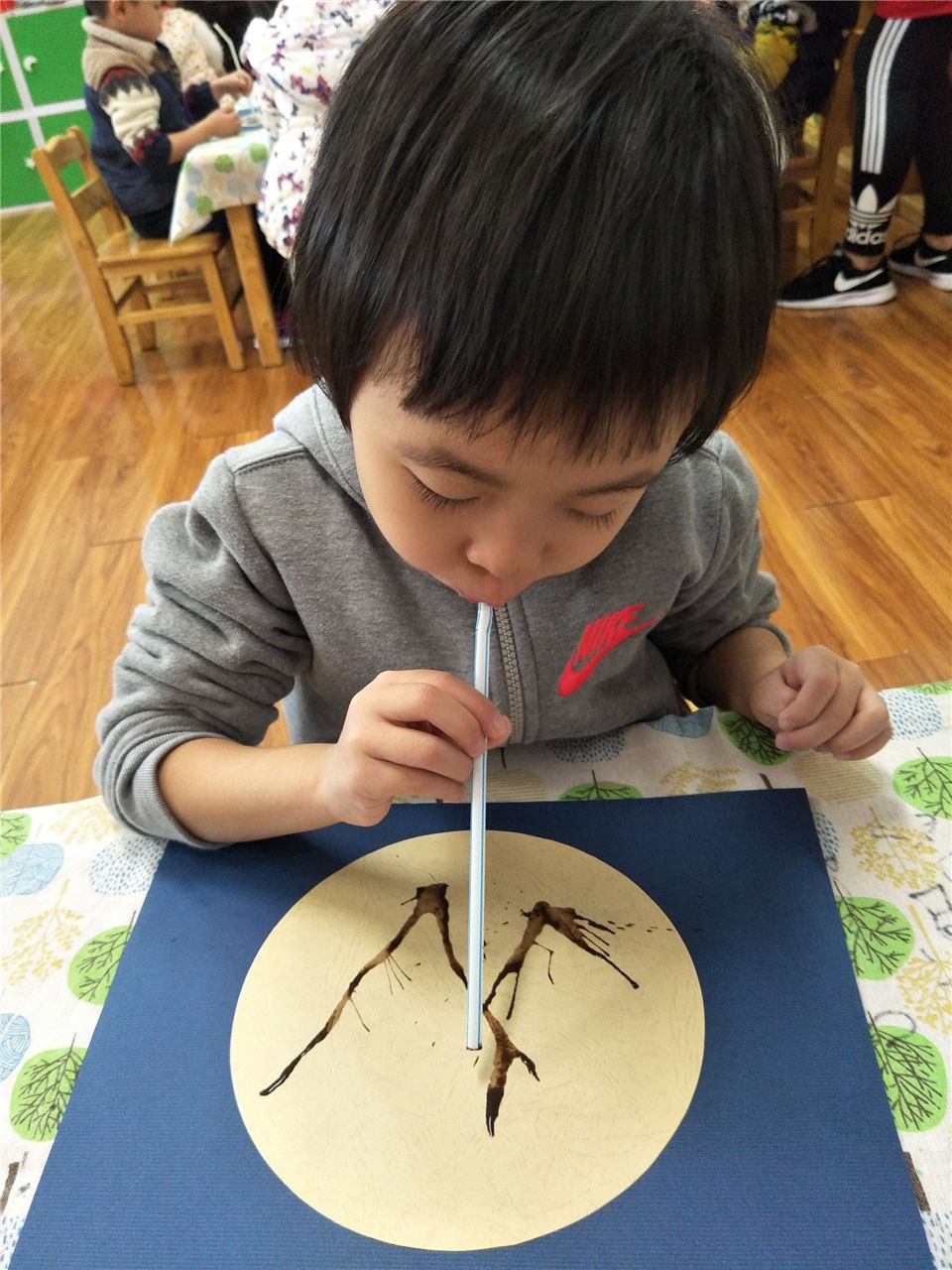 瞧!我们的小朋友们迫不及待、小心翼翼地开始用吸管吹画梅树。
