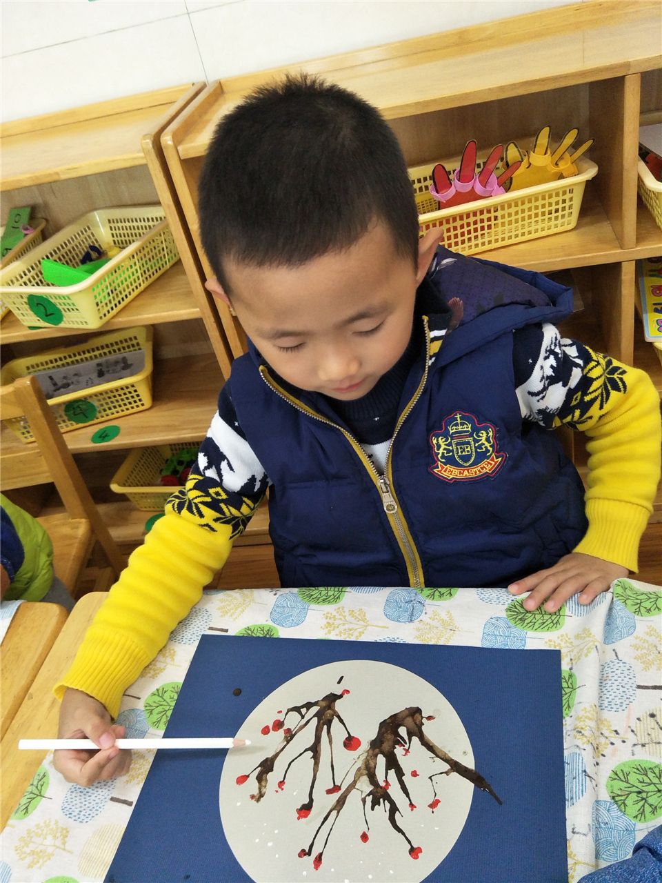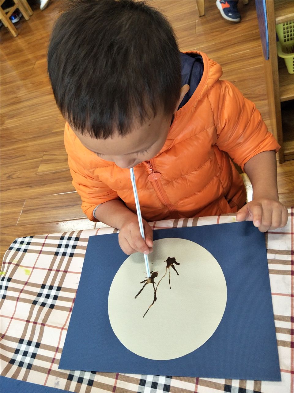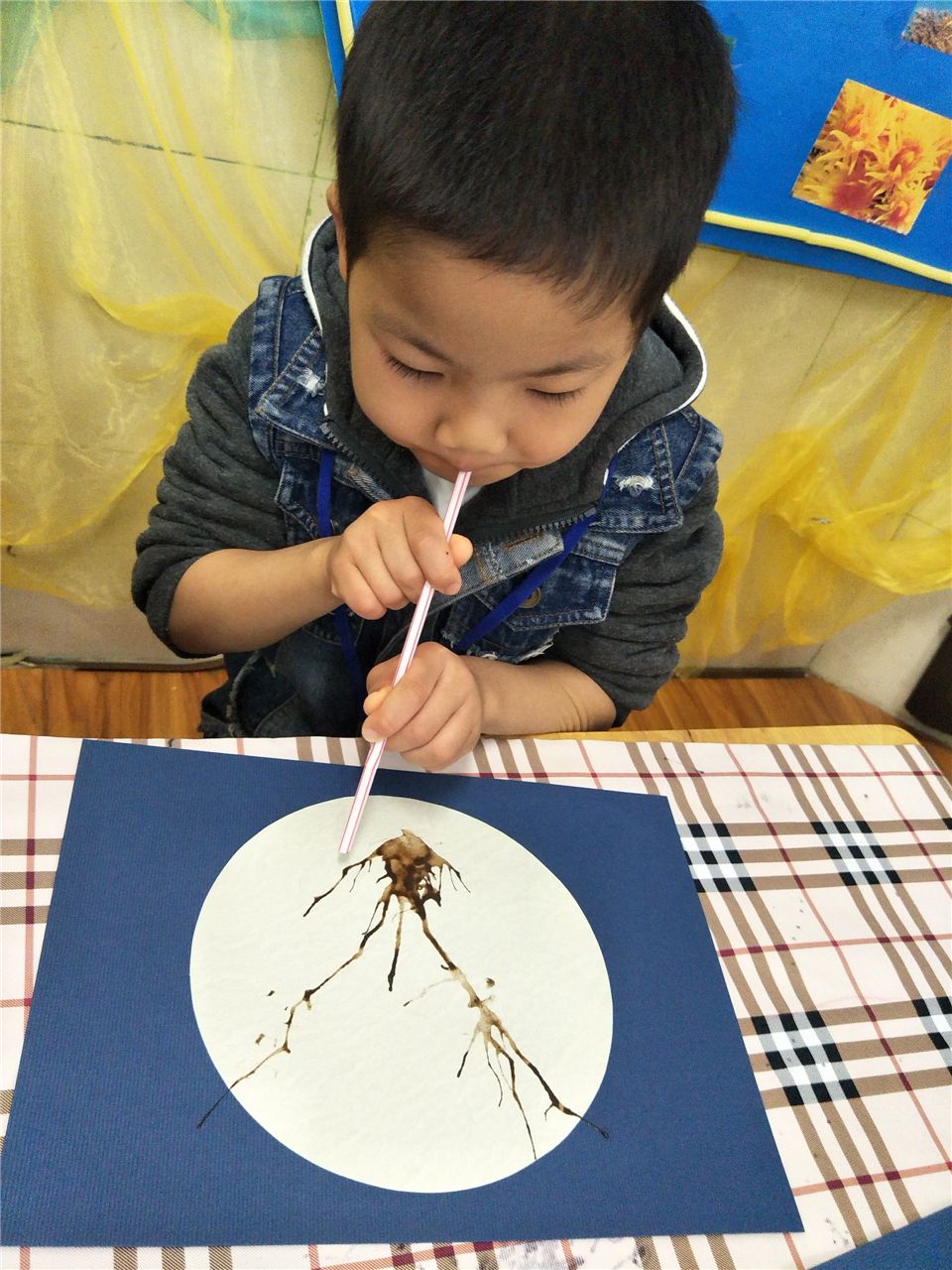 瞧!我们的小朋友们迫不及待、小心翼翼地开始用吸管吹画梅树。